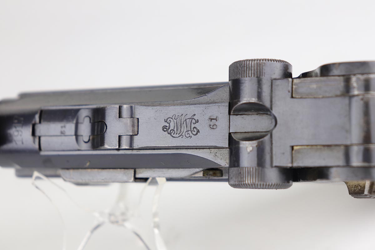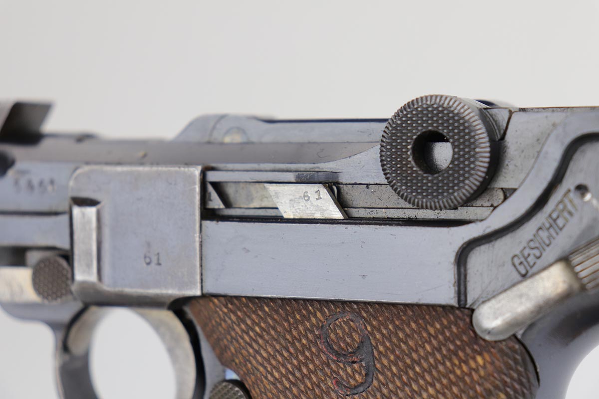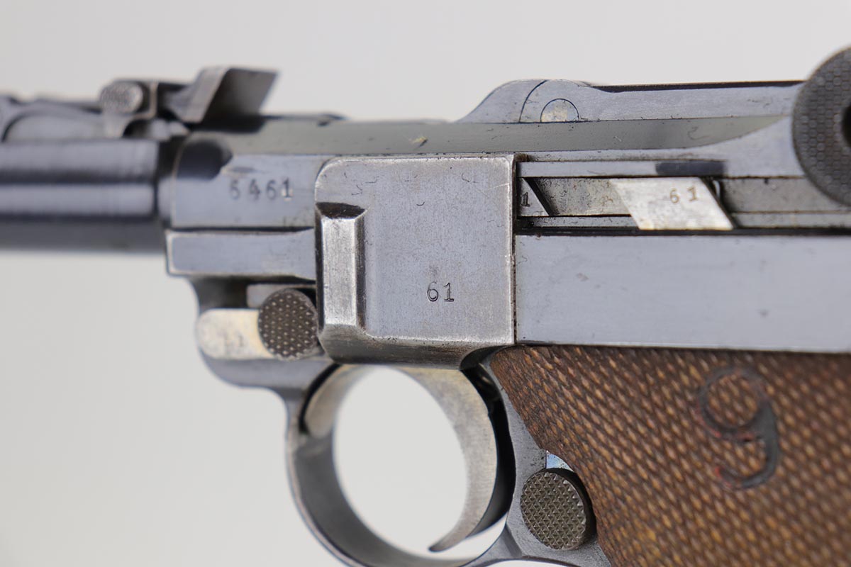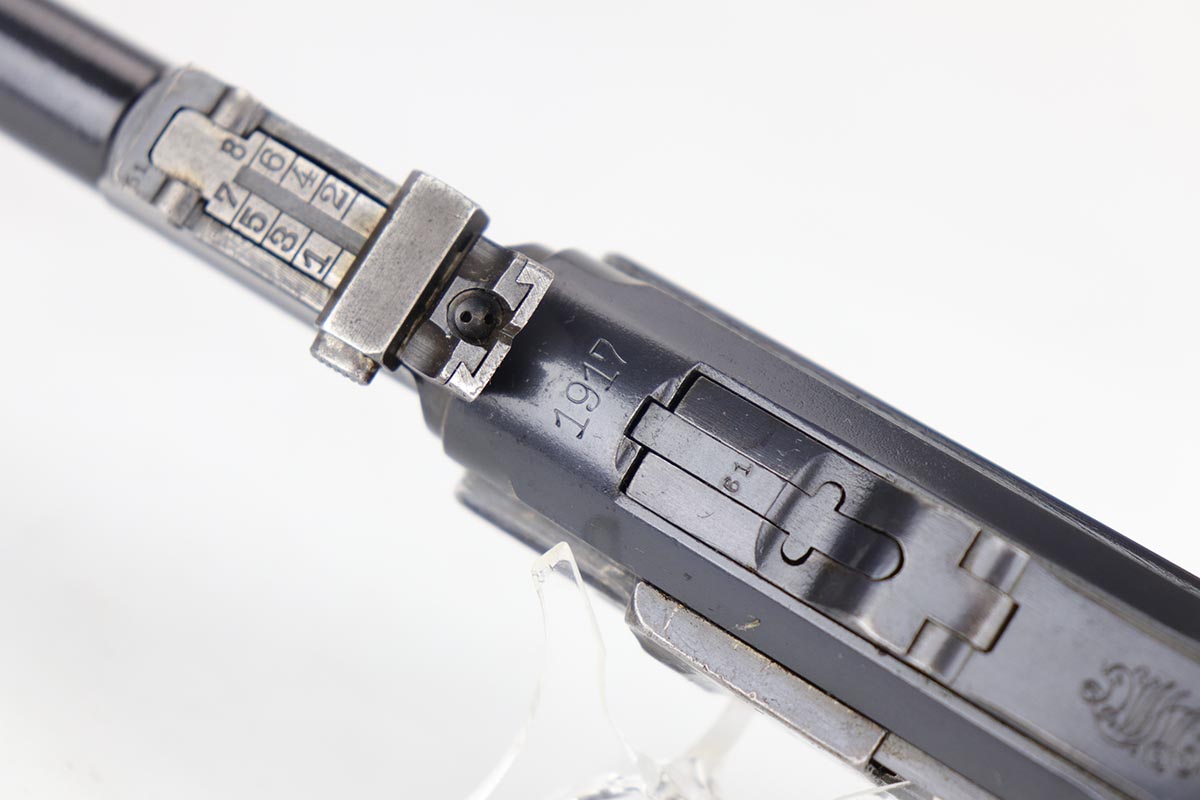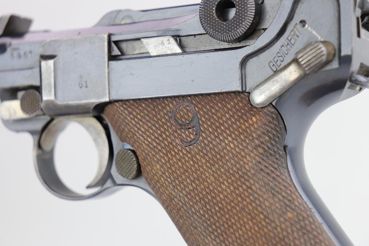 3/3/20 – This is a very nice example of a matching and original DWM Artillery Luger that was made in 1917. The blue rates at 94-95% with most of the wear on the sideplate, but minor finish loss on the muzzle and bottom of front strap, as well. The original matching grips are present, and show some age and handling wear. A previous owner has also embellished them slightly by carving the number ‘9’ into each panel, reminiscent of the ‘Red 9’ Mauser C96 pistols. The small parts retain about 25% of the original straw. Bore has excellent rifling with only minor signs of use. Magazine is period original but mismatched.