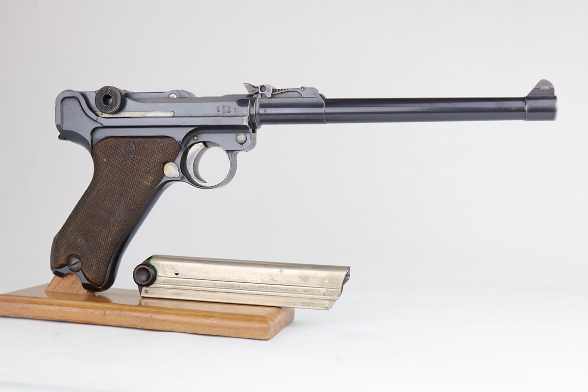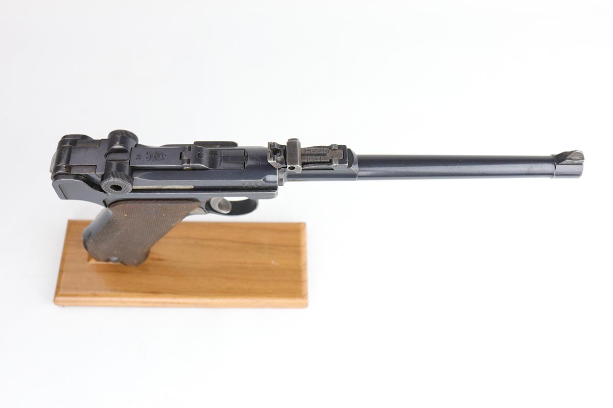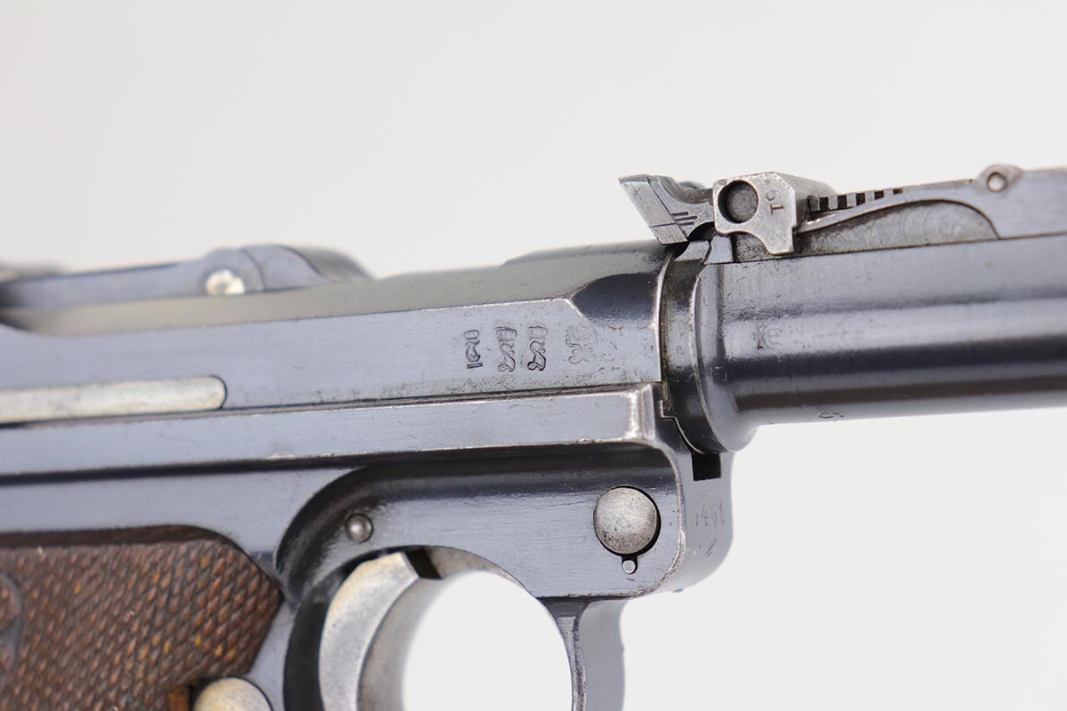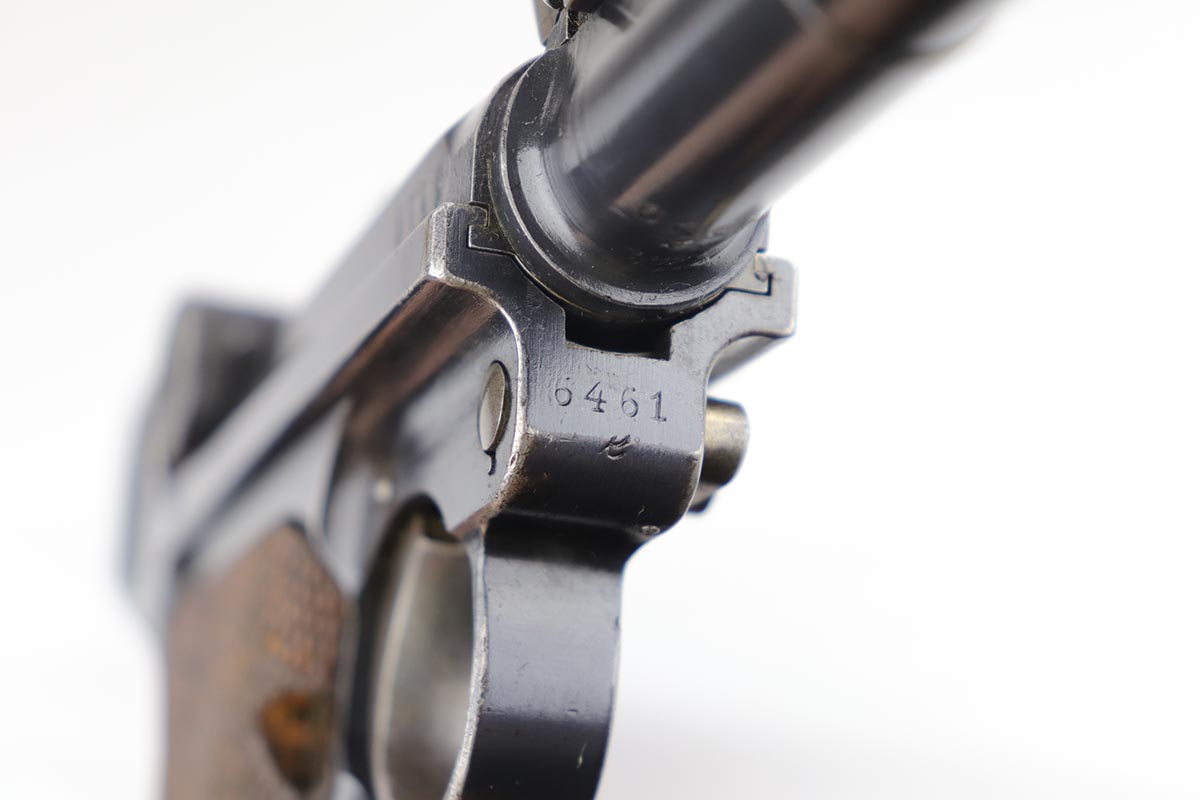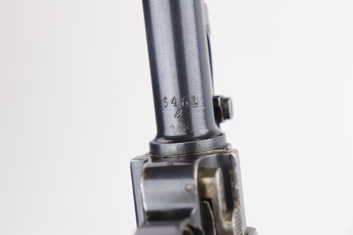 3/3/20 – This is a very nice example of a matching and original DWM Artillery Luger that was made in 1917. The blue rates at 94-95% with most of the wear on the sideplate, but minor finish loss on the muzzle and bottom of front strap, as well. The original matching grips are present, and show some age and handling wear. A previous owner has also embellished them slightly by carving the number ‘9’ into each panel, reminiscent of the ‘Red 9’ Mauser C96 pistols. The small parts retain about 25% of the original straw. Bore has excellent rifling with only minor signs of use. Magazine is period original but mismatched.