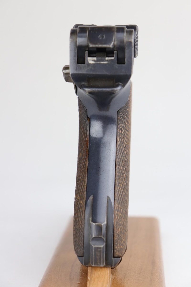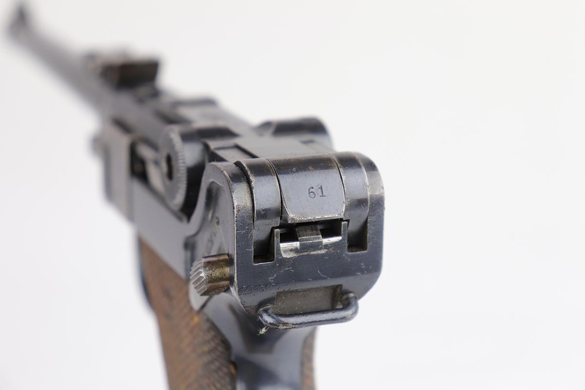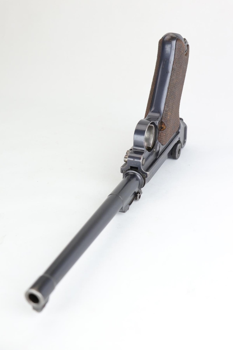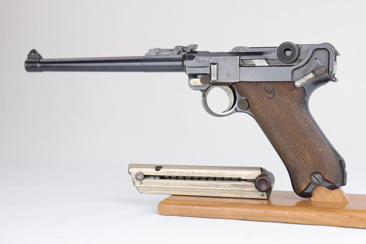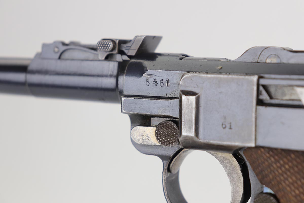 3/3/20 – This is a very nice example of a matching and original DWM Artillery Luger that was made in 1917. The blue rates at 94-95% with most of the wear on the sideplate, but minor finish loss on the muzzle and bottom of front strap, as well. The original matching grips are present, and show some age and handling wear. A previous owner has also embellished them slightly by carving the number ‘9’ into each panel, reminiscent of the ‘Red 9’ Mauser C96 pistols. The small parts retain about 25% of the original straw. Bore has excellent rifling with only minor signs of use. Magazine is period original but mismatched.