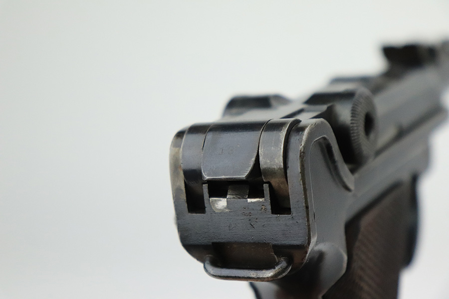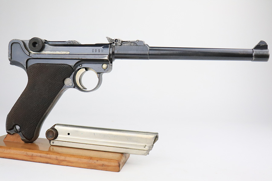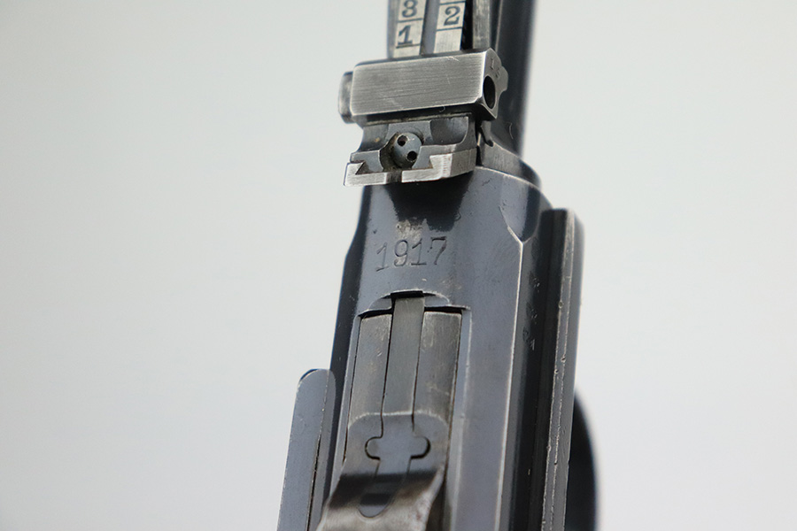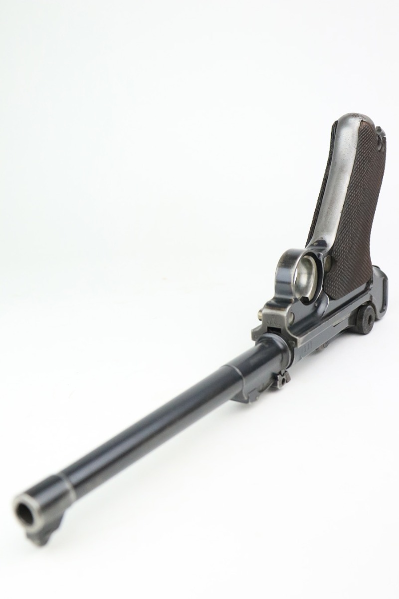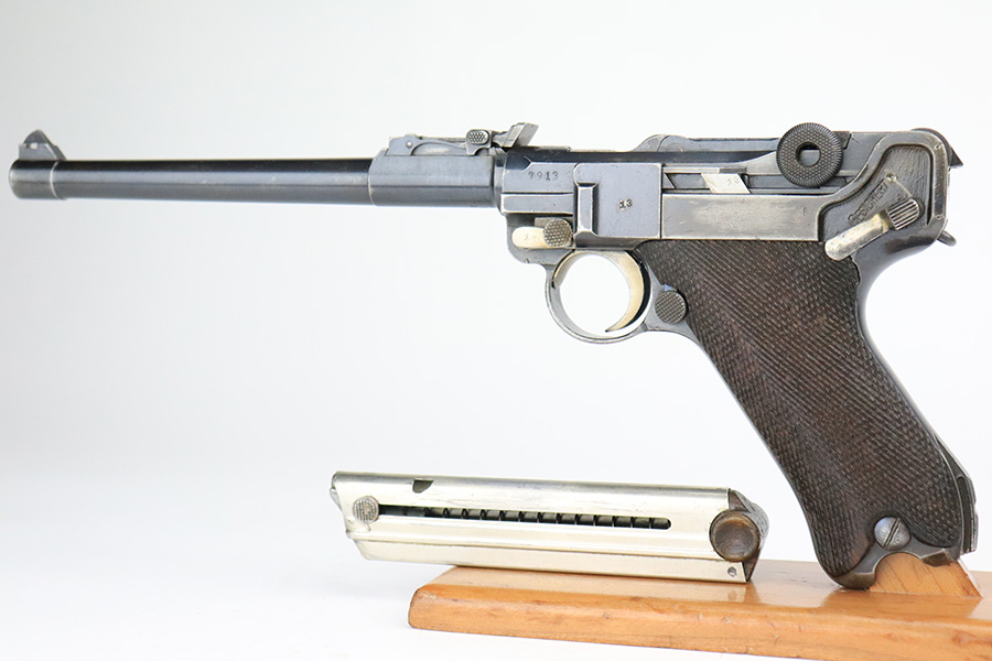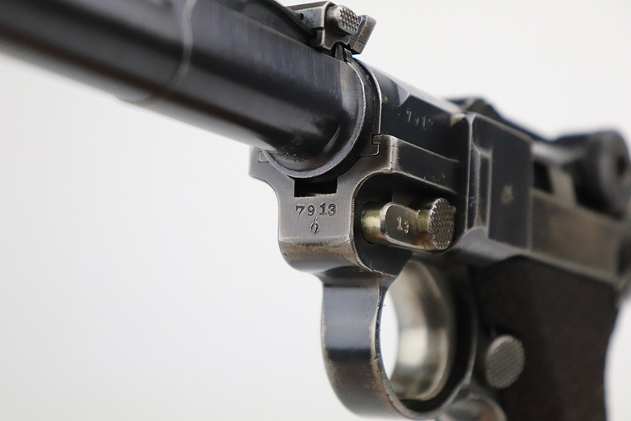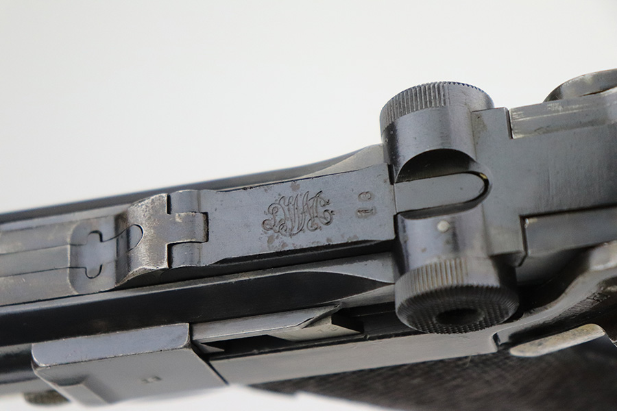 6/8/22 – This is a nice example of a DWM Artillery Luger issued to the Imperial German military in 1917. It is all matching and has the proper Imperial military proofs. It has retained roughly 70% of its original finish. The majority of the bluing loss is on the front strap, where there is virtually no finish. Noticeable wear and light brown patina on the left side of the frame. Areas of minor wear on the side plate, side rails, and on the back strap. Hints of minor thinning along the barrel. Comes with mismatched wood grips with minor bruising and a period-correct but mismatched magazine. The bore has good rifling with minor pin-pricking throughout.