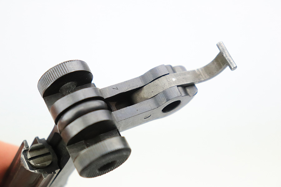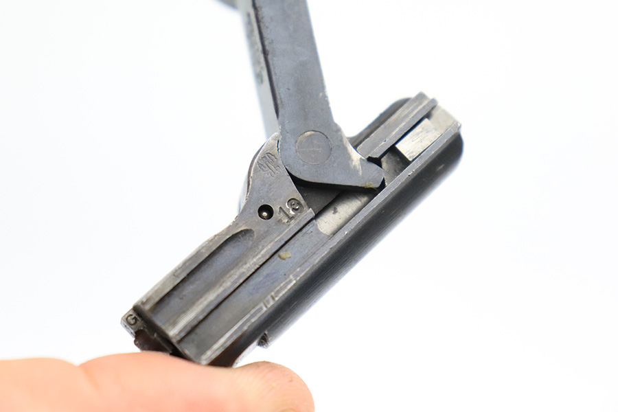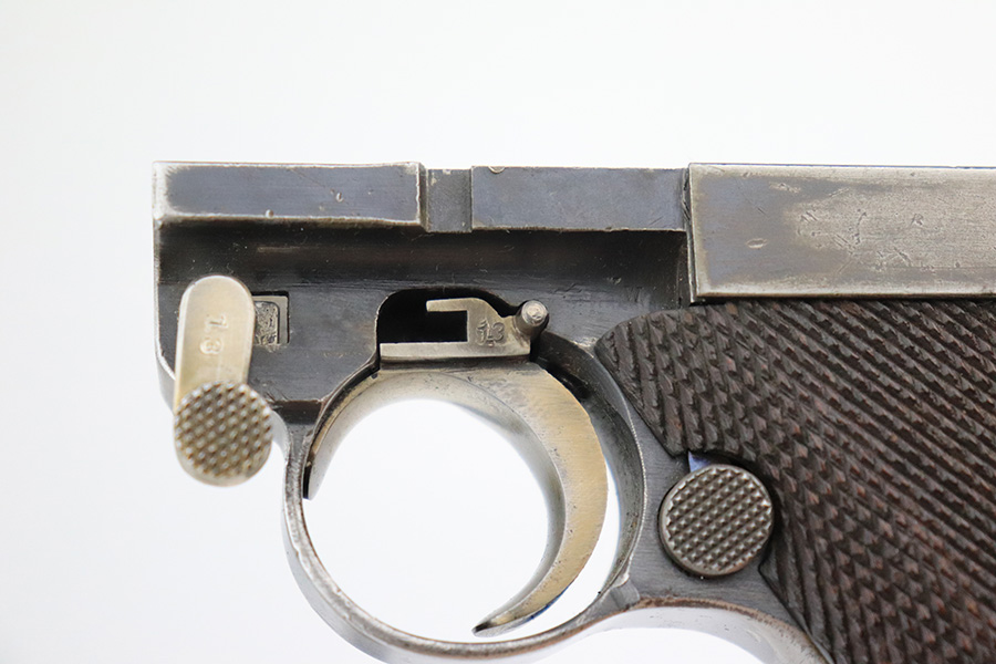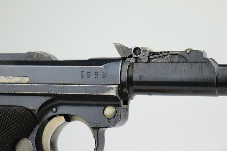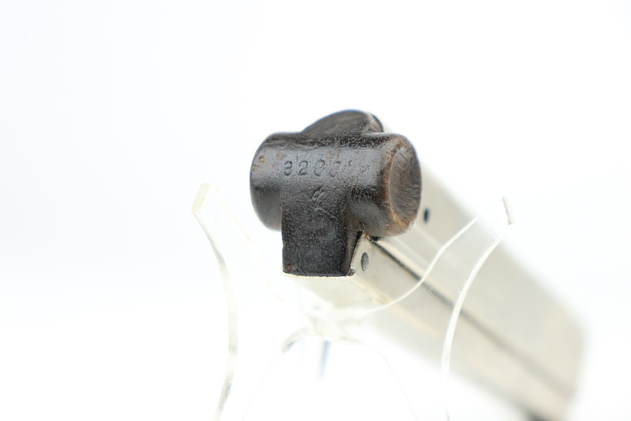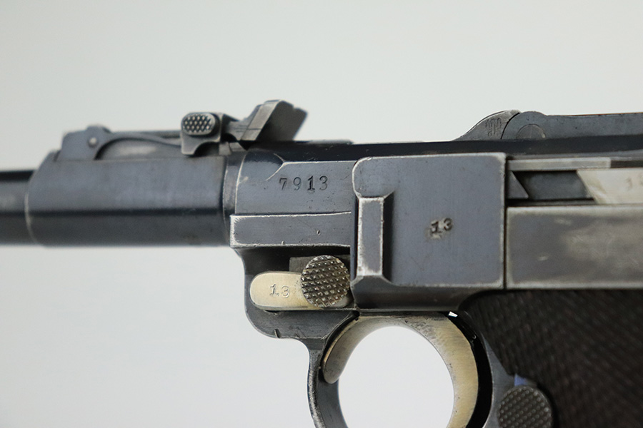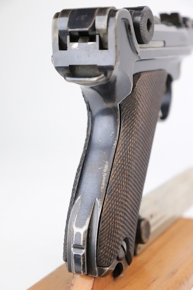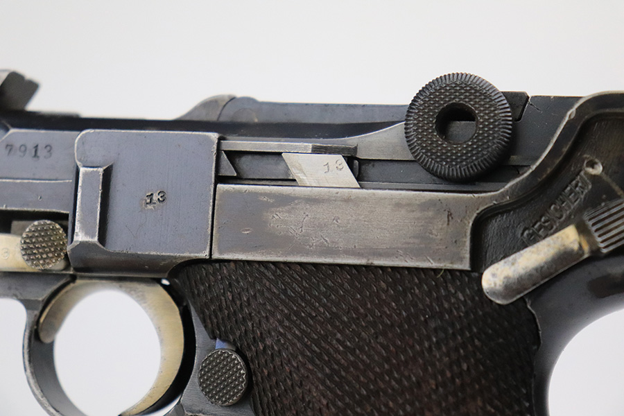 6/8/22 – This is a nice example of a DWM Artillery Luger issued to the Imperial German military in 1917. It is all matching and has the proper Imperial military proofs. It has retained roughly 70% of its original finish. The majority of the bluing loss is on the front strap, where there is virtually no finish. Noticeable wear and light brown patina on the left side of the frame. Areas of minor wear on the side plate, side rails, and on the back strap. Hints of minor thinning along the barrel. Comes with mismatched wood grips with minor bruising and a period-correct but mismatched magazine. The bore has good rifling with minor pin-pricking throughout.