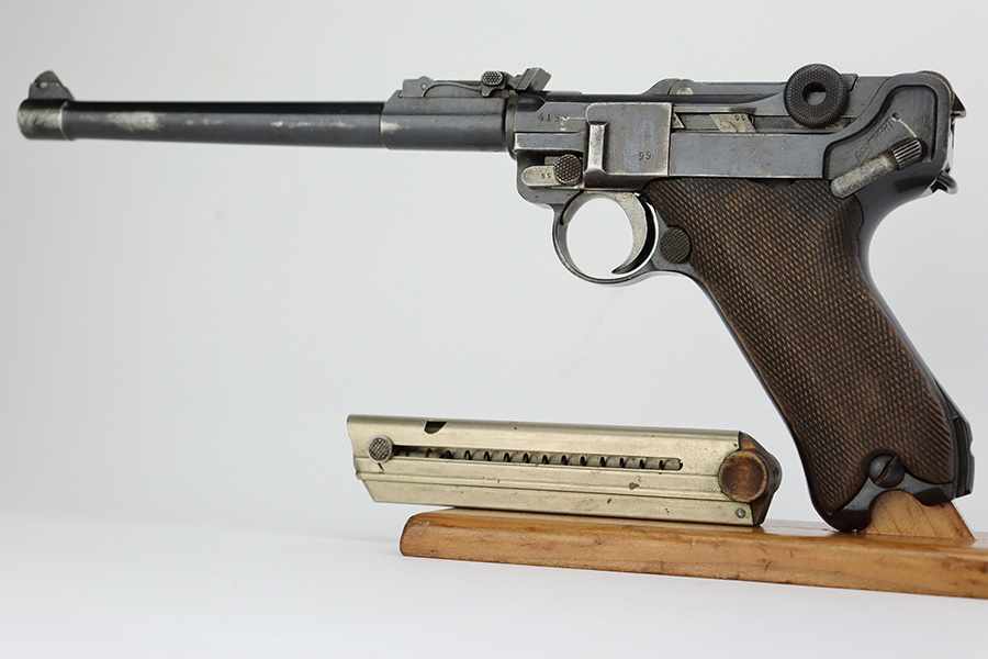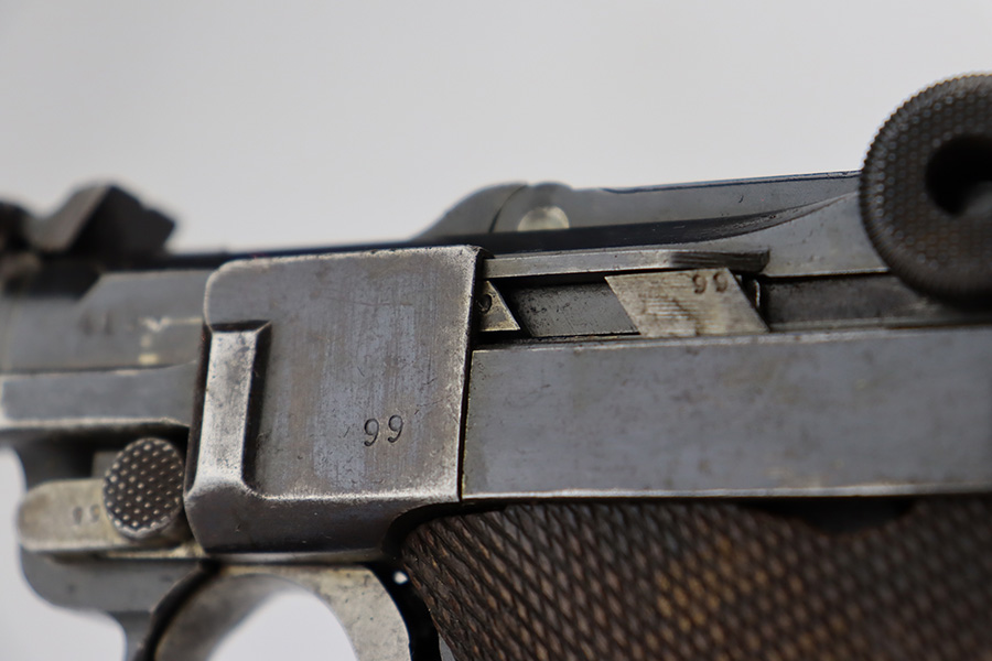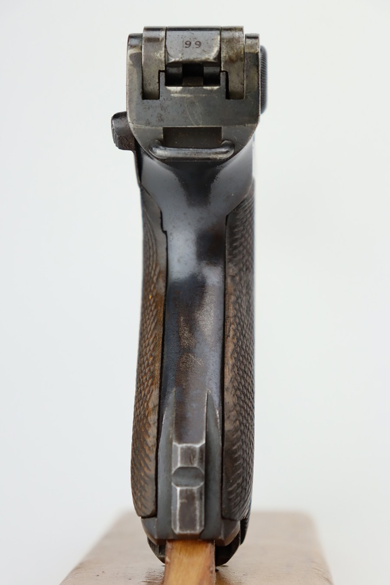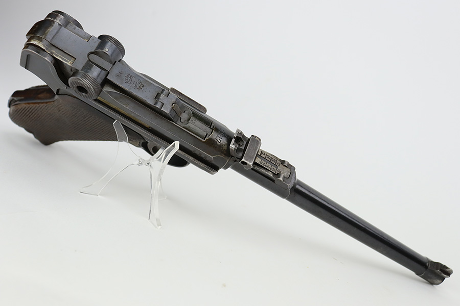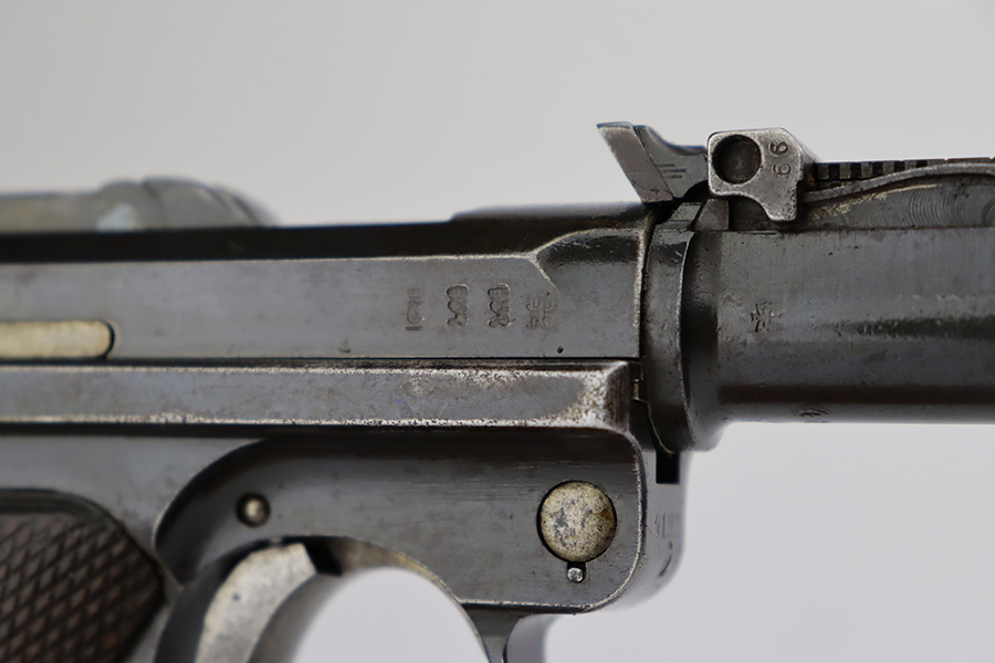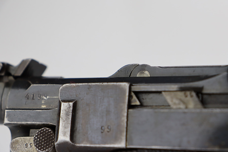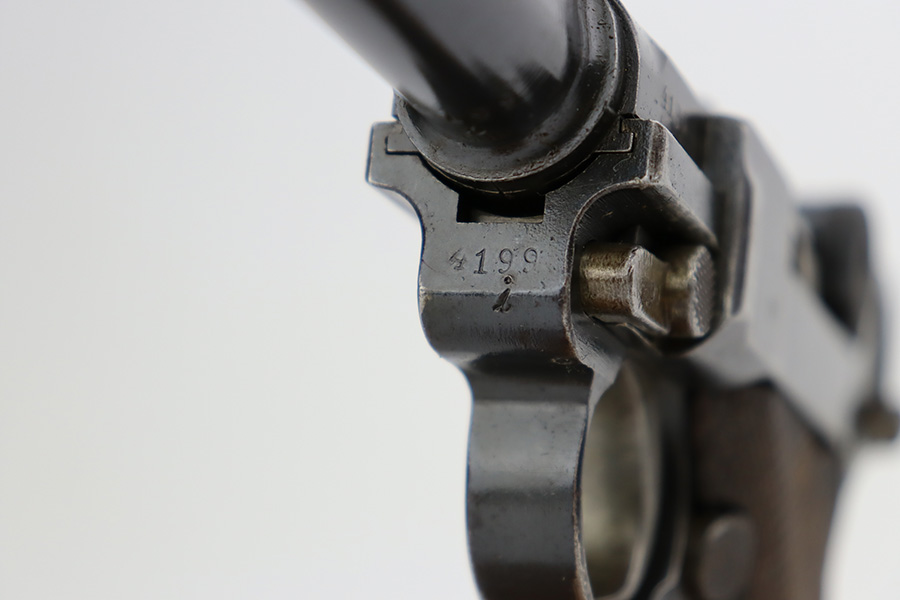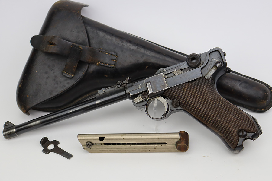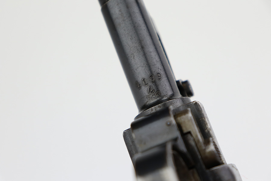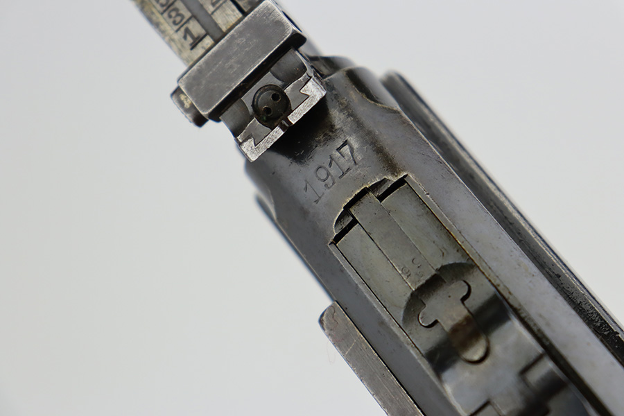 8/2/23 – This is a nice example of a DWM Artillery Luger issued to the Imperial German military in 1917. It is all matching with the proper Imperial military acceptance proofs. It comes as a rig with a 1917-dated holster, a blank tool, and a mismatched but period-correct magazine. The holster is fairly worn and is missing its belt loops, the top portion of the closure strap, and the lift strap. Some stitching missing from the loop on the top flap. The gun itself has retained roughly 85% of its original finish. There is wear around the muzzle, on the side plate, and on the side rails. Areas of spotty wear along the left side of the barrel and on the grip straps. Areas of light spotty oxidation throughout and some very minor pin-pricking here and there. Fitted with mismatched wood grips – some bruising on the right side and a small chip on the top edge of the left panel. The rifling in the bore is a bit worn with pitting throughout.