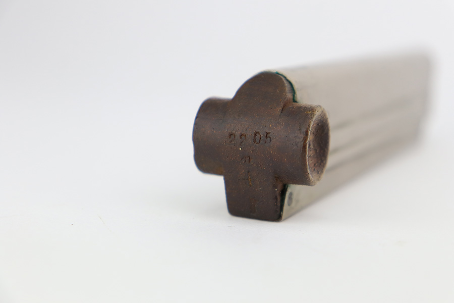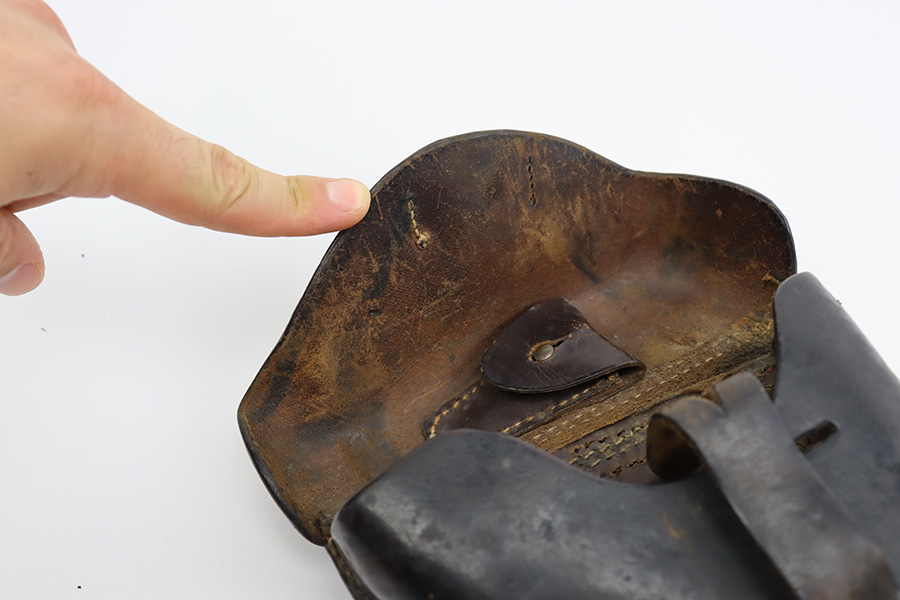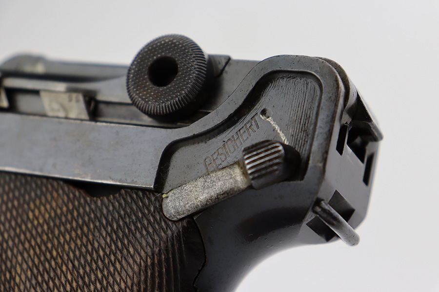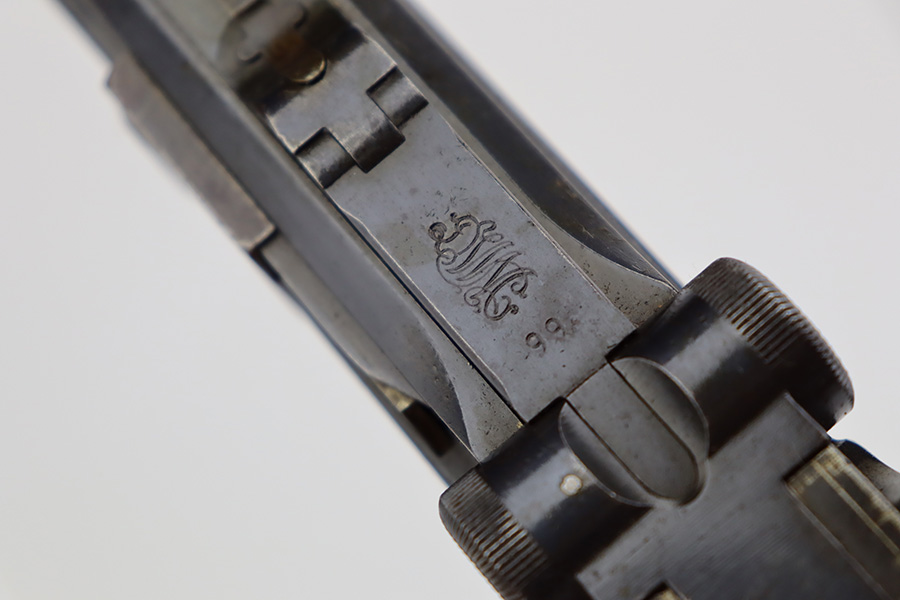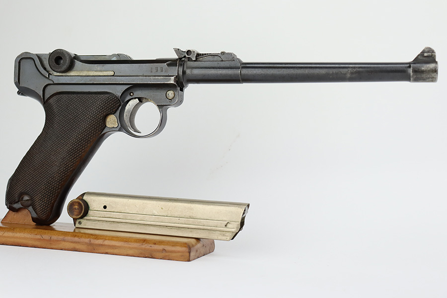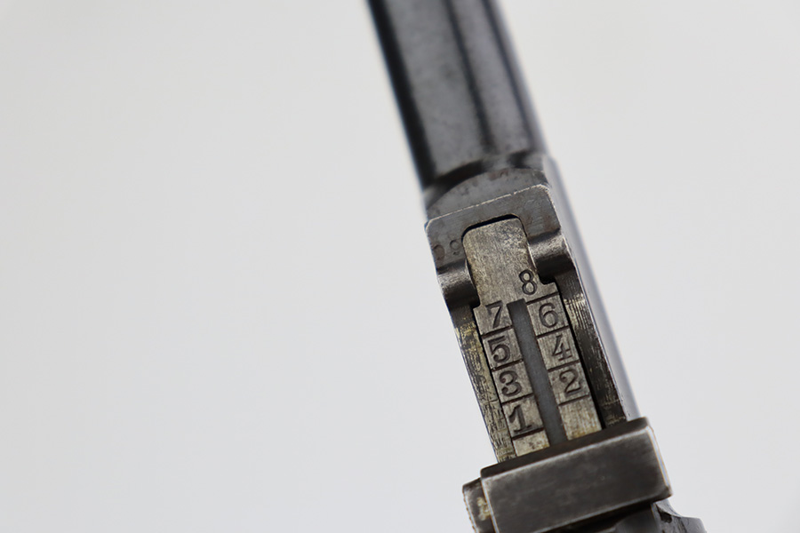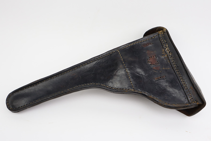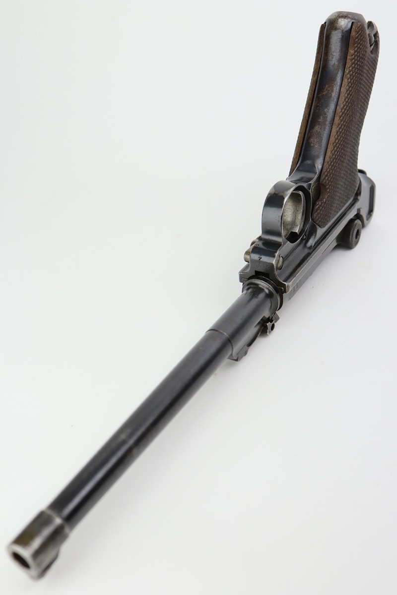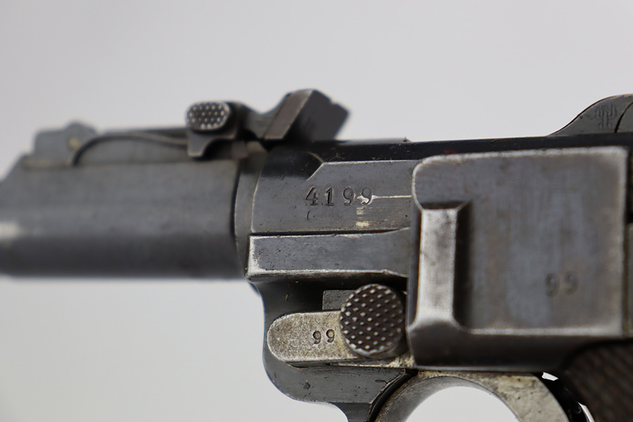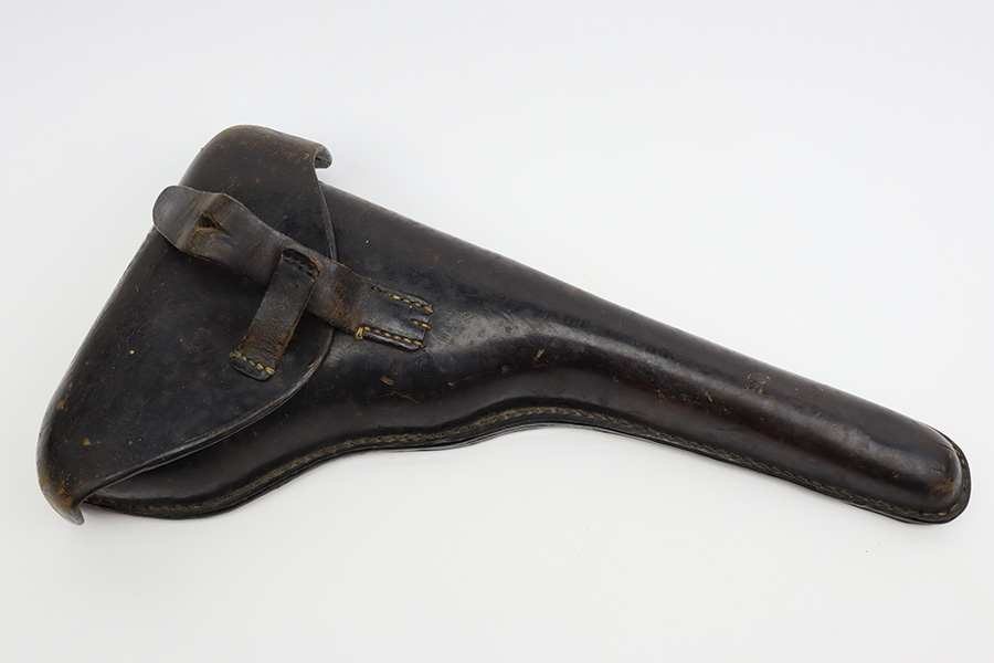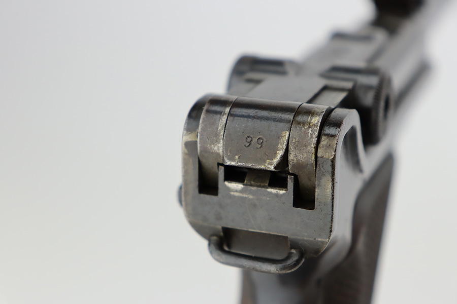 8/2/23 – This is a nice example of a DWM Artillery Luger issued to the Imperial German military in 1917. It is all matching with the proper Imperial military acceptance proofs. It comes as a rig with a 1917-dated holster, a blank tool, and a mismatched but period-correct magazine. The holster is fairly worn and is missing its belt loops, the top portion of the closure strap, and the lift strap. Some stitching missing from the loop on the top flap. The gun itself has retained roughly 85% of its original finish. There is wear around the muzzle, on the side plate, and on the side rails. Areas of spotty wear along the left side of the barrel and on the grip straps. Areas of light spotty oxidation throughout and some very minor pin-pricking here and there. Fitted with mismatched wood grips – some bruising on the right side and a small chip on the top edge of the left panel. The rifling in the bore is a bit worn with pitting throughout.