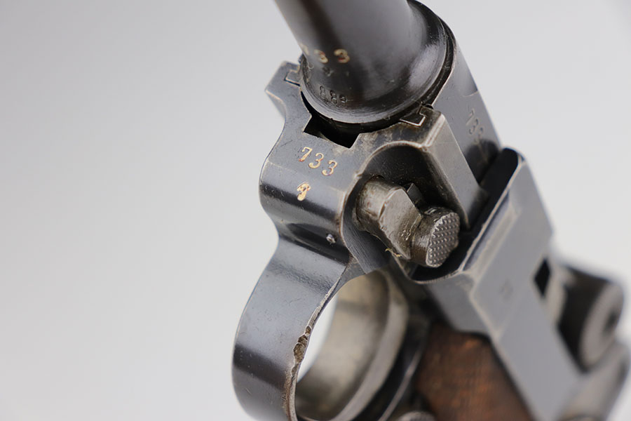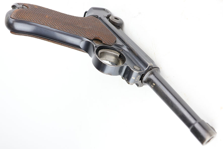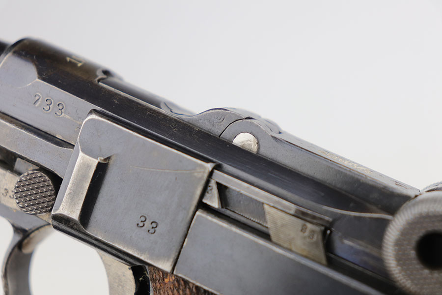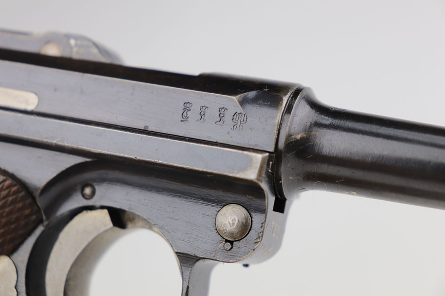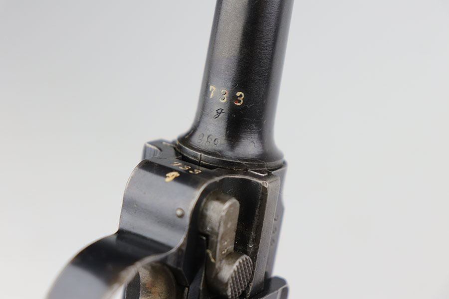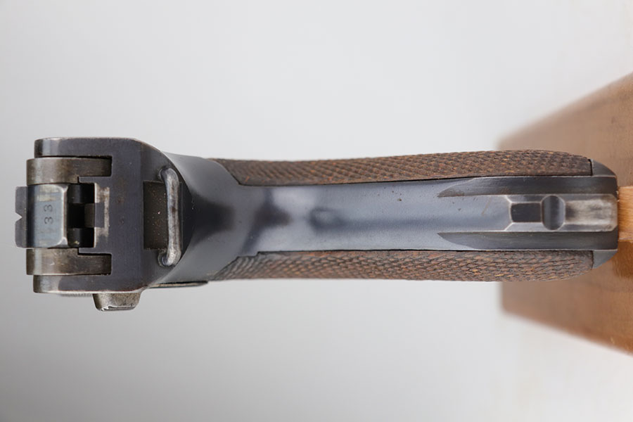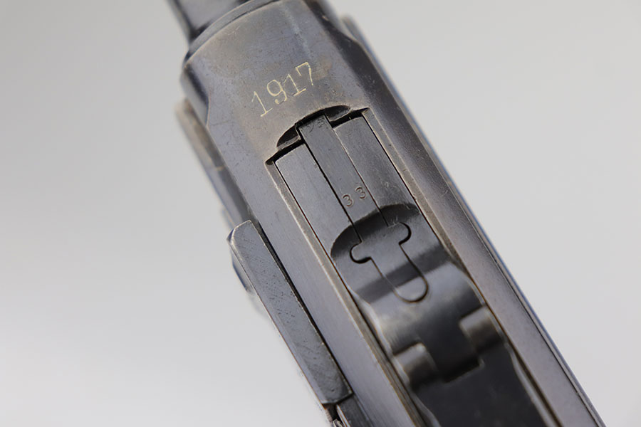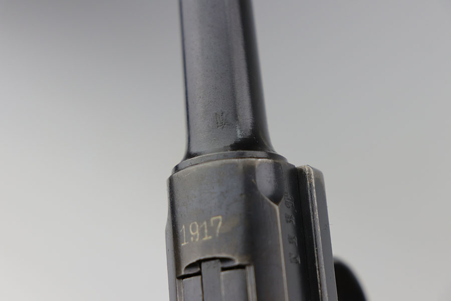 1/19/21 – This is a matching and original DWM Luger from 1917. The original grips are present and matching to the gun, but the magazine is a period replacement with blank bottom. The gun is in very good condition with maybe 92-94% of the original blue. Standard high edge wear on muzzle and sideplate, but most of the bluing loss is on the ears of the receiver, and very bottom of front strap. Unfortunately, the bore does show heavy use and has frost and freckling throughout with smoothed down rifling.