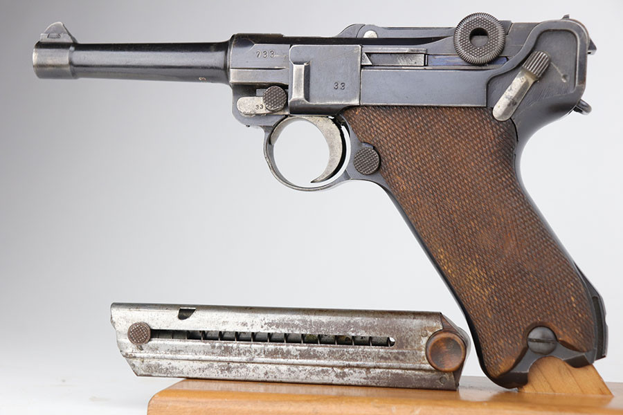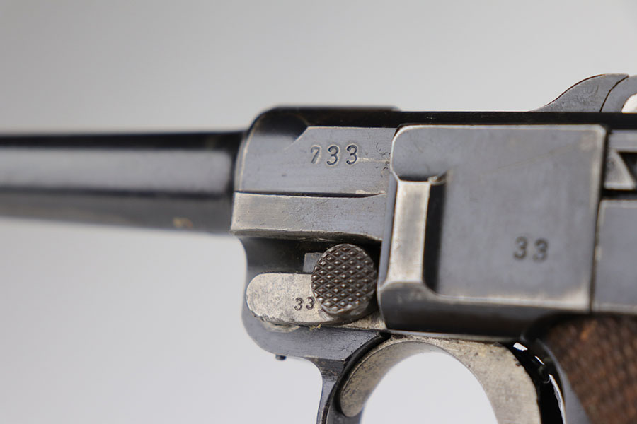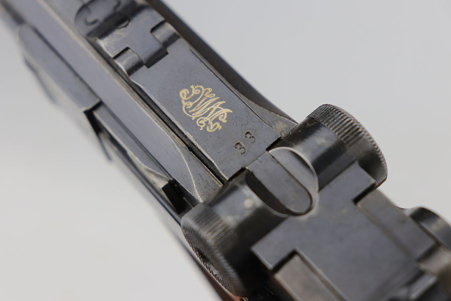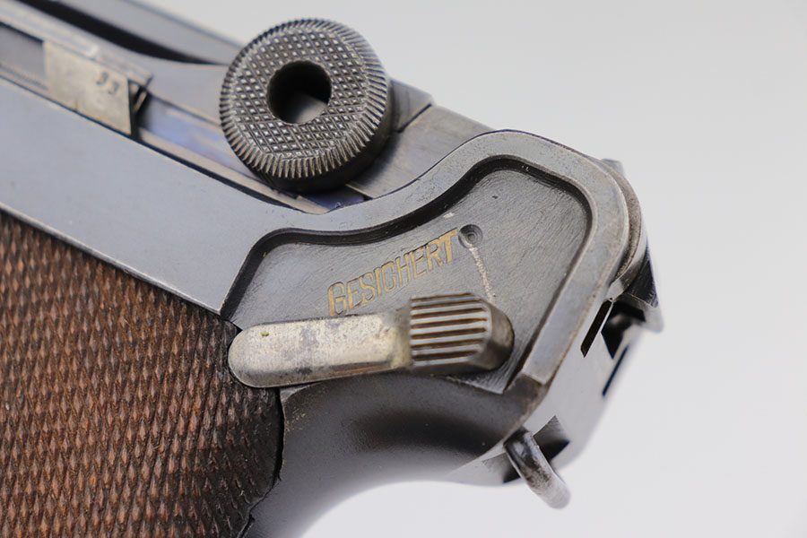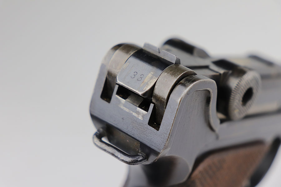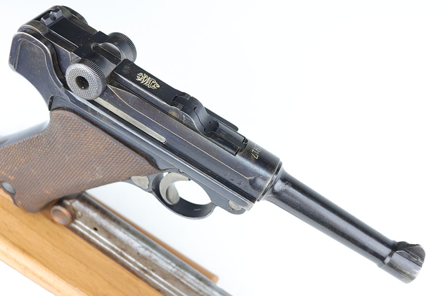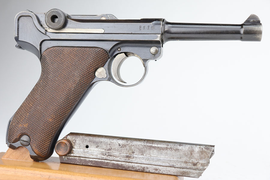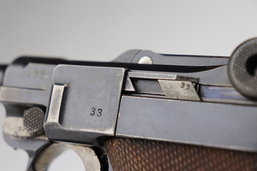1/19/21 – This is a matching and original DWM Luger from 1917. The original grips are present and matching to the gun, but the magazine is a period replacement with blank bottom. The gun is in very good condition with maybe 92-94% of the original blue. Standard high edge wear on muzzle and sideplate, but most of the bluing loss is on the ears of the receiver, and very bottom of front strap. Unfortunately, the bore does show heavy use and has frost and freckling throughout with smoothed down rifling.
