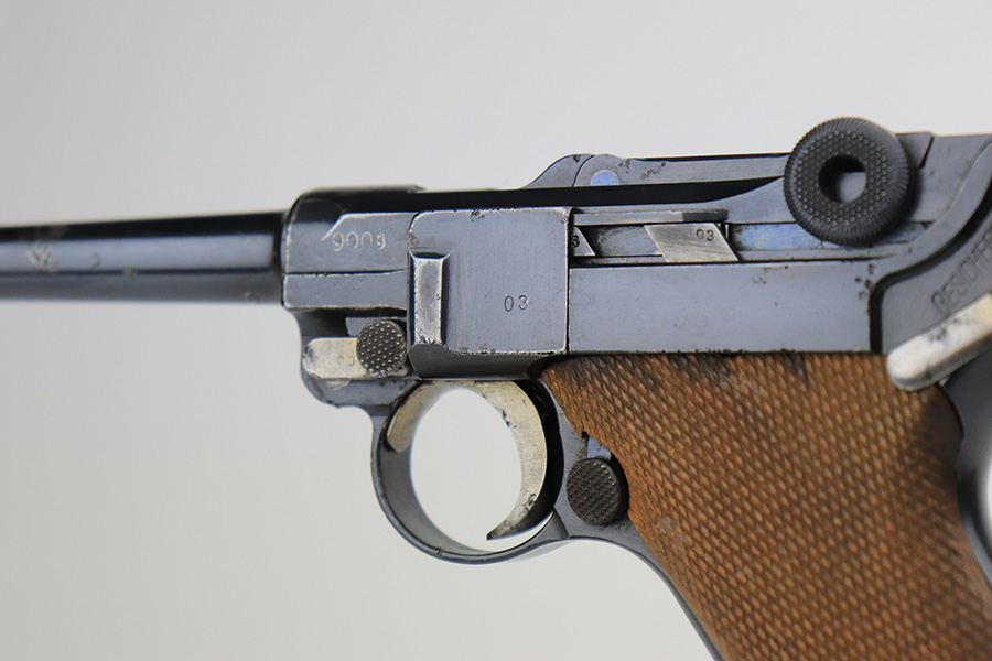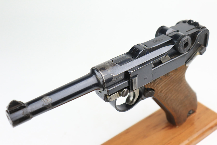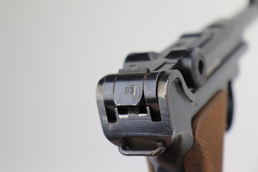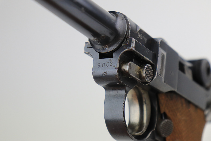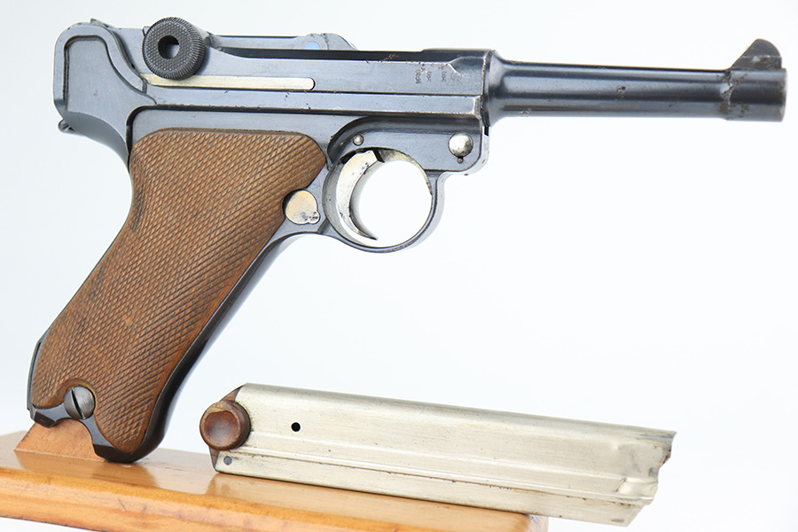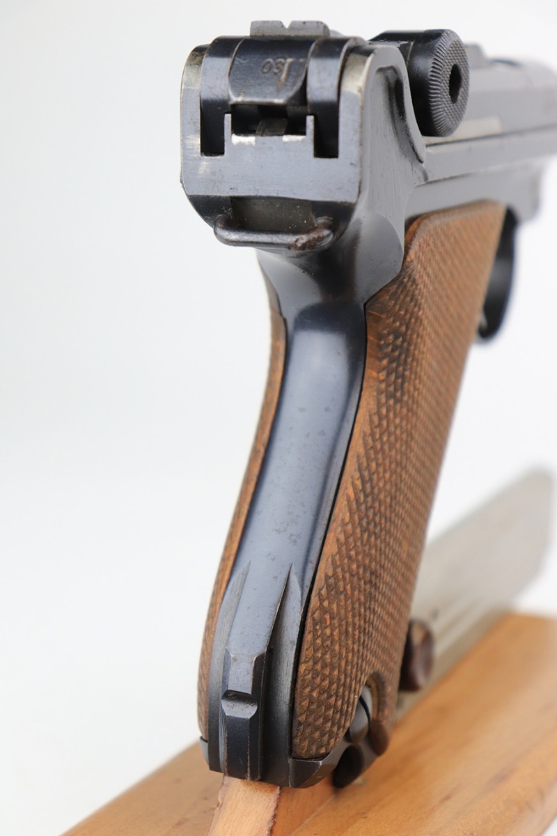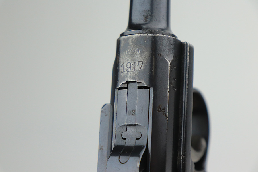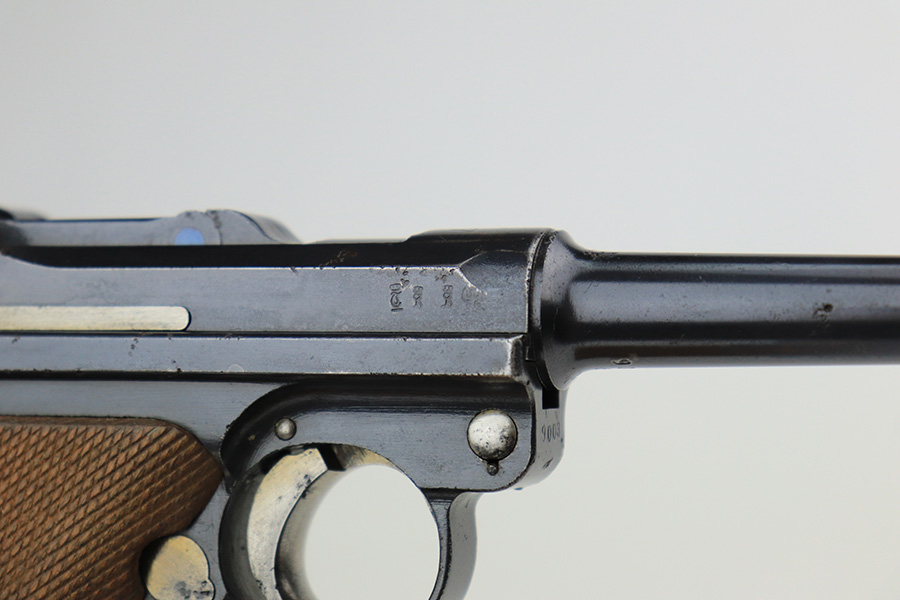6/7/22 – This is a nice example of a DWM Luger issued to the Imperial German military in 1917. It is all matching and has the proper Imperial proofs. It has retained about 93% of its original finish with areas of wear on the side plate, side rails, on the chamber, and around the muzzle. While there isn’t much actual finish loss, there are areas of noticeable pitting along the barrel, on the side plate, on the receiver, and on the left side of the frame. Some light freckling on both grip straps. Comes with nice matching-numbered wood grips – a couple of tiny chips along the top edge of the left panel. Also comes with a blank-bottom wood magazine – small chip. Minty bore.