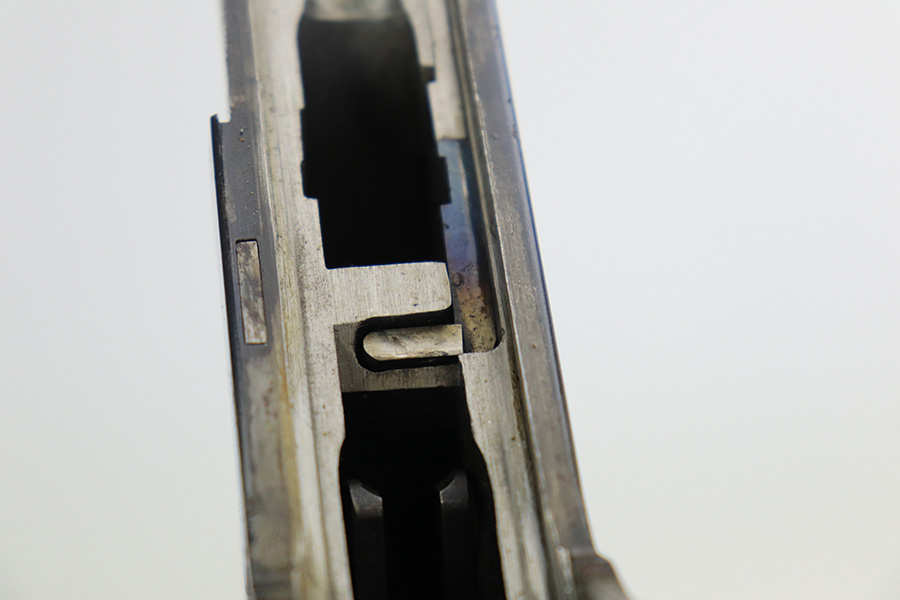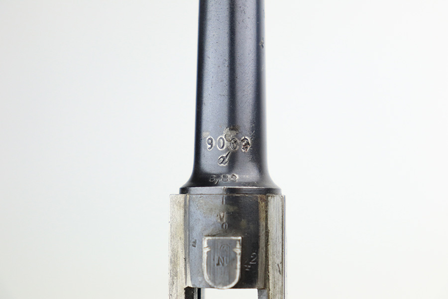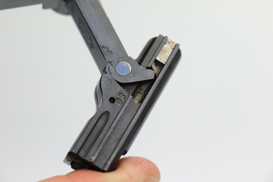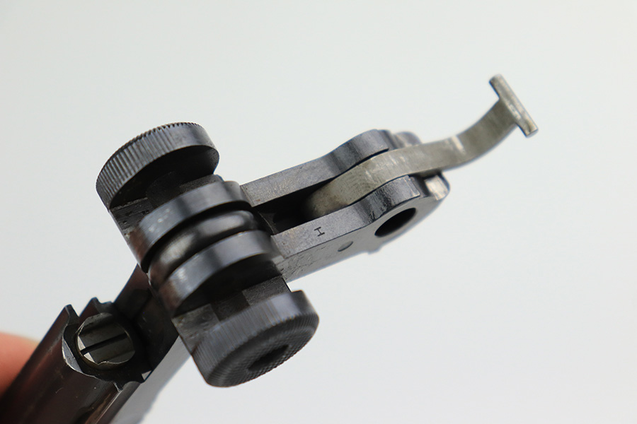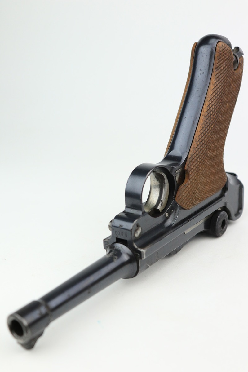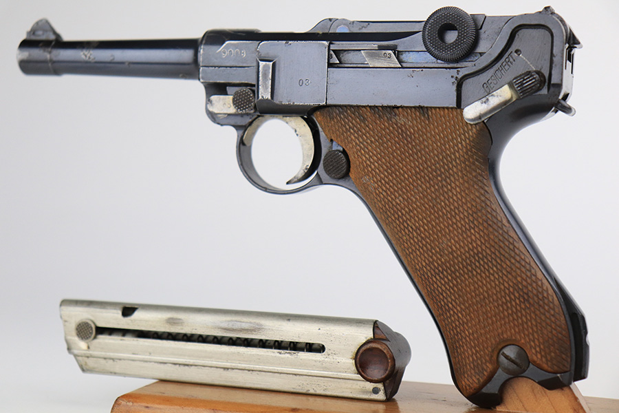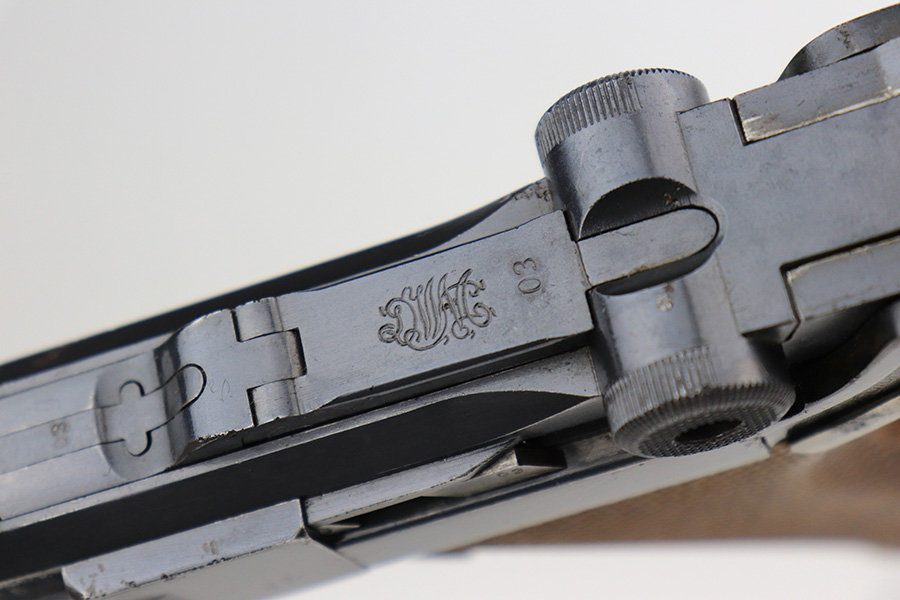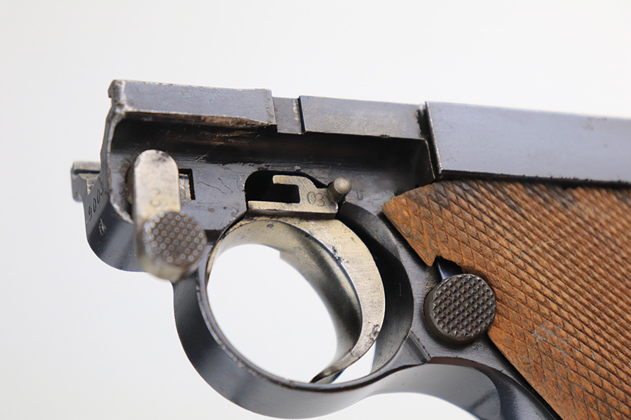 6/7/22 – This is a nice example of a DWM Luger issued to the Imperial German military in 1917. It is all matching and has the proper Imperial proofs. It has retained about 93% of its original finish with areas of wear on the side plate, side rails, on the chamber, and around the muzzle. While there isn’t much actual finish loss, there are areas of noticeable pitting along the barrel, on the side plate, on the receiver, and on the left side of the frame. Some light freckling on both grip straps. Comes with nice matching-numbered wood grips – a couple of tiny chips along the top edge of the left panel. Also comes with a blank-bottom wood magazine – small chip. Minty bore.