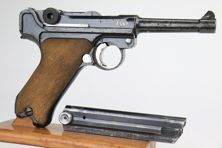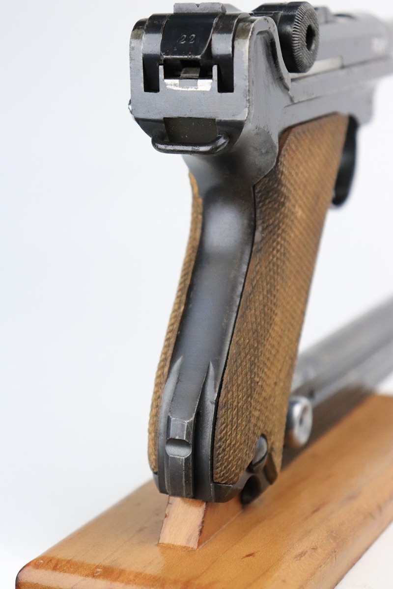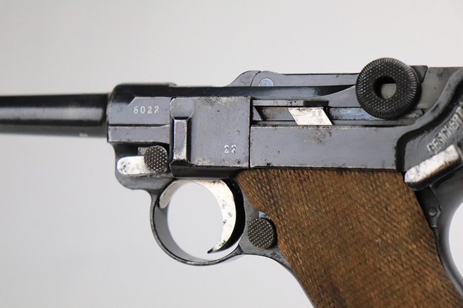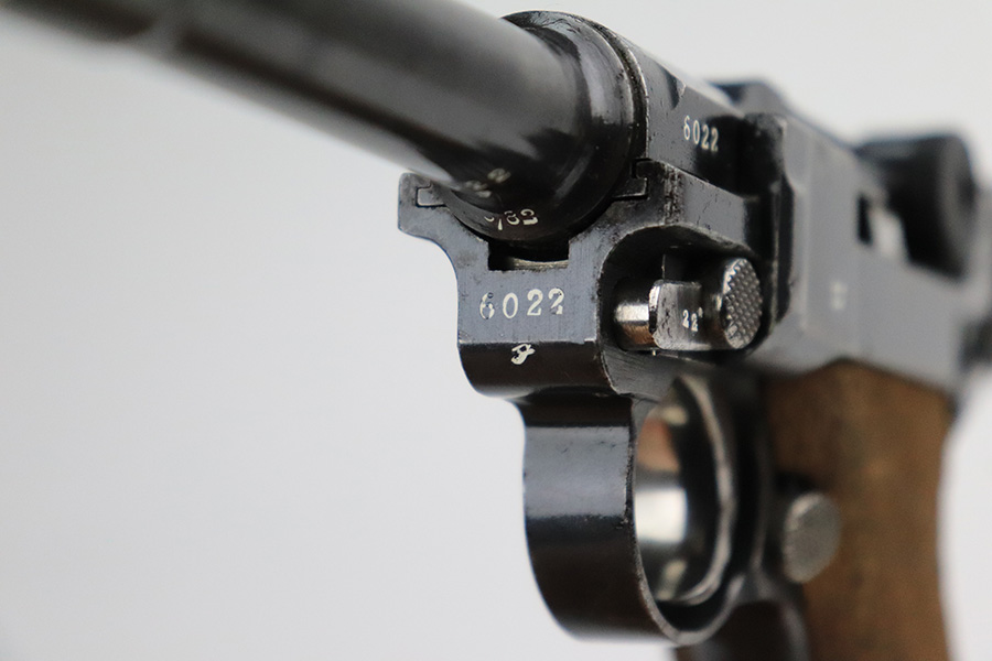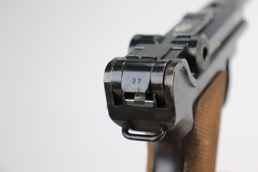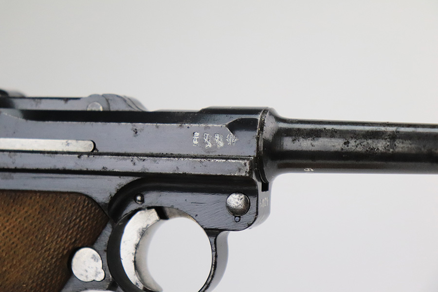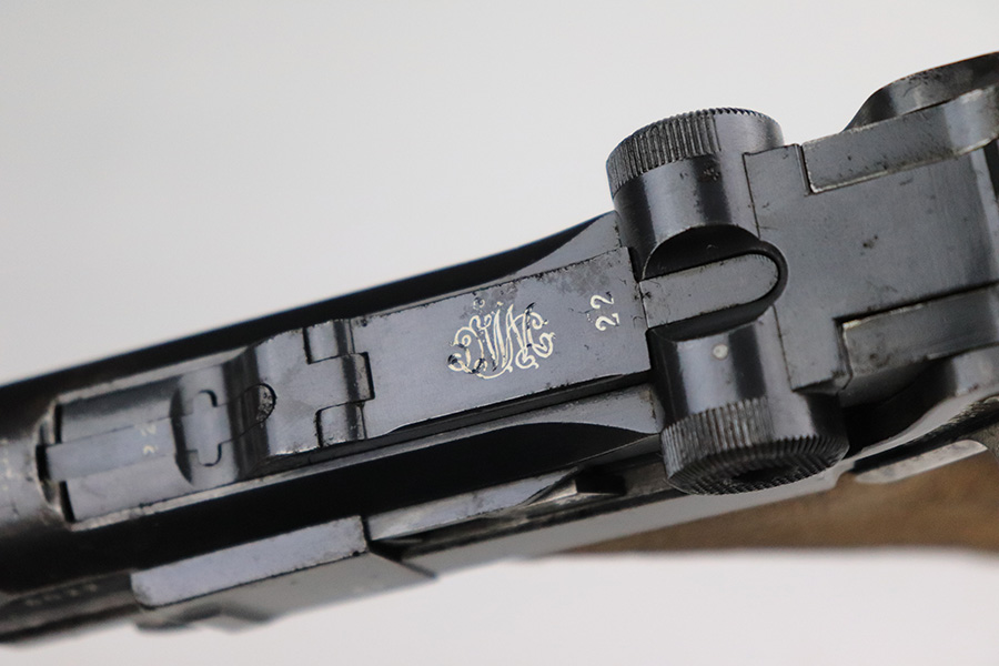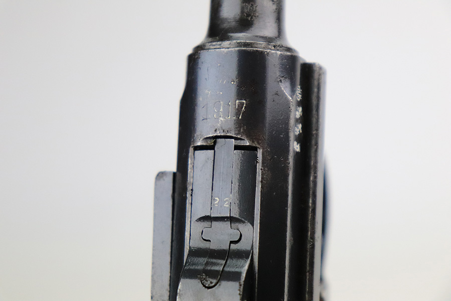 7/22/22 – This is a nice example of a DWM Luger issued to the Imperial German military in 1917. It is all matching and has the proper Imperial proofs. It has retained roughly 85% of its original finish. There are areas of somewhat spotty wear on the left side of the frame, on the side plate, and around the muzzle. Thinning along the barrel. There are areas of spotty oxidation and pitting throughout, but most noticeable along the barrel. Pin-pricking on both grip straps. Comes with nice wood grips – the left panel is numbered and matching, the right is un-numbered. Small chip in the left panel. Also comes with a WW2-era magazine. The bore is shiny with strong rifling and some tiny pits around the muzzle end.