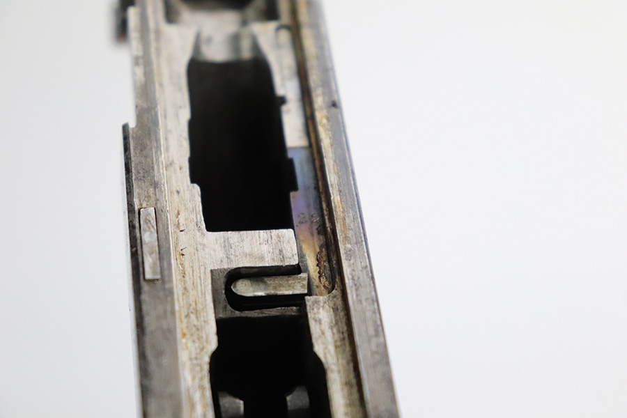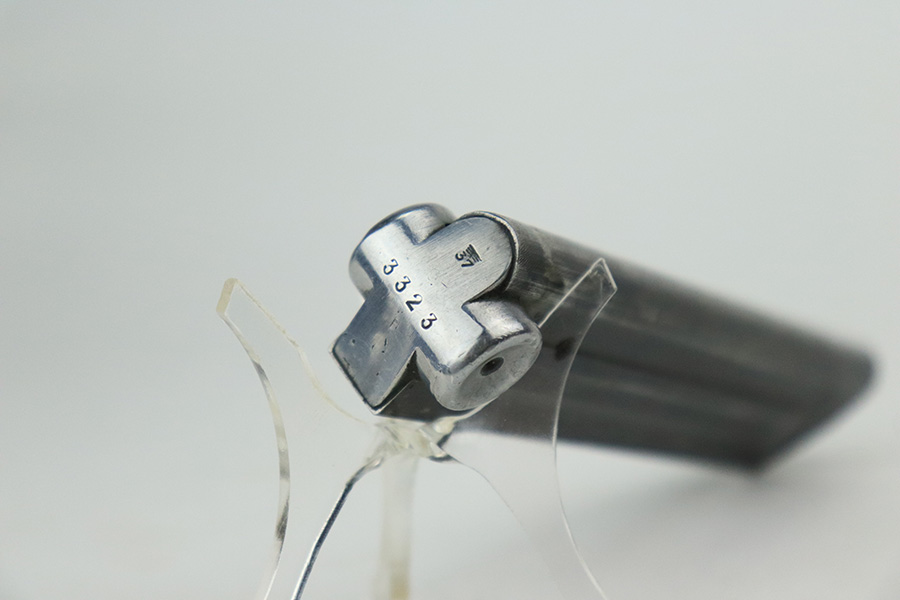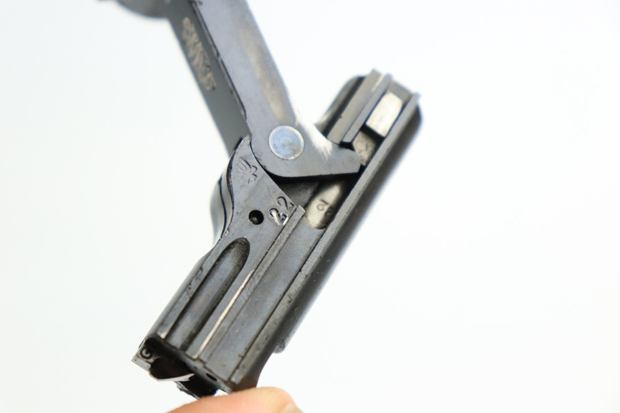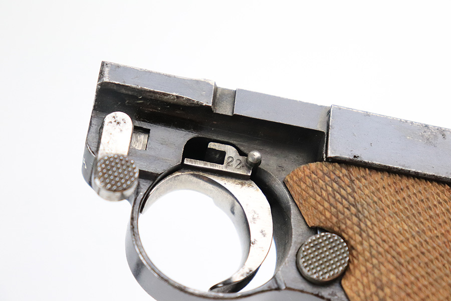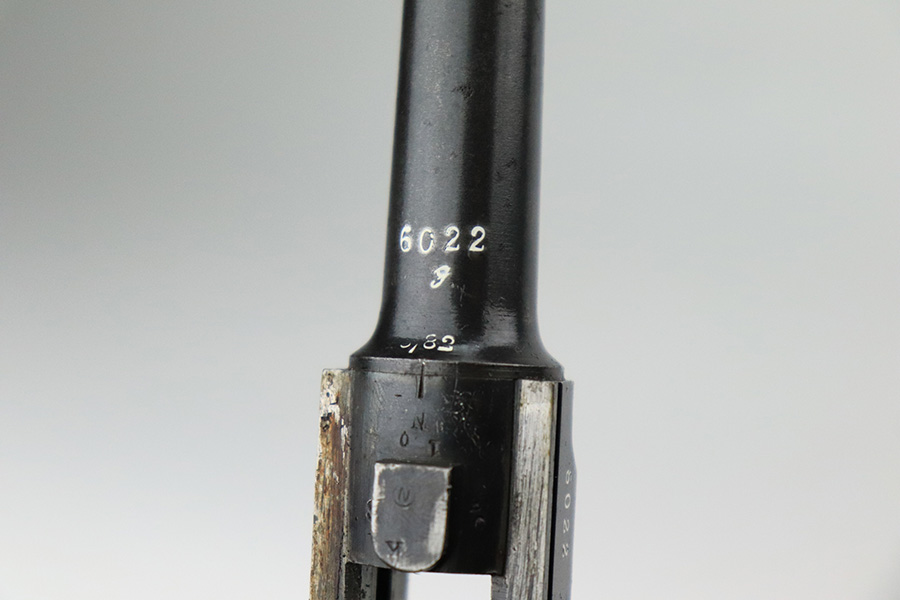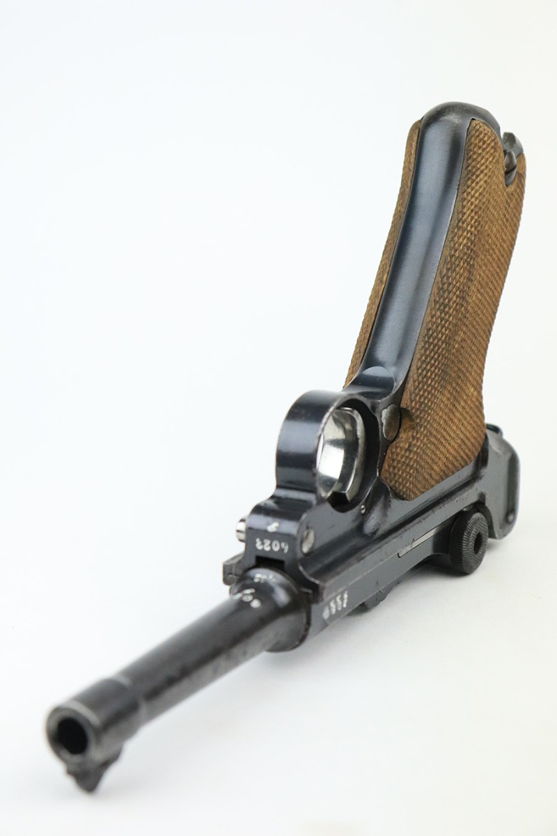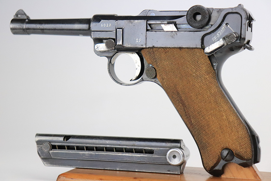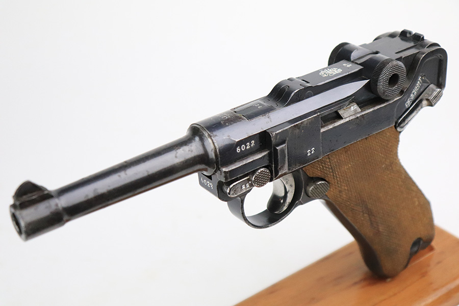 7/22/22 – This is a nice example of a DWM Luger issued to the Imperial German military in 1917. It is all matching and has the proper Imperial proofs. It has retained roughly 85% of its original finish. There are areas of somewhat spotty wear on the left side of the frame, on the side plate, and around the muzzle. Thinning along the barrel. There are areas of spotty oxidation and pitting throughout, but most noticeable along the barrel. Pin-pricking on both grip straps. Comes with nice wood grips – the left panel is numbered and matching, the right is un-numbered. Small chip in the left panel. Also comes with a WW2-era magazine. The bore is shiny with strong rifling and some tiny pits around the muzzle end.