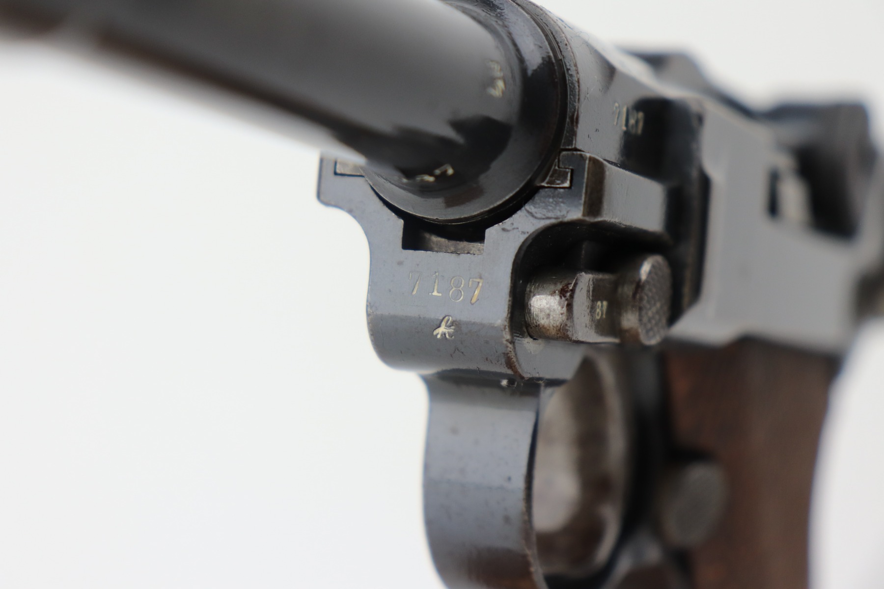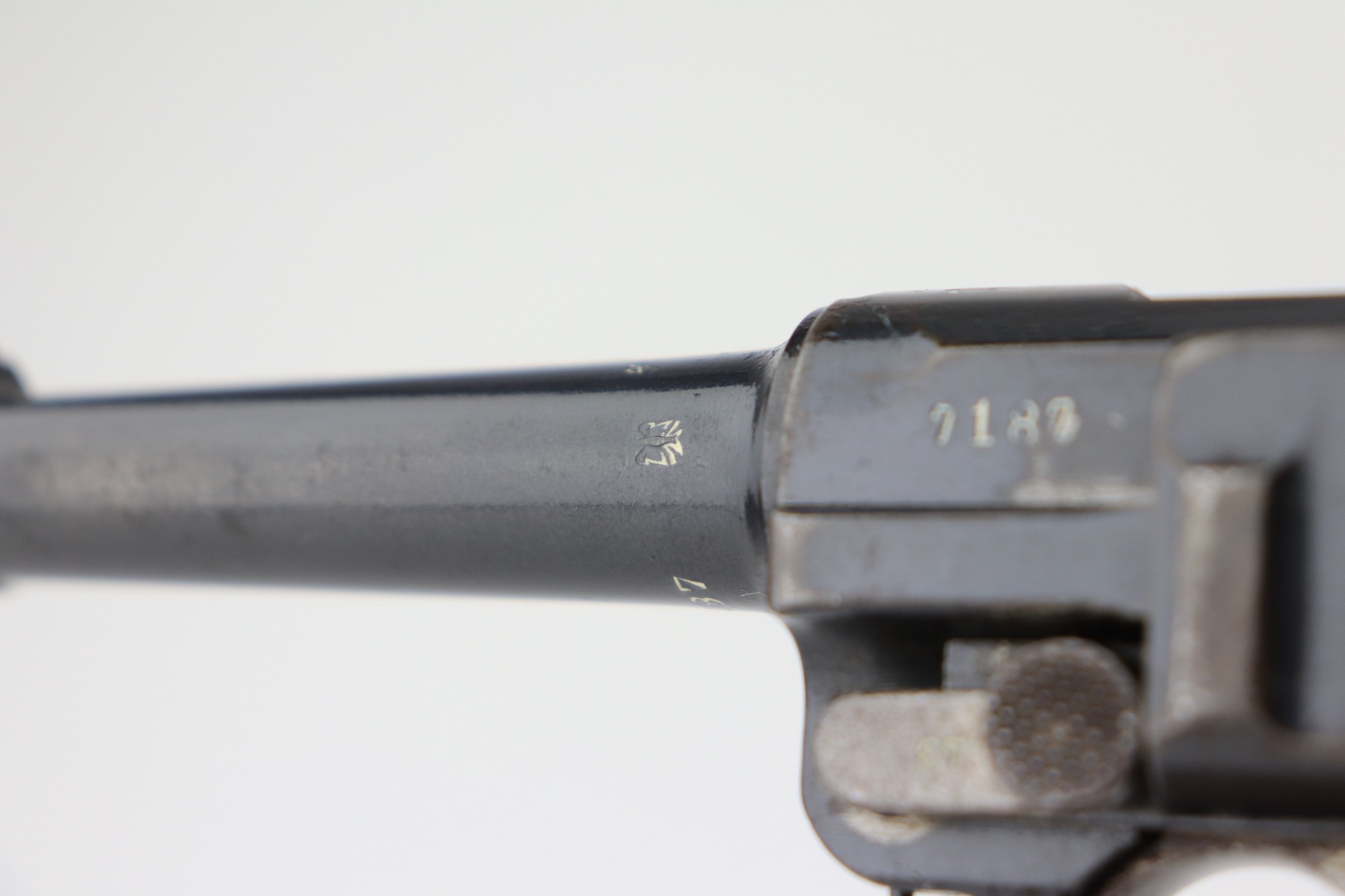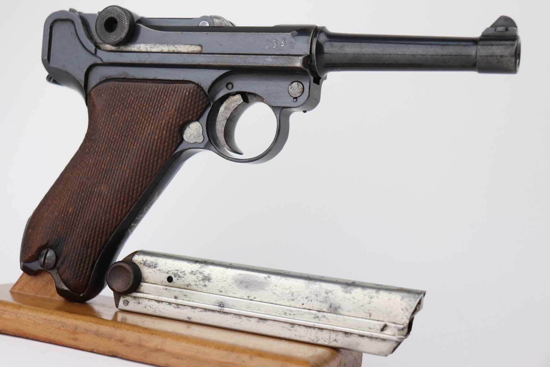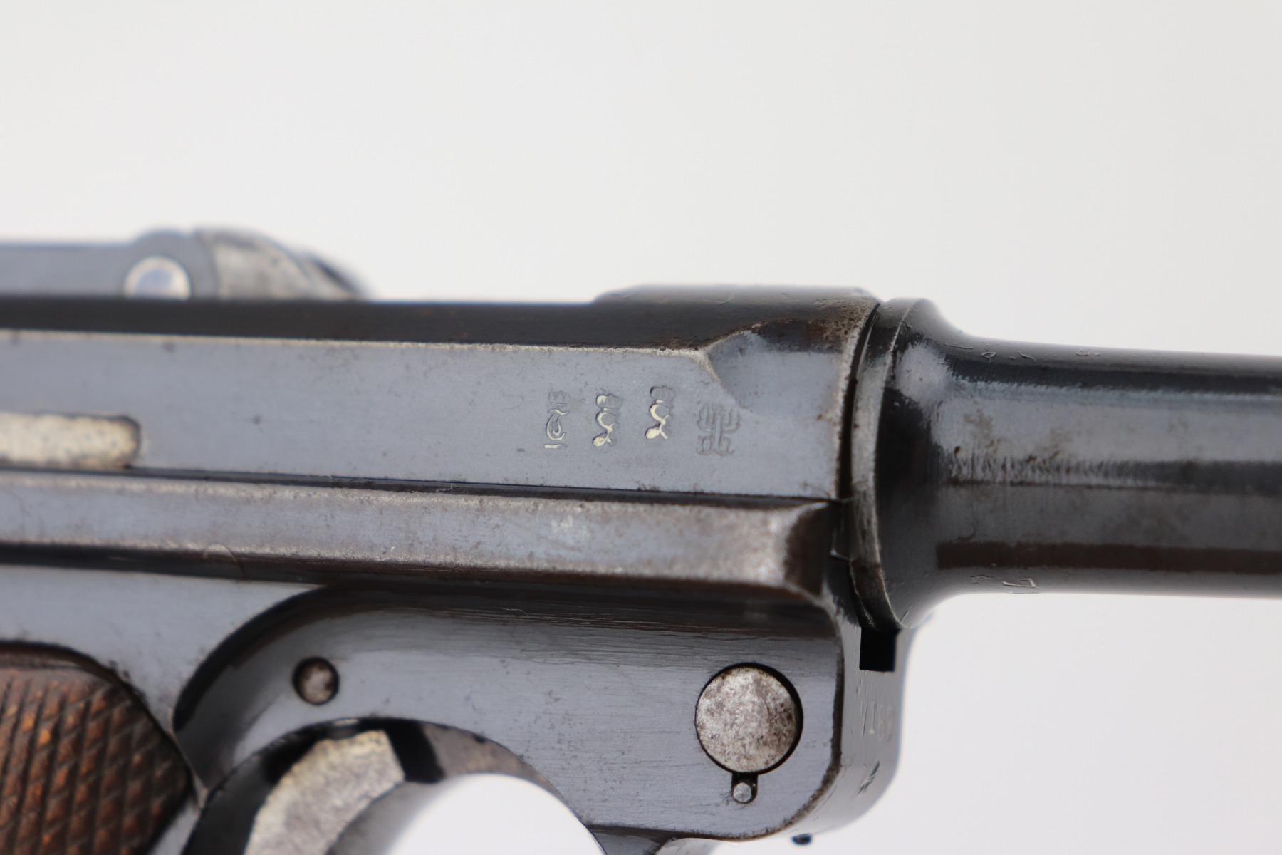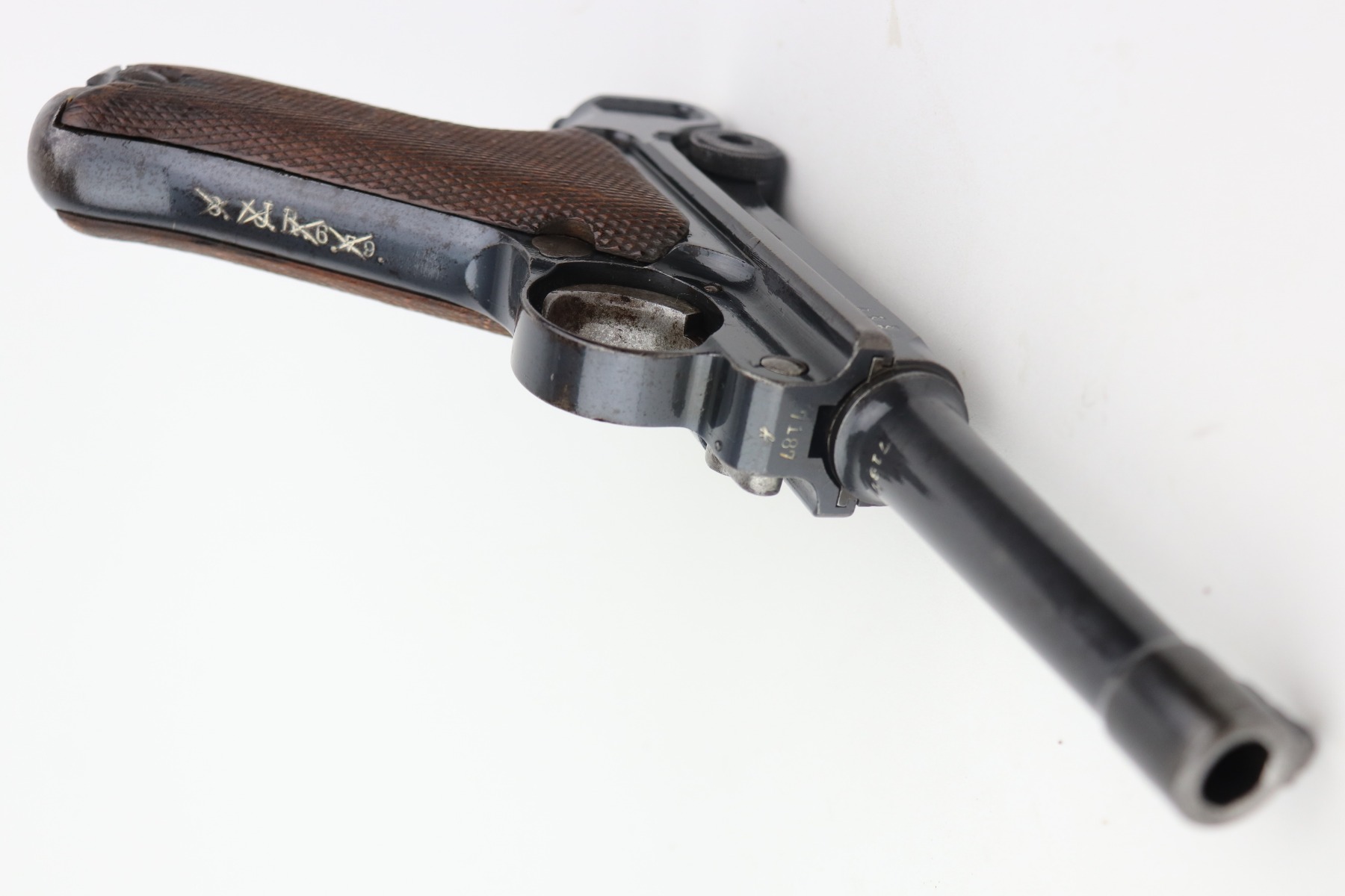 4/28/21 – This is a very nice example of a DWM Luger issued to the Imperial German Army in 1917. It is all matching and has the proper Imperial proofs. It has a “1920” rework marking on the chamber. It has a unit marking on the front strap that stands for the Jager unit – an elite fighting unit. The same unit marking is on the tang. The gun has retained about 93% of its original bluing. There is minor wear at the base of the straps, on the side plate, front edges of the frame, and around the muzzle. Spotty oxidation throughout. Comes with nice original matching grips and a mismatched period-correct magazine. The bore has strong rifling with minor pin-pricking throughout.