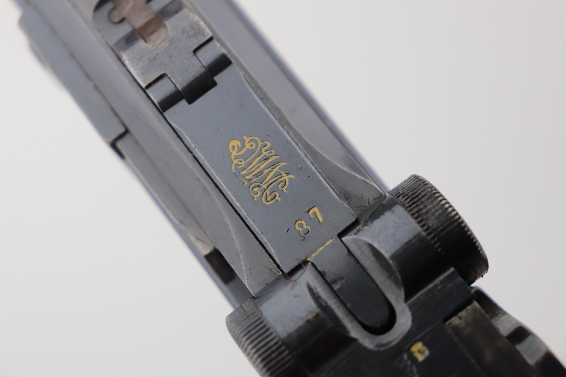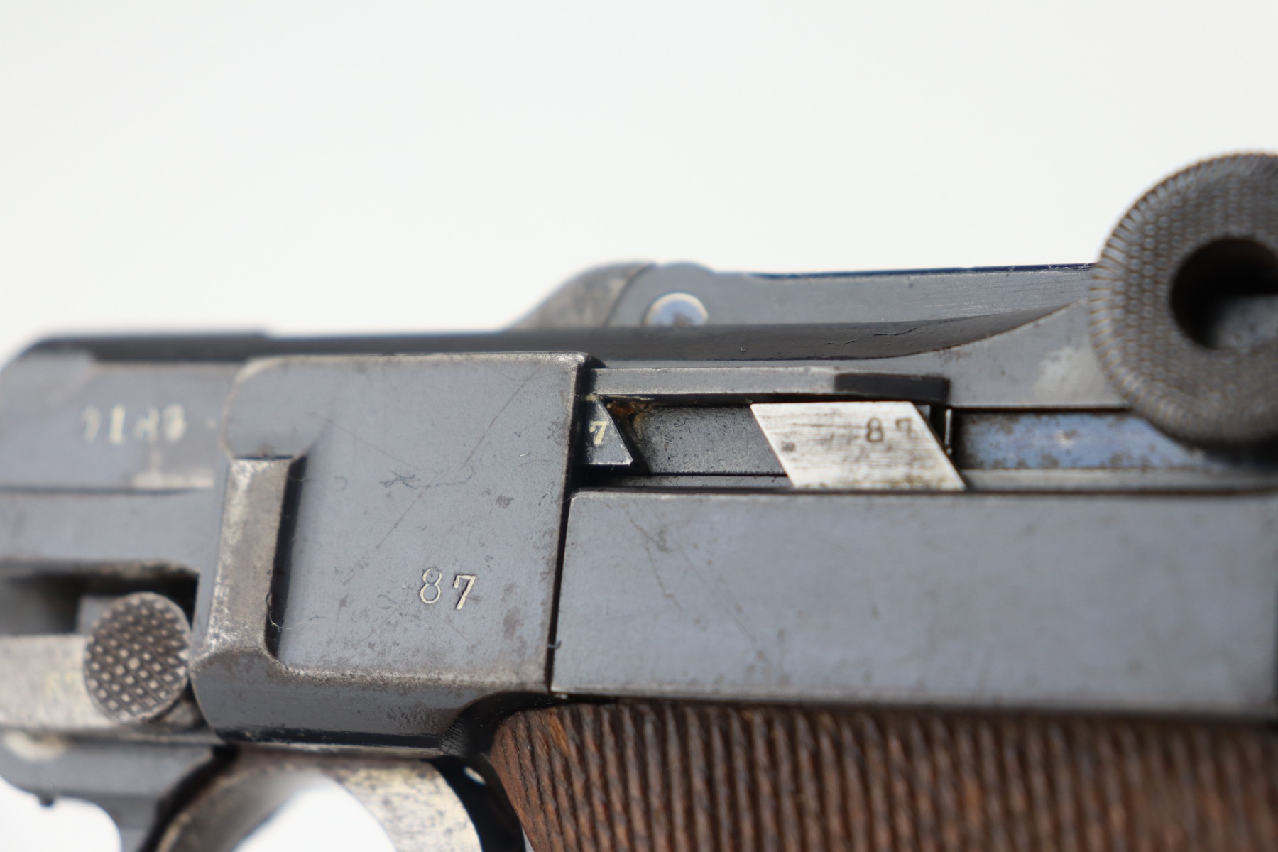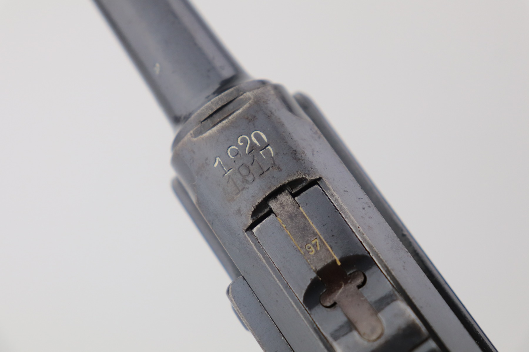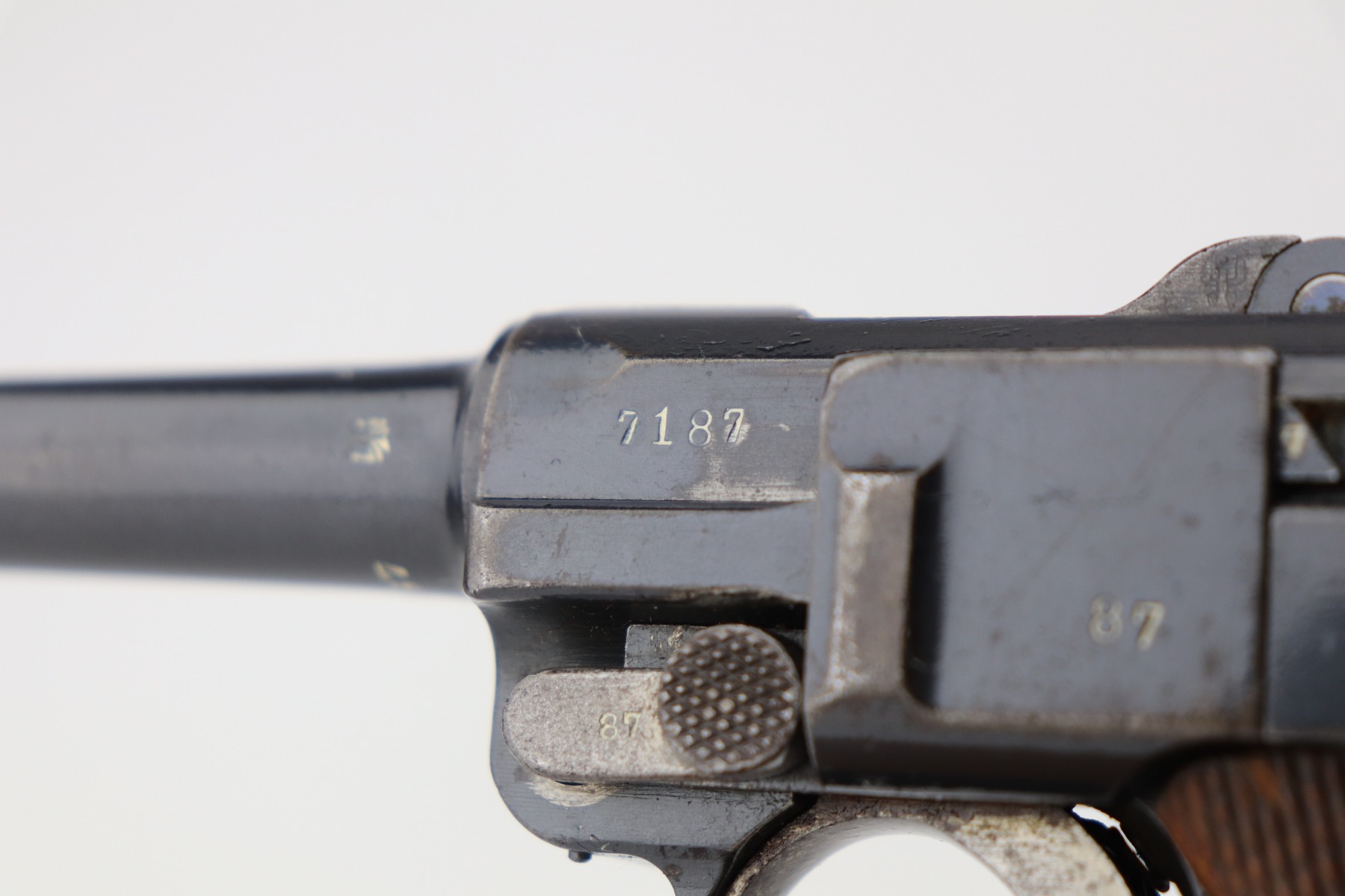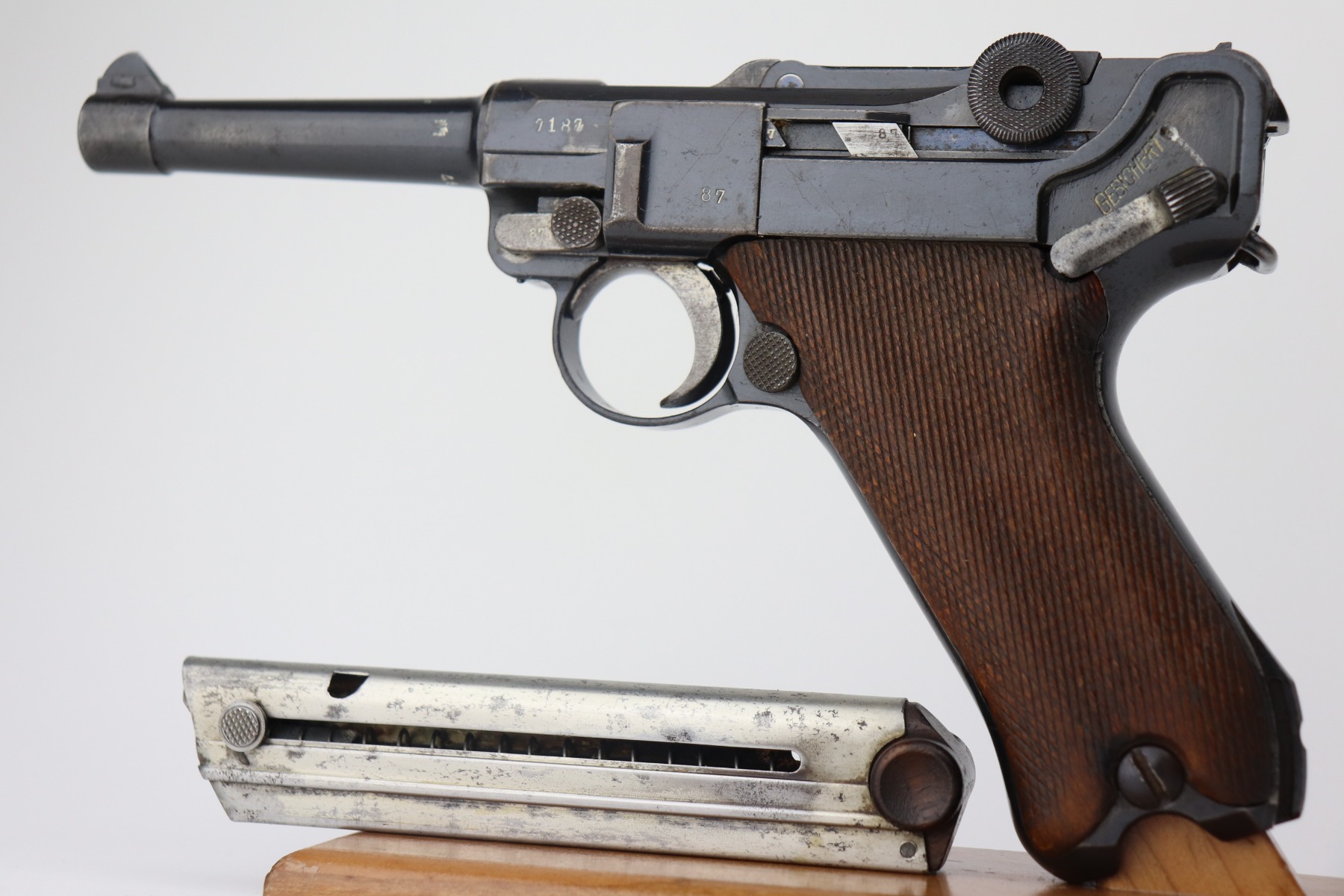 4/28/21 – This is a very nice example of a DWM Luger issued to the Imperial German Army in 1917. It is all matching and has the proper Imperial proofs. It has a “1920” rework marking on the chamber. It has a unit marking on the front strap that stands for the Jager unit – an elite fighting unit. The same unit marking is on the tang. The gun has retained about 93% of its original bluing. There is minor wear at the base of the straps, on the side plate, front edges of the frame, and around the muzzle. Spotty oxidation throughout. Comes with nice original matching grips and a mismatched period-correct magazine. The bore has strong rifling with minor pin-pricking throughout.