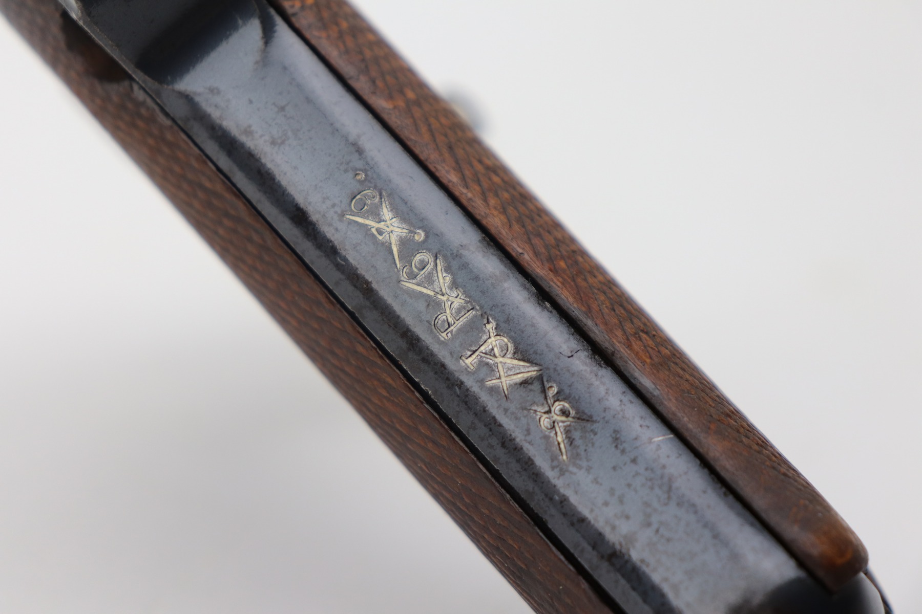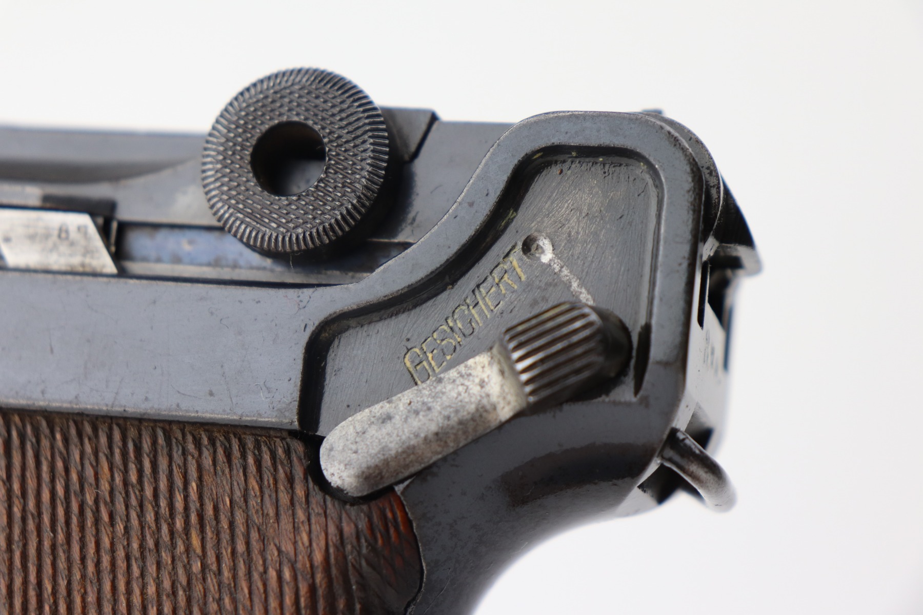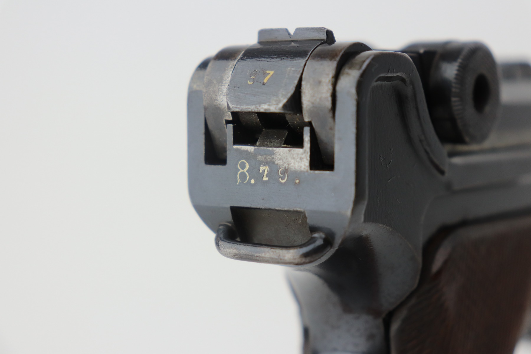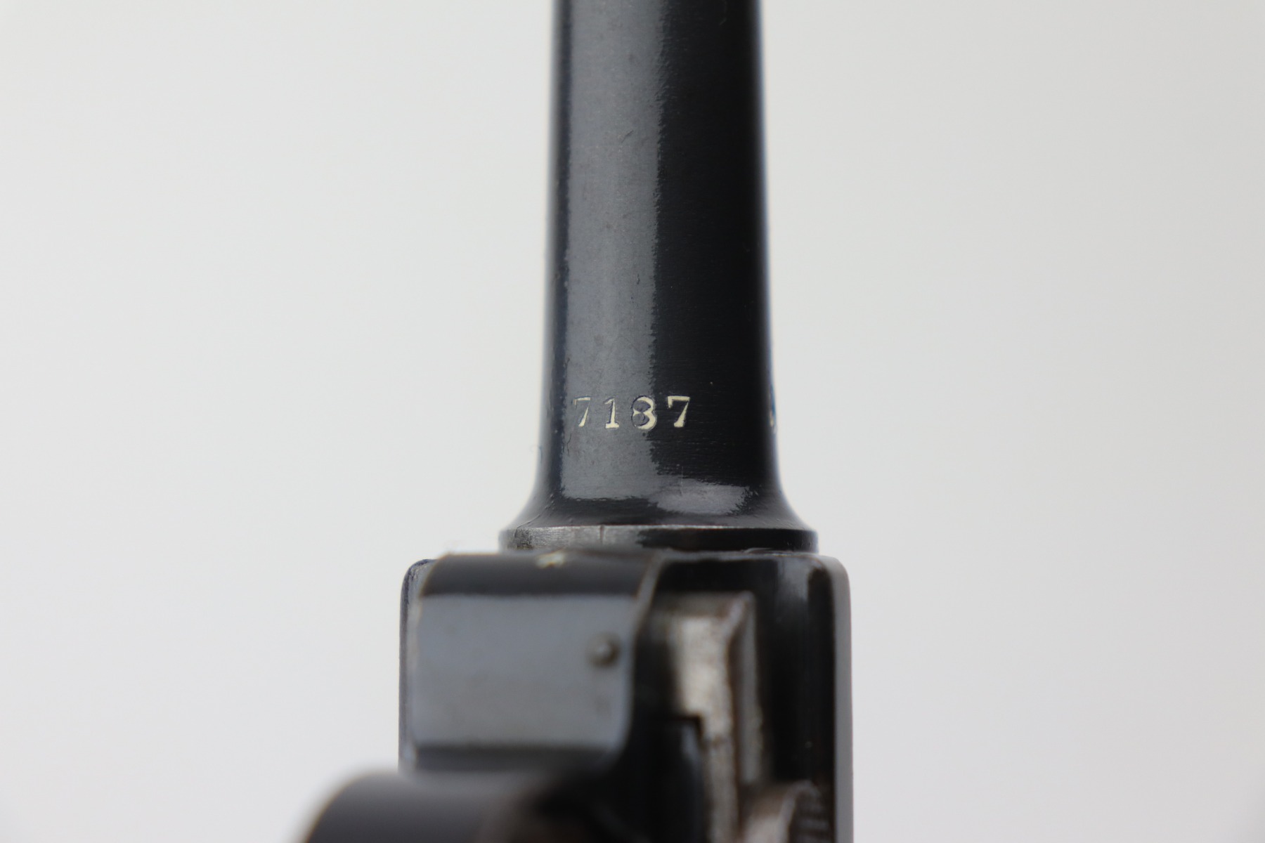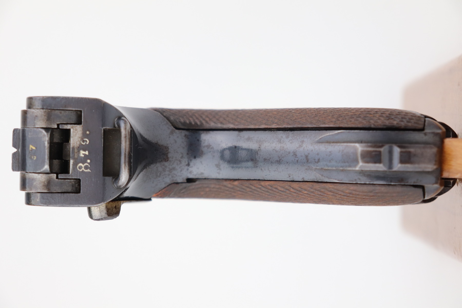 4/28/21 – This is a very nice example of a DWM Luger issued to the Imperial German Army in 1917. It is all matching and has the proper Imperial proofs. It has a “1920” rework marking on the chamber. It has a unit marking on the front strap that stands for the Jager unit – an elite fighting unit. The same unit marking is on the tang. The gun has retained about 93% of its original bluing. There is minor wear at the base of the straps, on the side plate, front edges of the frame, and around the muzzle. Spotty oxidation throughout. Comes with nice original matching grips and a mismatched period-correct magazine. The bore has strong rifling with minor pin-pricking throughout.