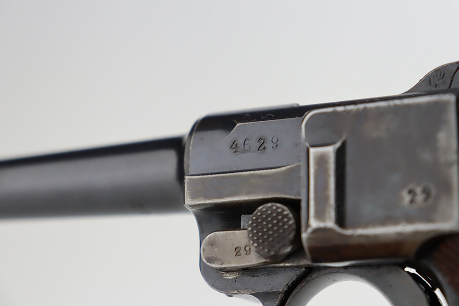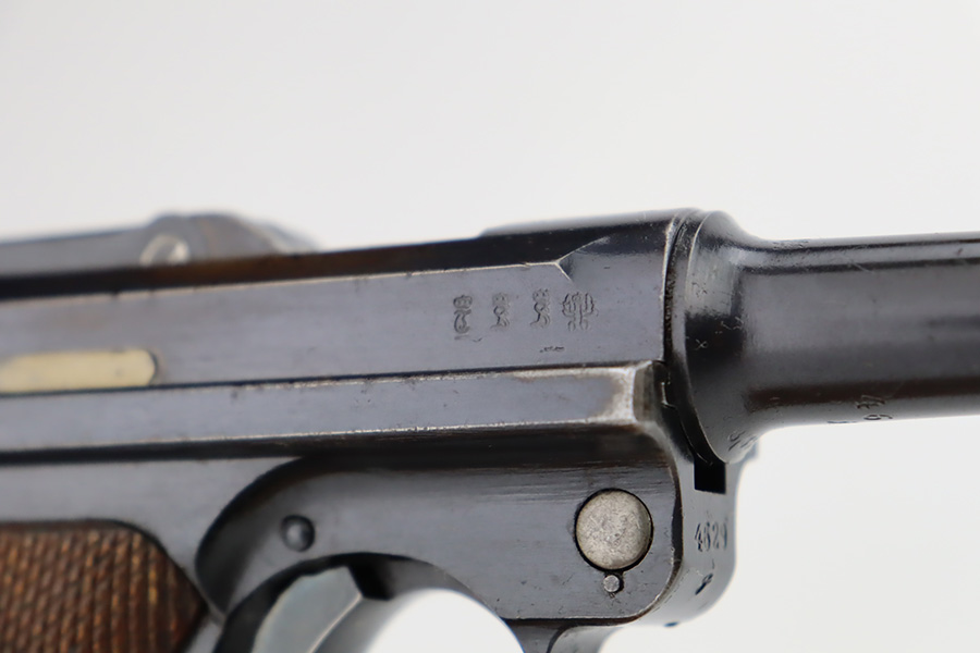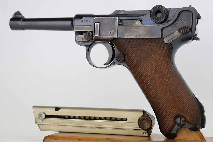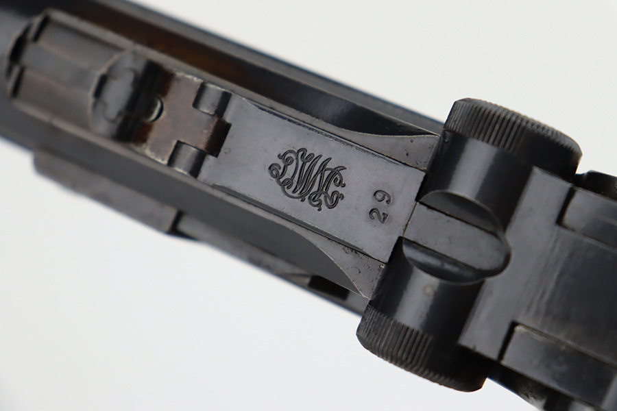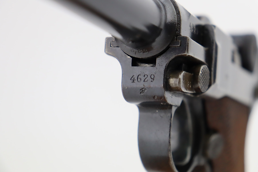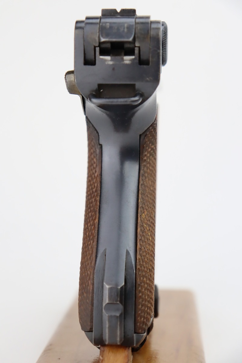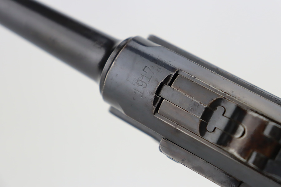 10/4/23 – This is a nice DWM Luger issued to the Imperial German military in 1917. All matching with the proper Imperial military proofs. Comes with one original matching-numbered magazine. The finish rates roughly 80-85% with areas of wear and light spotty brown patina on the front strap and on the left side of the gun. Fitted with minty matching-numbered wood grips. Excellent bore.