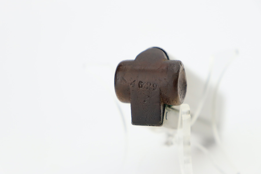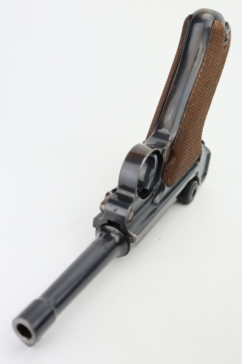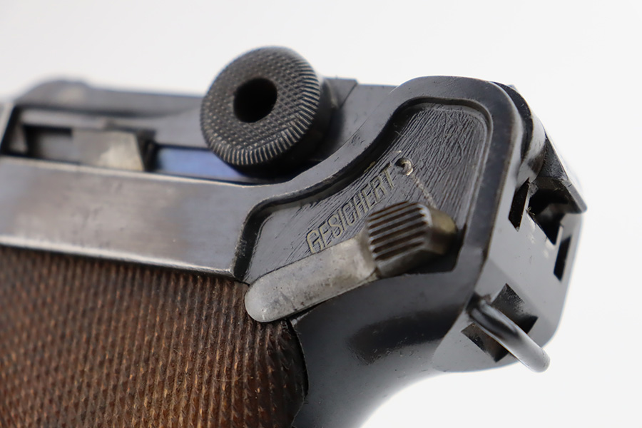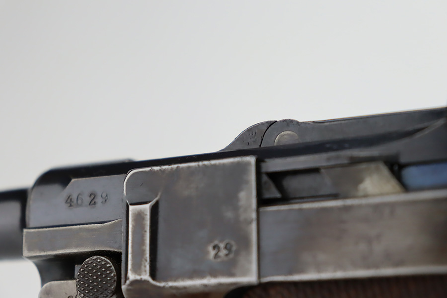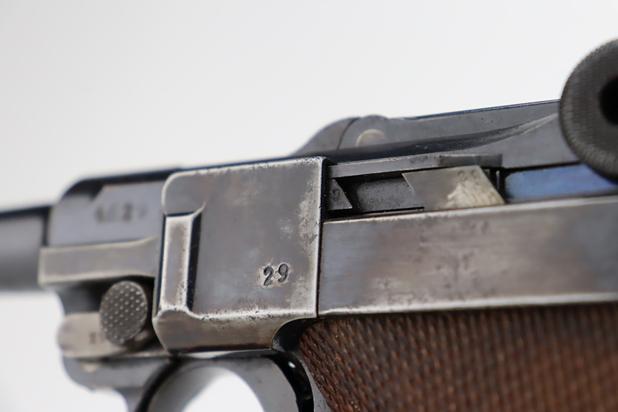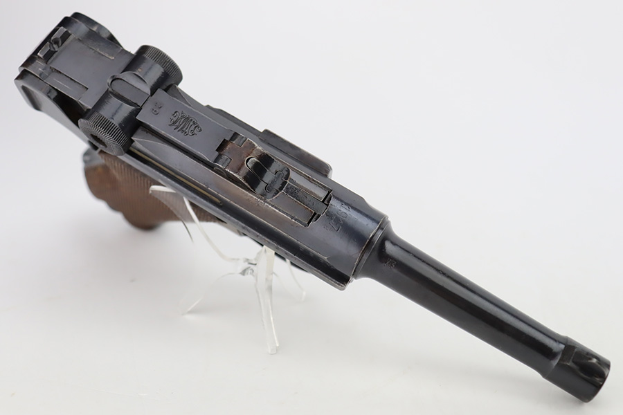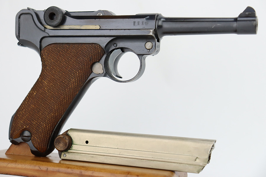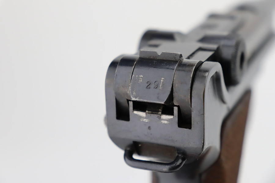10/4/23 – This is a nice DWM Luger issued to the Imperial German military in 1917. All matching with the proper Imperial military proofs. Comes with one original matching-numbered magazine. The finish rates roughly 80-85% with areas of wear and light spotty brown patina on the front strap and on the left side of the gun. Fitted with minty matching-numbered wood grips. Excellent bore.