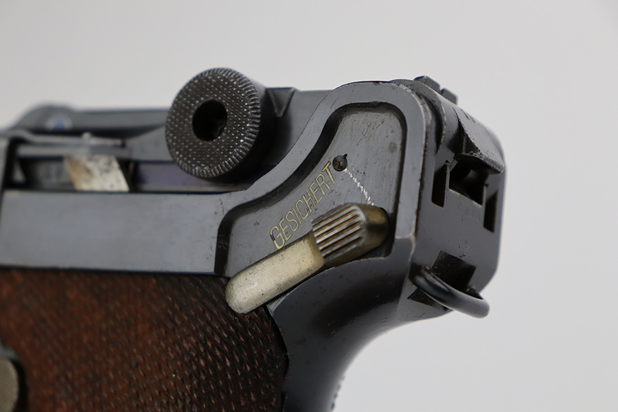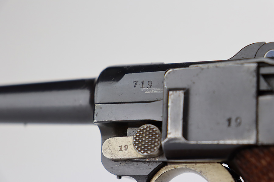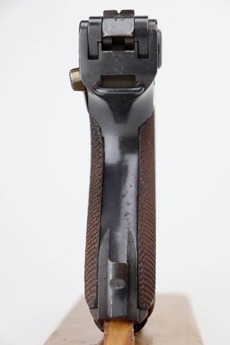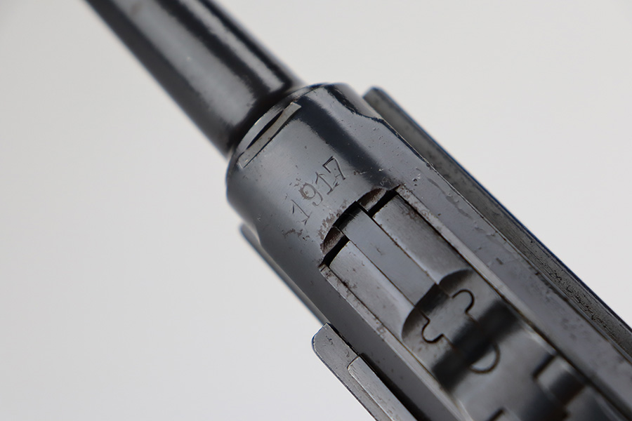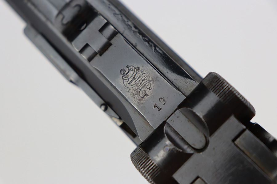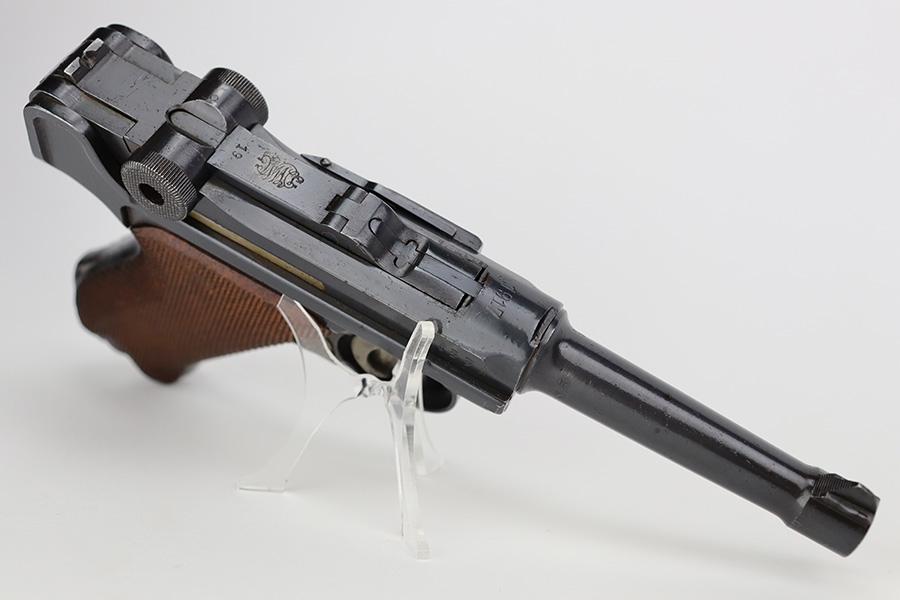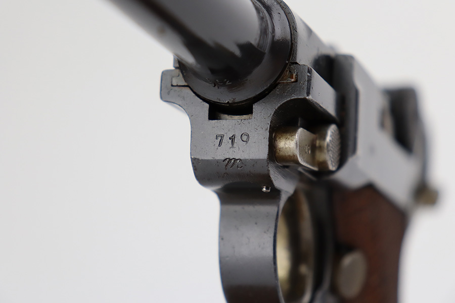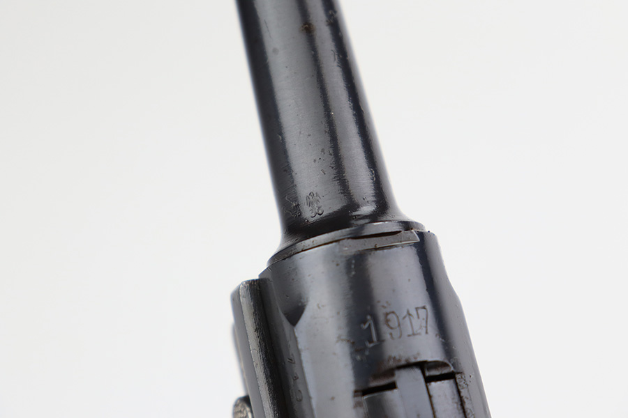 8/2/23 – This is a very nice example of a DWM Luger from 1917. It was originally issued to the Imperial German military as evidenced by the Imperial military acceptance proofs on the right side of the slide. It was later reworked and issued to the German police force, as evidenced by the added police sear safety and replaced barrel with Weimar-era Eagle proofs. The gun has retained about 97% of its original finish. There is just very minor wear around the muzzle and on the side plate and some freckling on the grip straps. Fitted with minty un-numbered wood grips – the left panel is marked “S/42”, a WW2-era armorers replacement. Comes with a post-war Erma magazine. Mint bore.