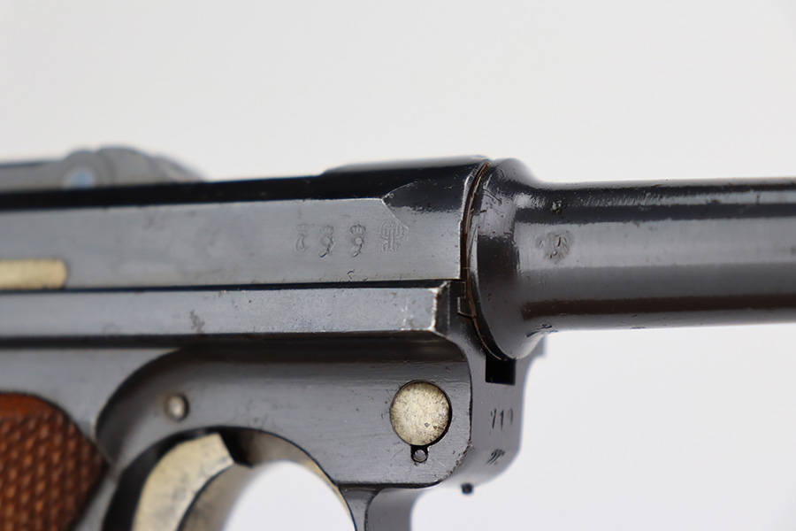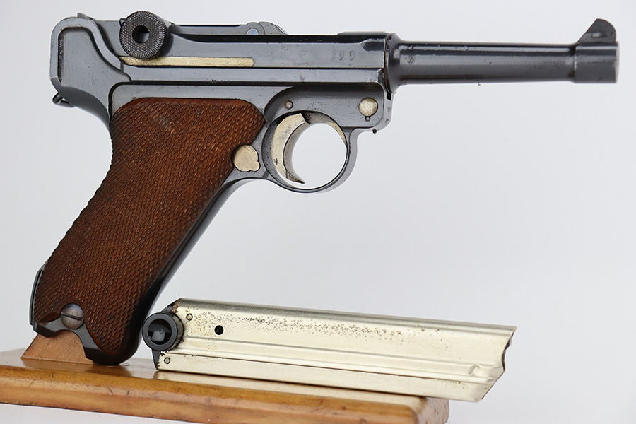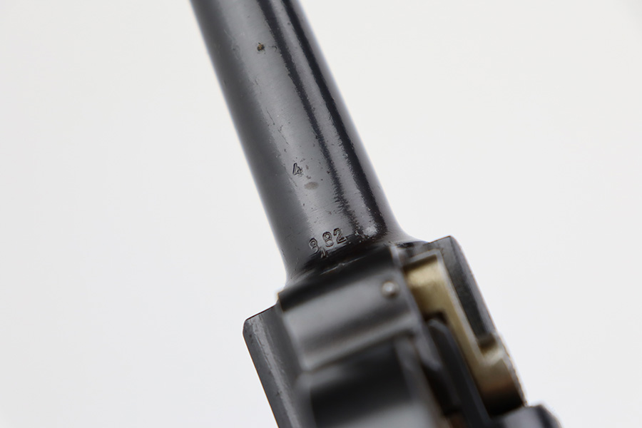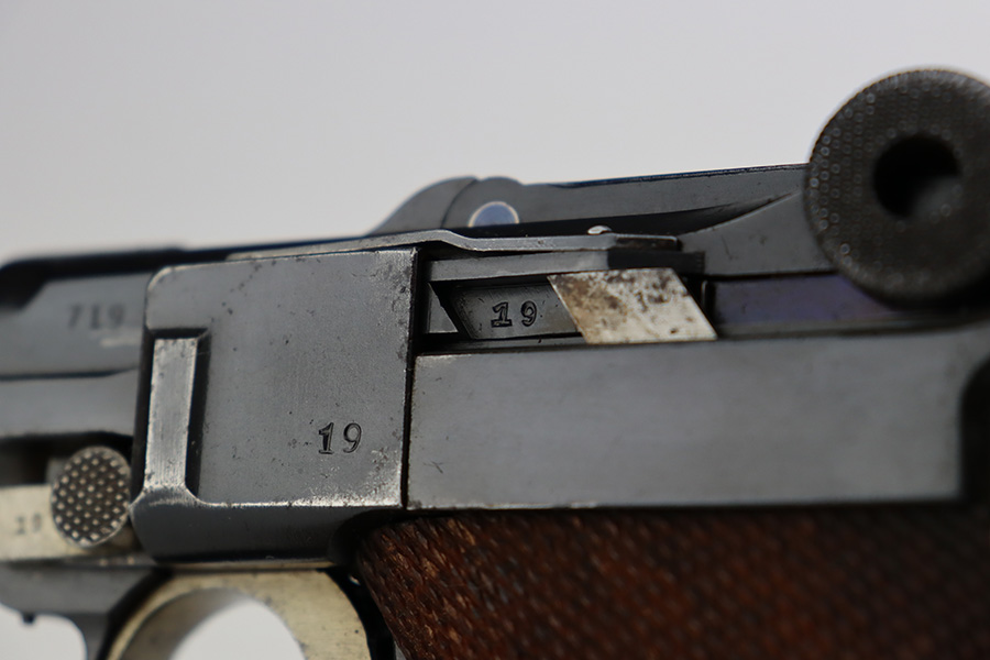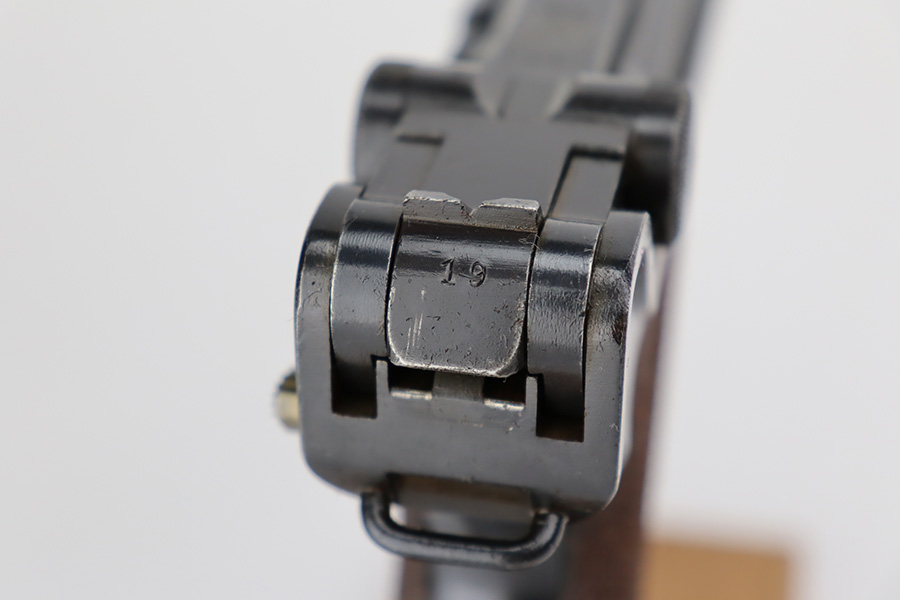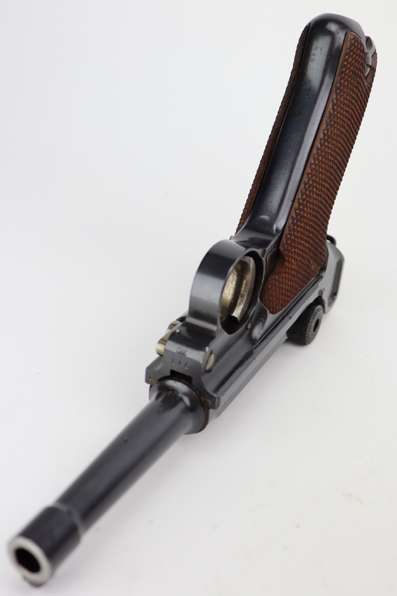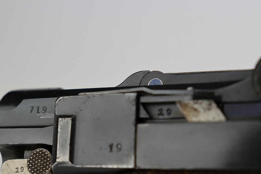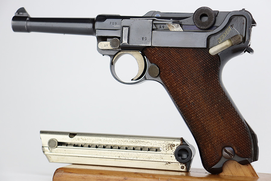 8/2/23 – This is a very nice example of a DWM Luger from 1917. It was originally issued to the Imperial German military as evidenced by the Imperial military acceptance proofs on the right side of the slide. It was later reworked and issued to the German police force, as evidenced by the added police sear safety and replaced barrel with Weimar-era Eagle proofs. The gun has retained about 97% of its original finish. There is just very minor wear around the muzzle and on the side plate and some freckling on the grip straps. Fitted with minty un-numbered wood grips – the left panel is marked “S/42”, a WW2-era armorers replacement. Comes with a post-war Erma magazine. Mint bore.