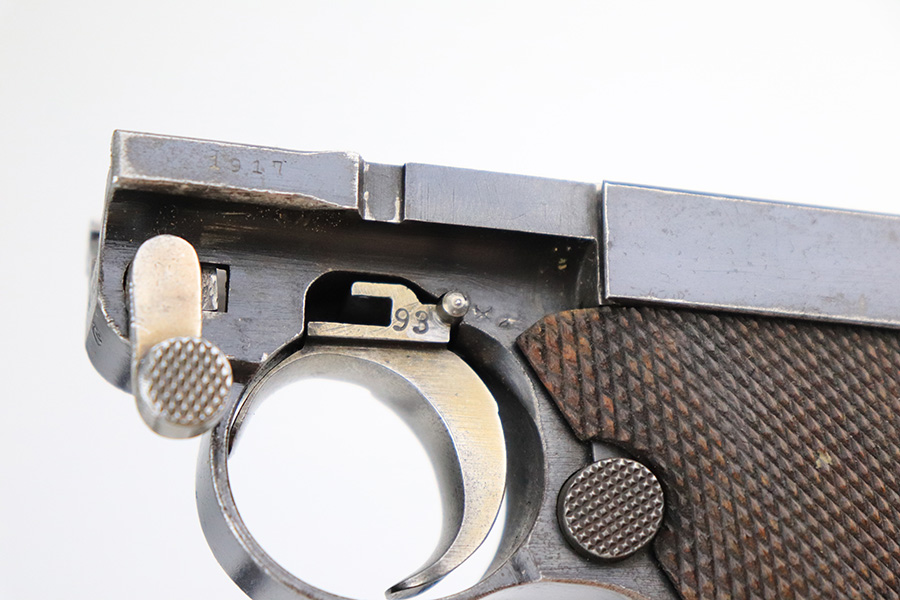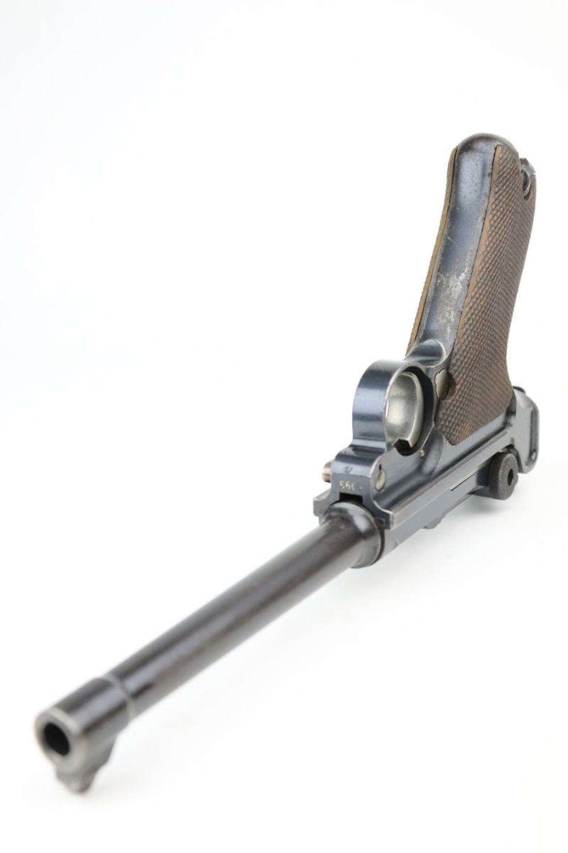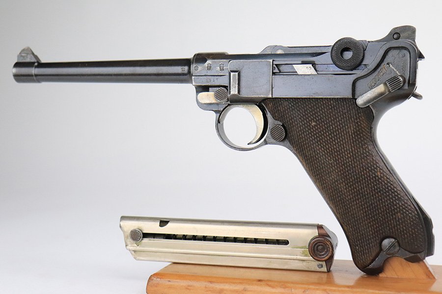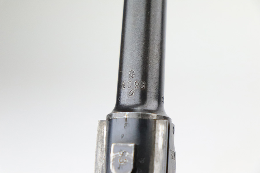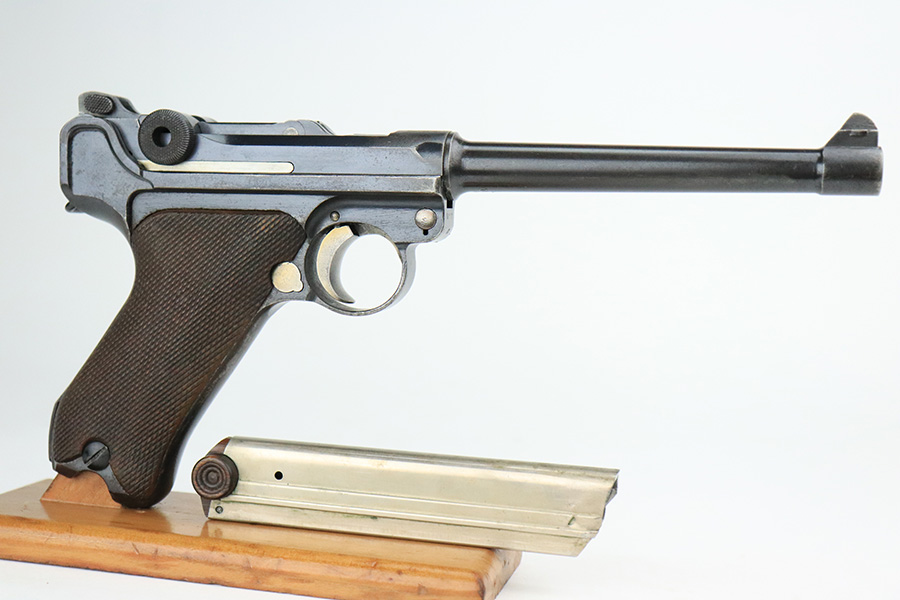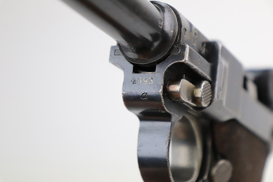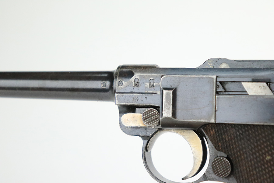 11/23/22 – This is a nice example of a DWM Navy Luger issued to the Imperial German Navy in 1917. The gun is all matching (except for the firing pin which is un-numbered) and has the proper “Crown M” Imperial Navy acceptance proofs. It has retained roughly 80% of its original bluing. Most of the finish loss is on the chamber, around the side plate, and on both grip straps (where there is also noticeable pin-pricking). Light scratchy wear and minor oxidation along the barrel. Areas of very light pin-pricking throughout. One very light scratch on the side plate. Comes with slightly worn un-numbered wood grips. Comes with a mismatched Navy-style magazine, but we do not believe the wood bottom is original. The rifling in the bore is a bit worn with minor pitting throughout.