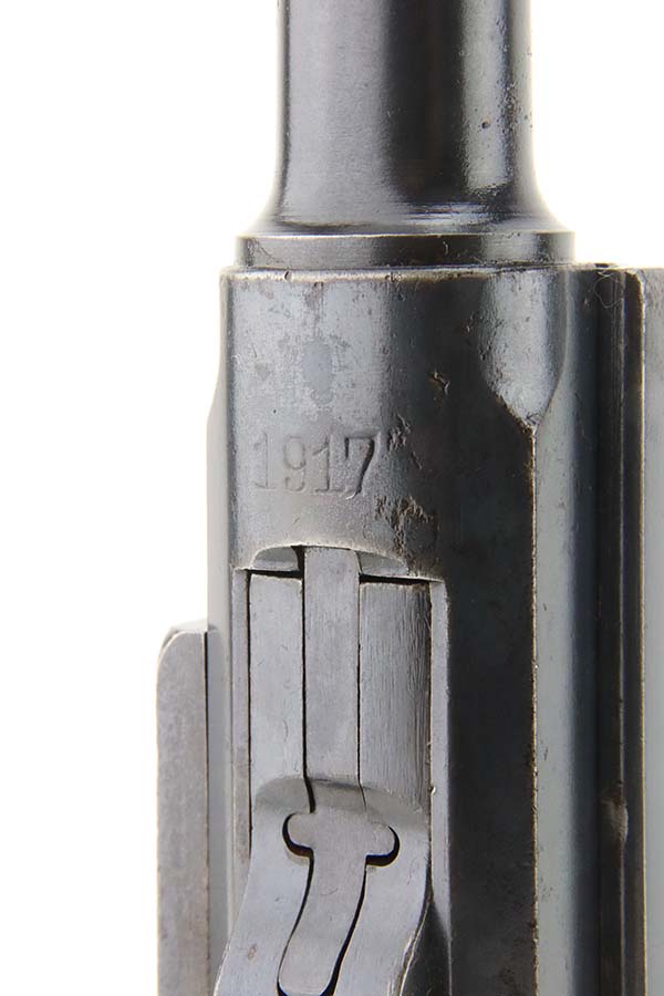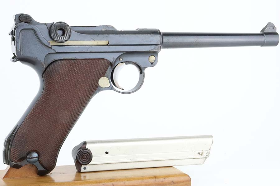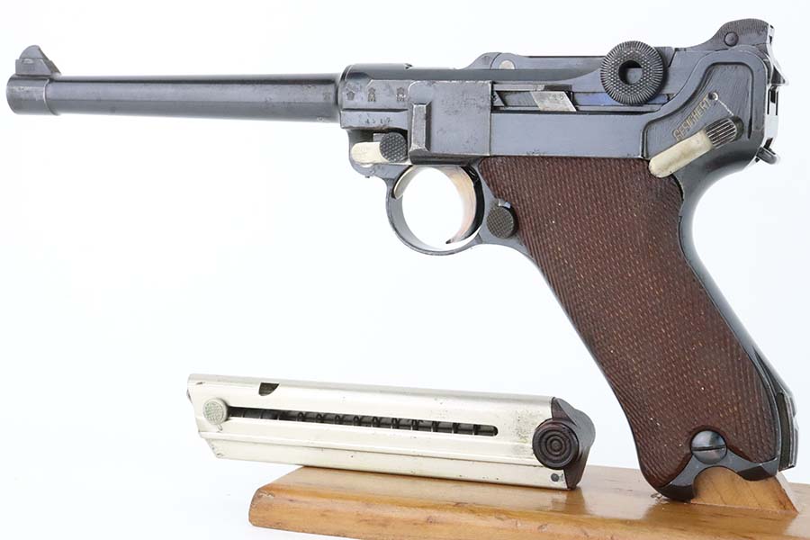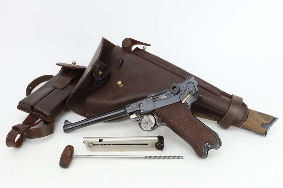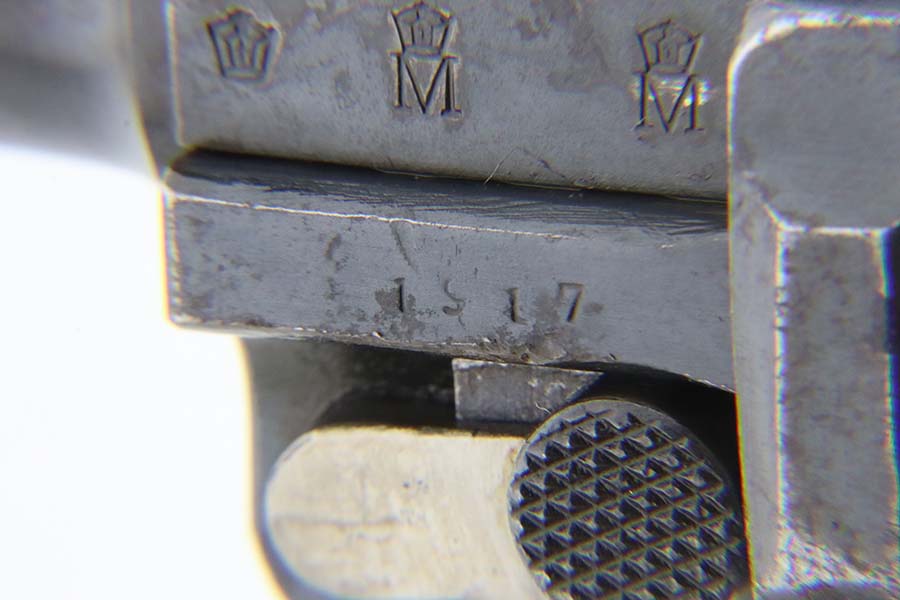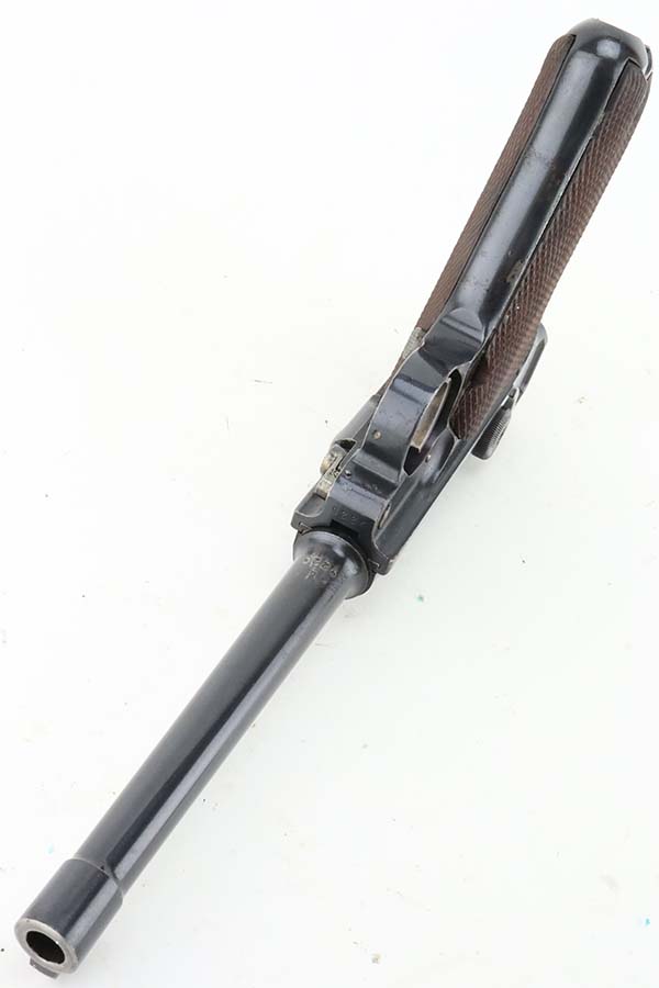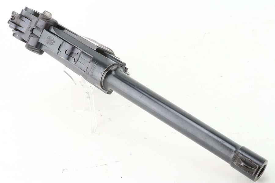 3/12/24 – This is a very nice example of a DWM Navy Luger issued to the Imperial German Navy in 1917. All matching with the proper “Crown M” Navy acceptance proofs. The gun comes as a complete rig with reproduction accessories: holster, wood stock, magazine pouch, cleaning rod, and shoulder strap. Comes with one magazine. The gun itself has retained about 97% of its original finish. While there is very little actual finish loss, there are areas of light spotty oxidation and minor pitting here and there. Fitted with matching-numbered wood grips. Excellent bore with great rifling.