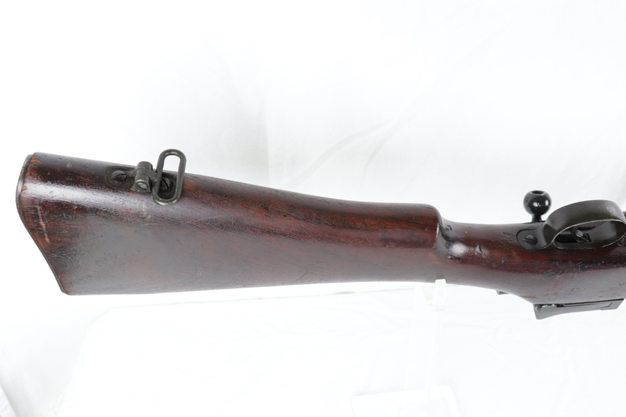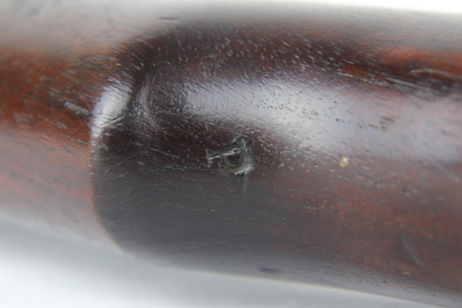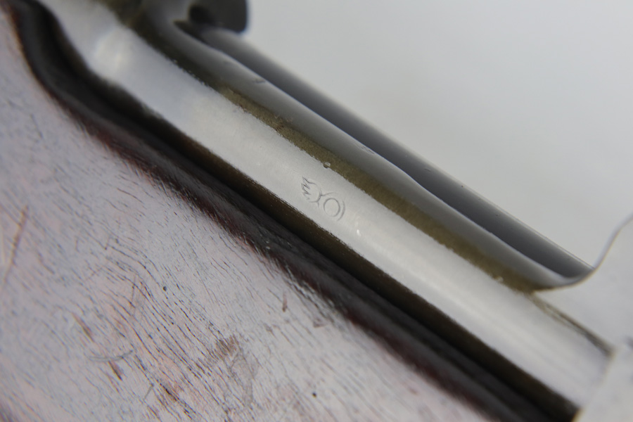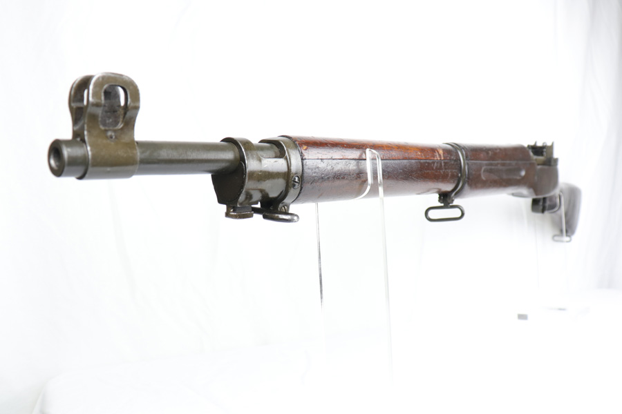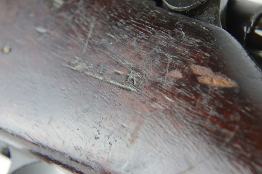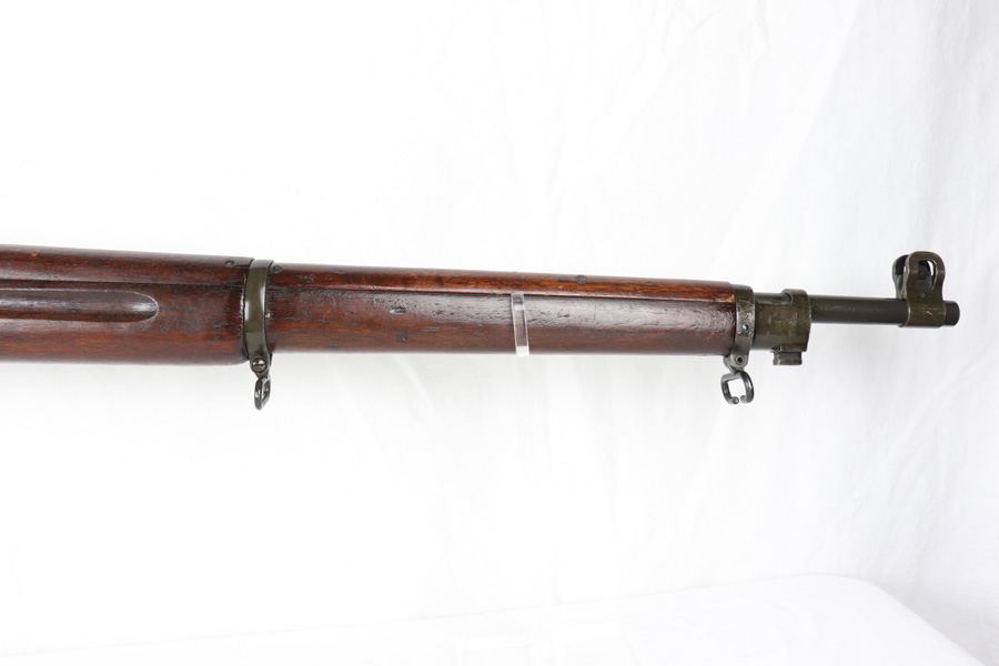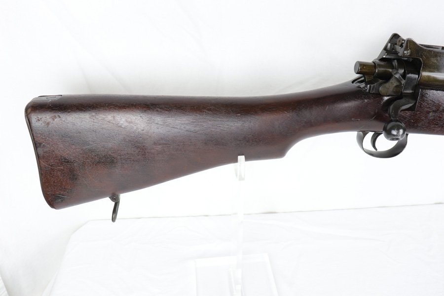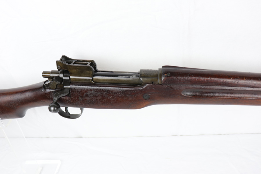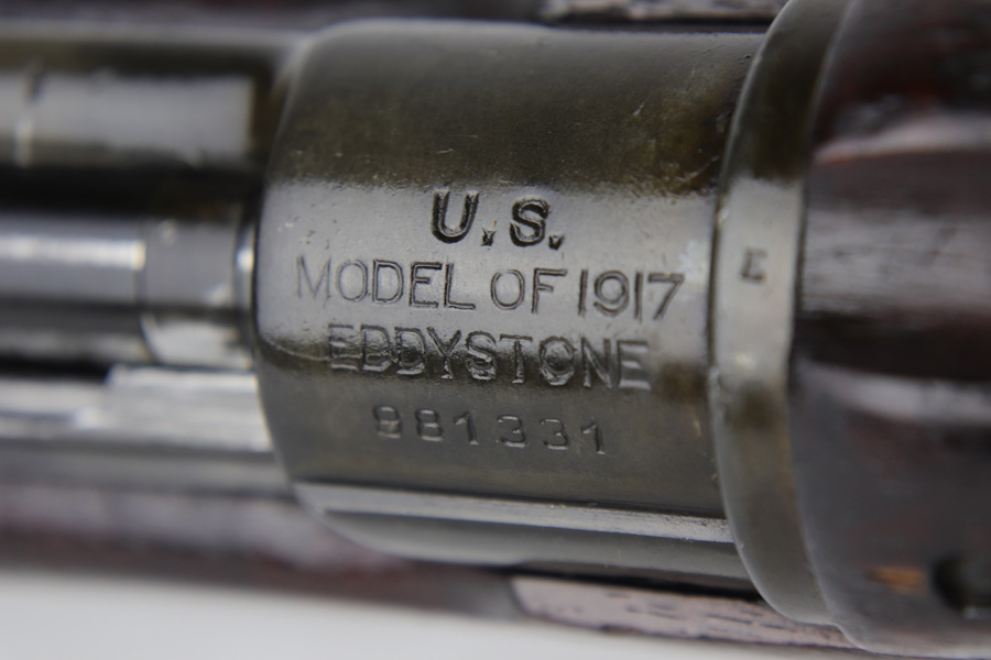 10/25/18 – This is an original Eddystone Model 1917. This rifle is a great example of what was called the “American Enfield” in WWI. The wood is in great condition with minor surface scratches, scuffs and dents (all normal wear and aging). The metal parts are in 75%+ condition with few light scratches. Overall the metal has a nice patina. The finish is thinning on the barrel. The action is smooth and the bore is in excellent condition. The barrel is marked “J.A” with a flaming bomb underneath. The receiver and bolt are also both marked with flaming bombs, and there is a “T” proof stamp on the bolt. The wood is marked “P” behind the trigger guard and there is also an indistinguishable mark directly behind the trigger guard (might be “SG”). The left side of the wood has a maker / inspector stamp. American arms companies were contracted by the British government in WWI to produce the Model of 1917. This particular gun was produced by Eddystone in 1918. No import stamps.