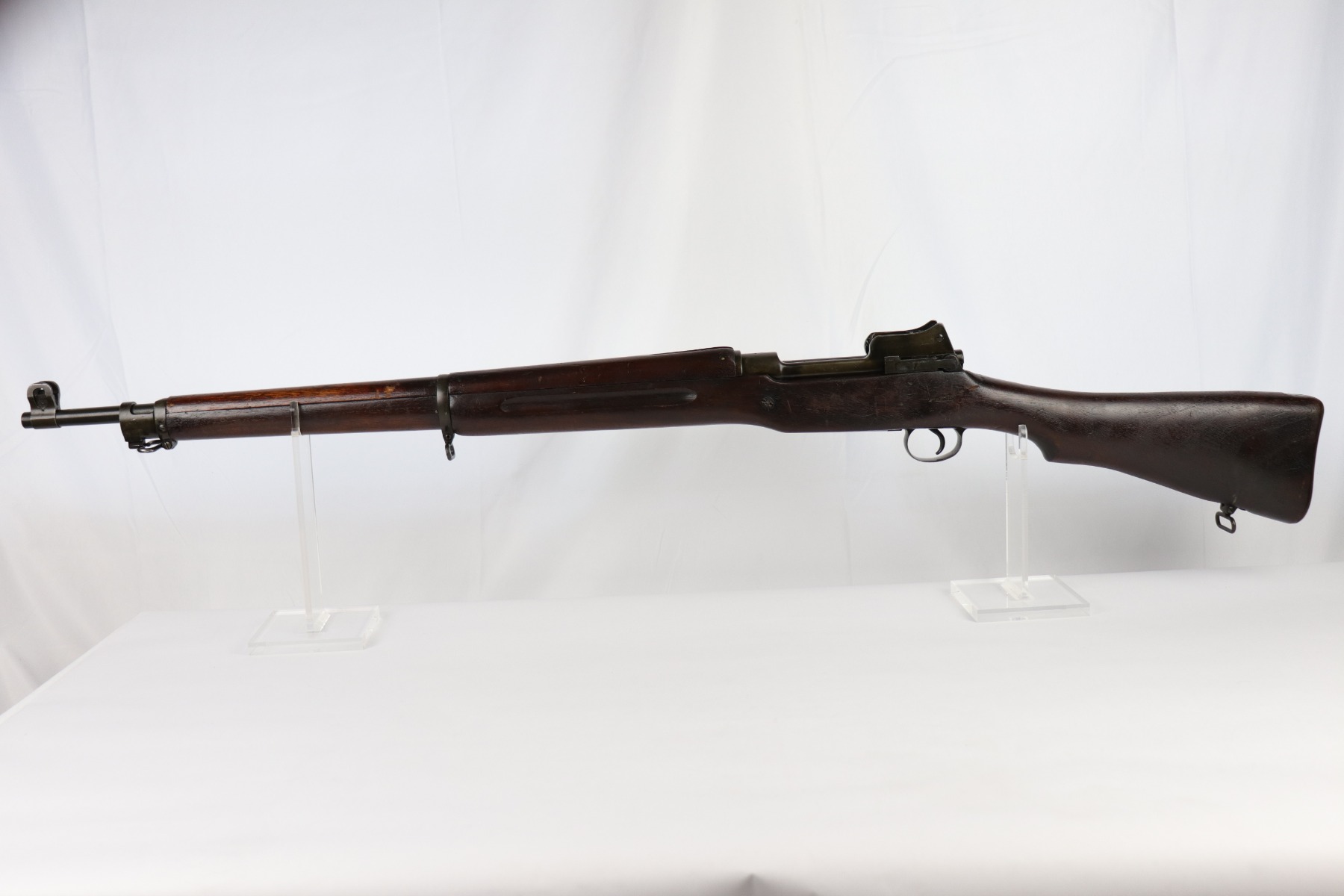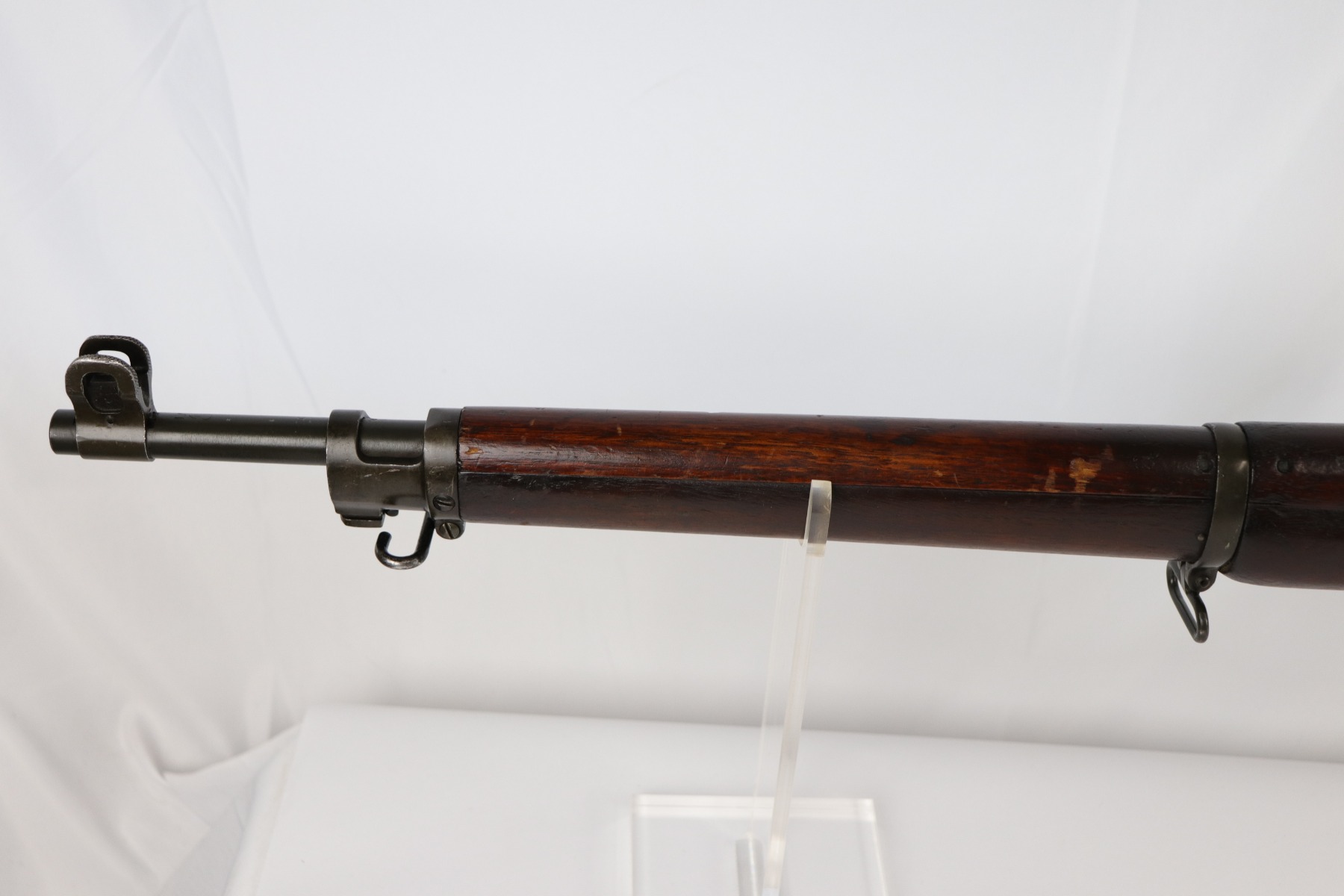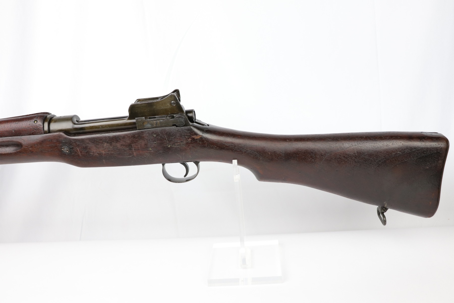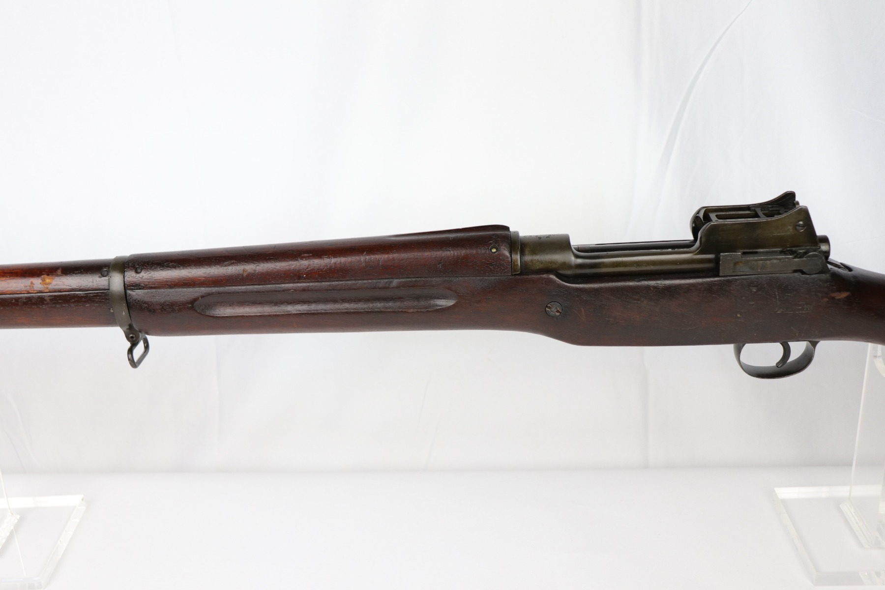 10/25/18 – This is an original Eddystone Model 1917. This rifle is a great example of what was called the “American Enfield” in WWI. The wood is in great condition with minor surface scratches, scuffs and dents (all normal wear and aging). The metal parts are in 75%+ condition with few light scratches. Overall the metal has a nice patina. The finish is thinning on the barrel. The action is smooth and the bore is in excellent condition. The barrel is marked “J.A” with a flaming bomb underneath. The receiver and bolt are also both marked with flaming bombs, and there is a “T” proof stamp on the bolt. The wood is marked “P” behind the trigger guard and there is also an indistinguishable mark directly behind the trigger guard (might be “SG”). The left side of the wood has a maker / inspector stamp. American arms companies were contracted by the British government in WWI to produce the Model of 1917. This particular gun was produced by Eddystone in 1918. No import stamps.