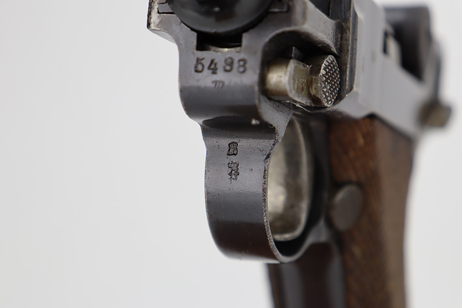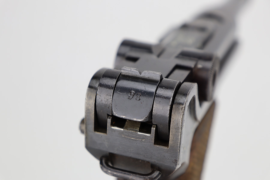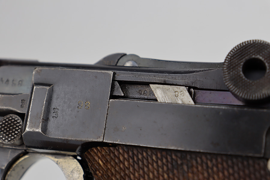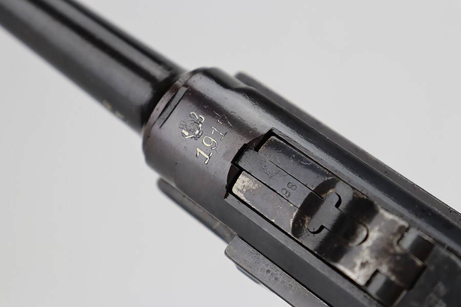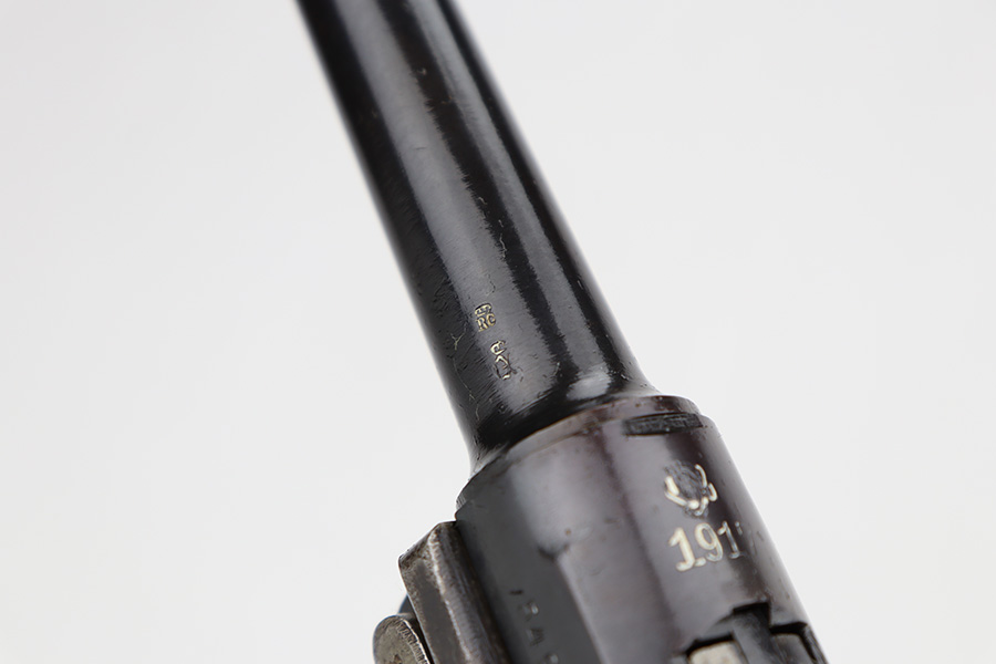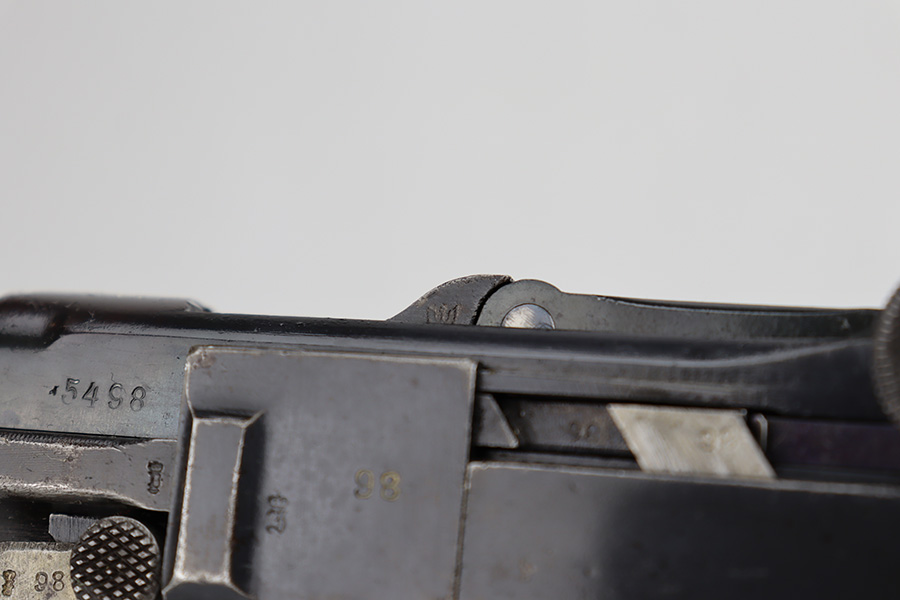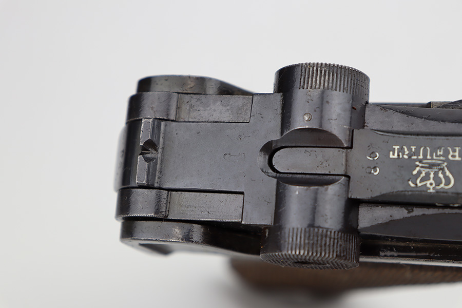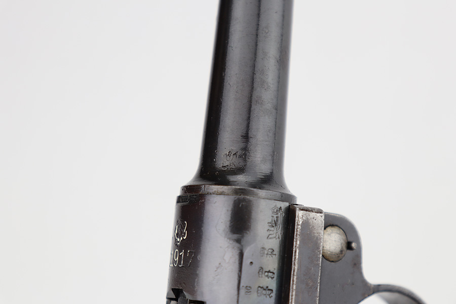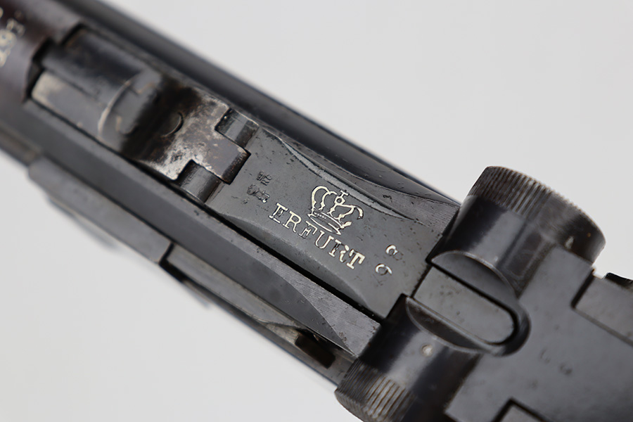6/14/23 – This is a potentially rare 1917 Erfurt Luger with Deathshead proof over the chamber. This is a post-WWI Nazi rework, and there are various theories on the Deathshead marking. These range from being issued to flamethrower units to being early SS, while some collectors don’t believe they were original. Research and decide for yourself. In any case, this one has all matching numbers, Imperial proofs on the slide, and tiny “Crown RC” markings throughout. Comes with a matching-numbered “Crown RC” marked magazine. We believe this gun has been arsenal-refinished with very minor wear around the muzzle, on the side plate, on the side rails, and on the front toggle link. Brown patina and pin-pricking on the grip straps. A few small areas with tiny pits here and there. Fitted with matching-numbered, Erfurt-proofed grips. Mint bore. The hold-open does not work properly with this magazine.