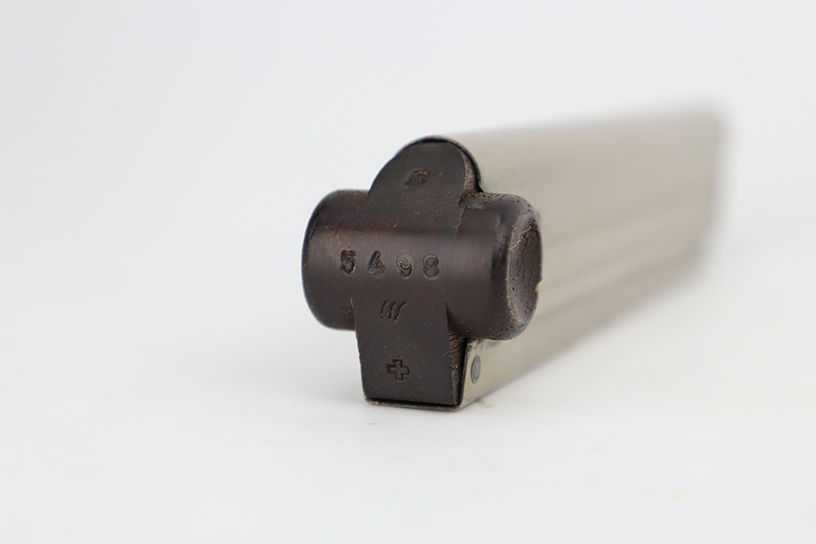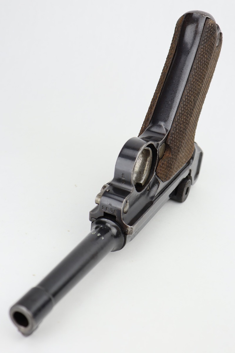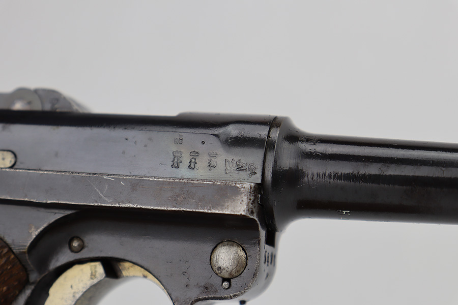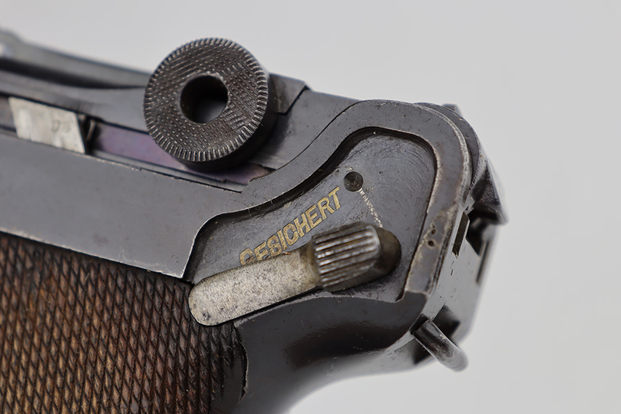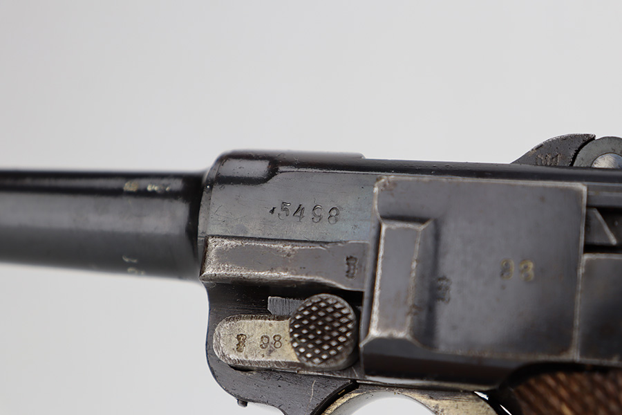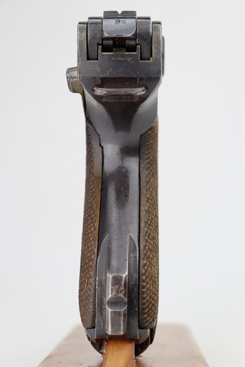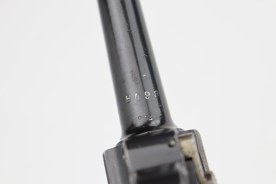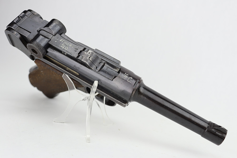6/14/23 – This is a potentially rare 1917 Erfurt Luger with Deathshead proof over the chamber. This is a post-WWI Nazi rework, and there are various theories on the Deathshead marking. These range from being issued to flamethrower units to being early SS, while some collectors don’t believe they were original. Research and decide for yourself. In any case, this one has all matching numbers, Imperial proofs on the slide, and tiny “Crown RC” markings throughout. Comes with a matching-numbered “Crown RC” marked magazine. We believe this gun has been arsenal-refinished with very minor wear around the muzzle, on the side plate, on the side rails, and on the front toggle link. Brown patina and pin-pricking on the grip straps. A few small areas with tiny pits here and there. Fitted with matching-numbered, Erfurt-proofed grips. Mint bore. The hold-open does not work properly with this magazine.