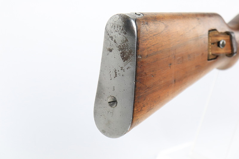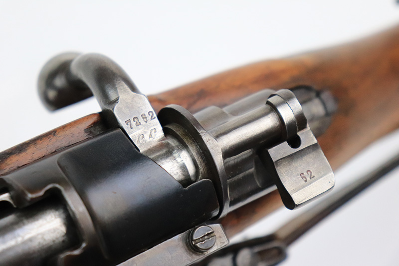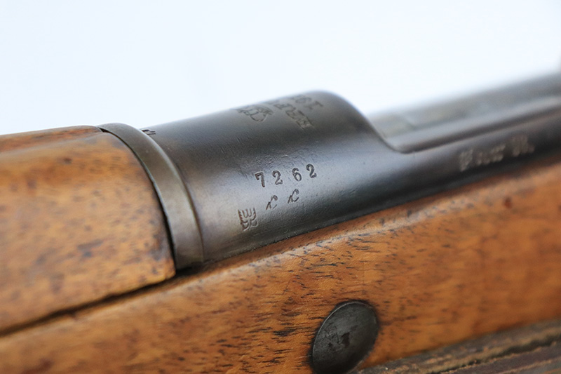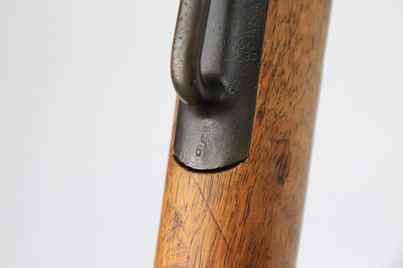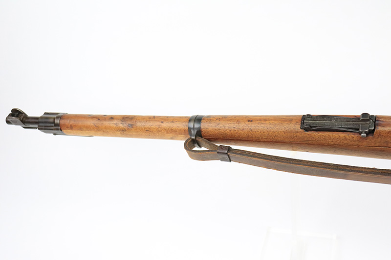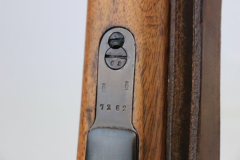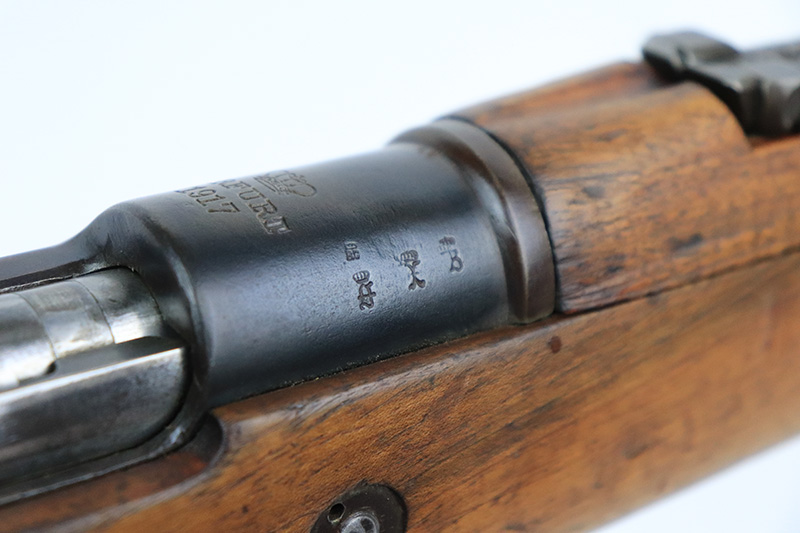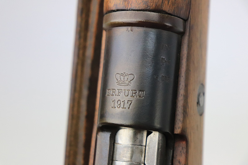 10/12/22 – This is a very nice example of an Erfurt K98 Carbine issued to the Imperial German military in 1917. It has the proper military acceptance proofs throughout. It appears to be all matching. However, the number on the butt plate is “72”, and it looks like the other two numbers are ground. So it is likely matching, but we can’t say for sure. The number on the stock appears to be matching as well, but the number is slightly obscured. No import marks. The gun is in very nice condition overall. There is minor wear and brown patina on the receiver and some minor wear on the front barrel band. The stock is nice with dings and bruises here and there, especially on the butt stock. It appears to have been lightly sanded. Excellent bore with strong rifling and just a hint of frosting in the grooves. Comes with a leather sling.