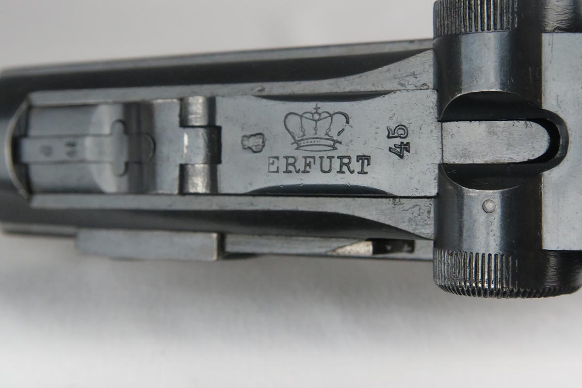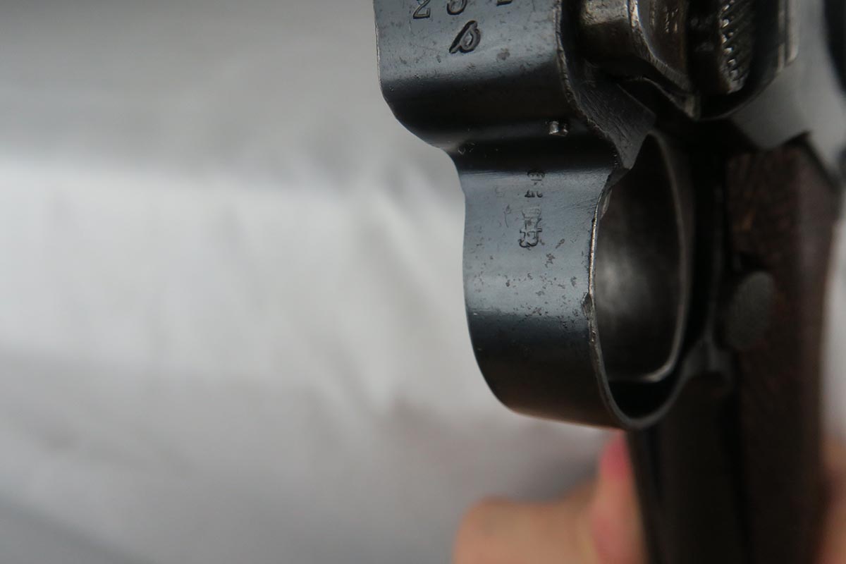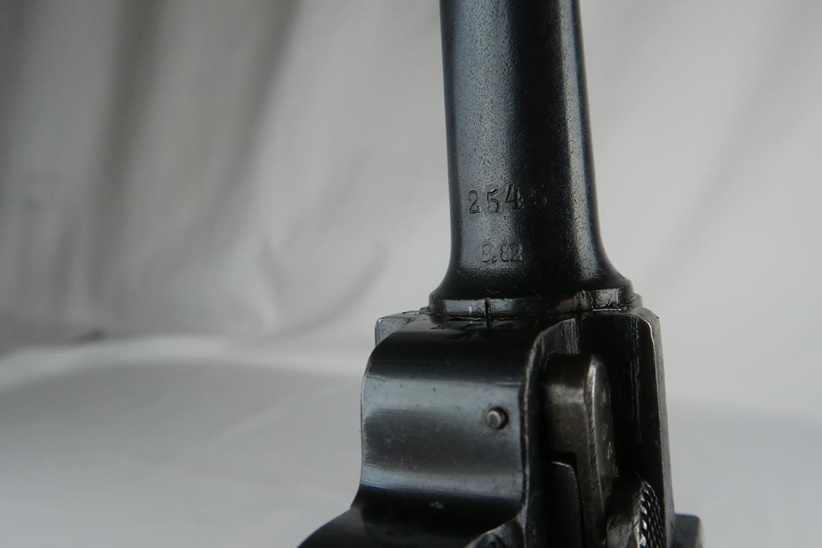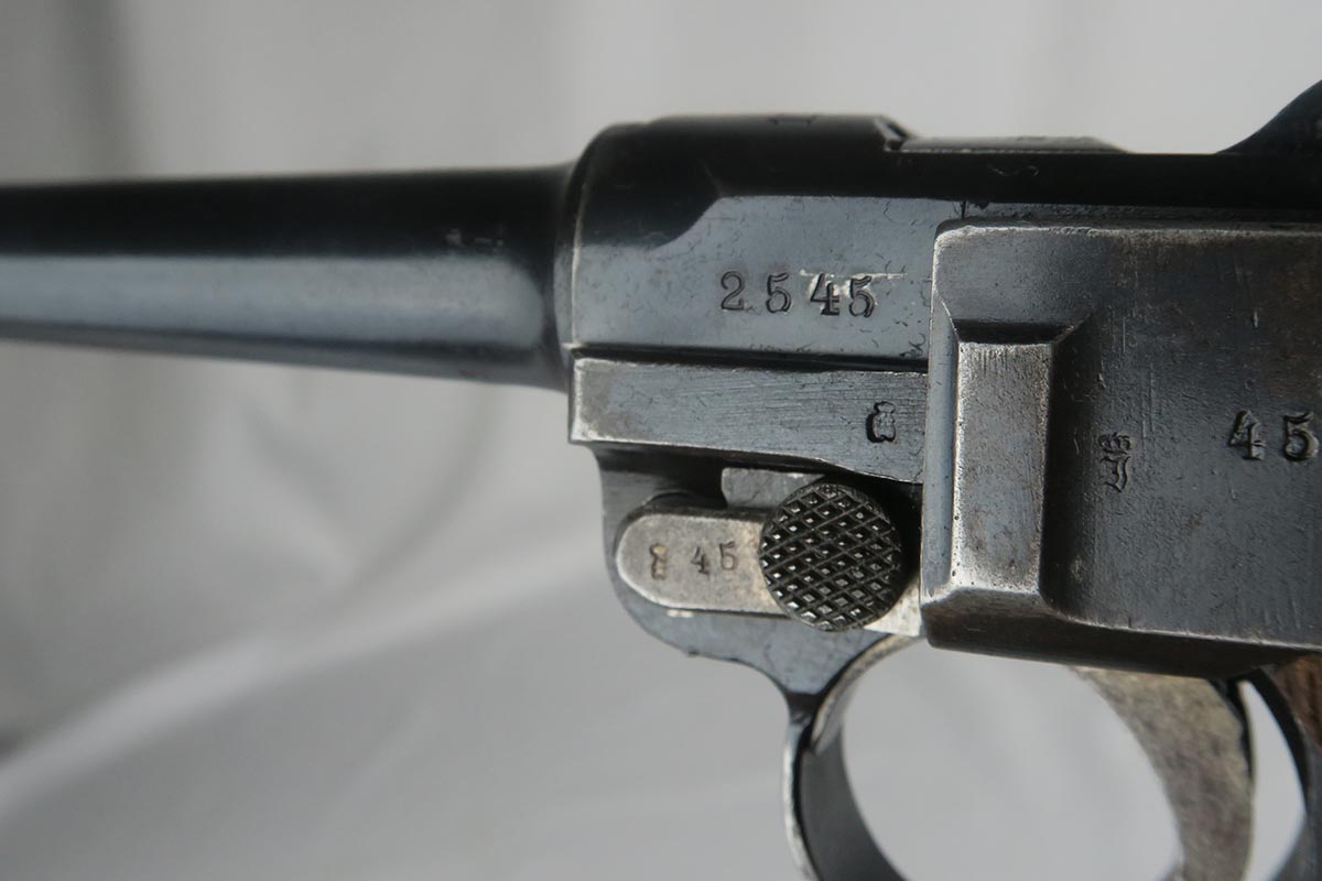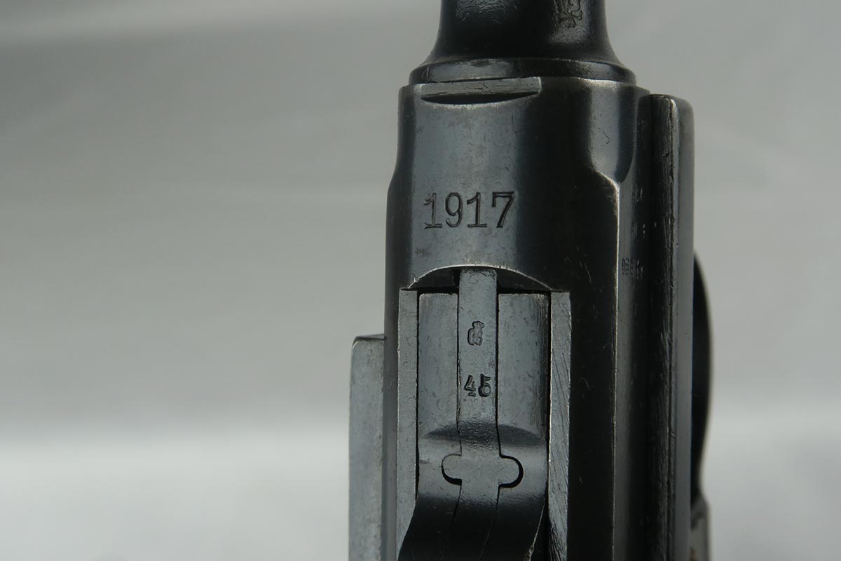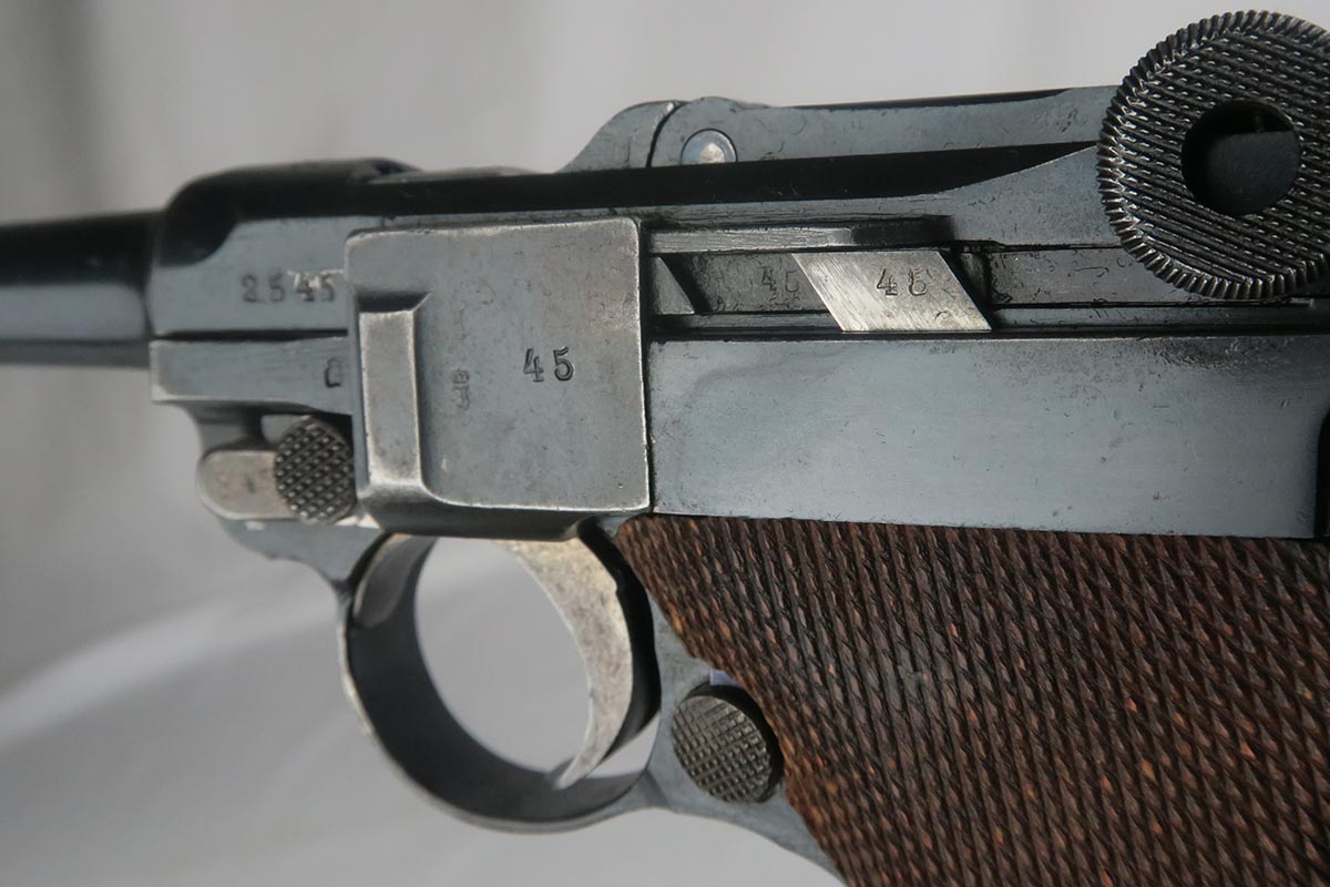 11/3/17 – All original and matching parts Erfurt luger from 1917.  The bluing rates at maybe 90% with wear in all the standard areas – sideplate, bottom of straps, rails, muzzle.  The magazine is a period correct Erfurt magazine but is numbered to a different gun, and has a thin surface crack in the base.  The grips are numbered to different pistols (mismatched).  The bore has decent rifling but some frosting and freckling throughout.