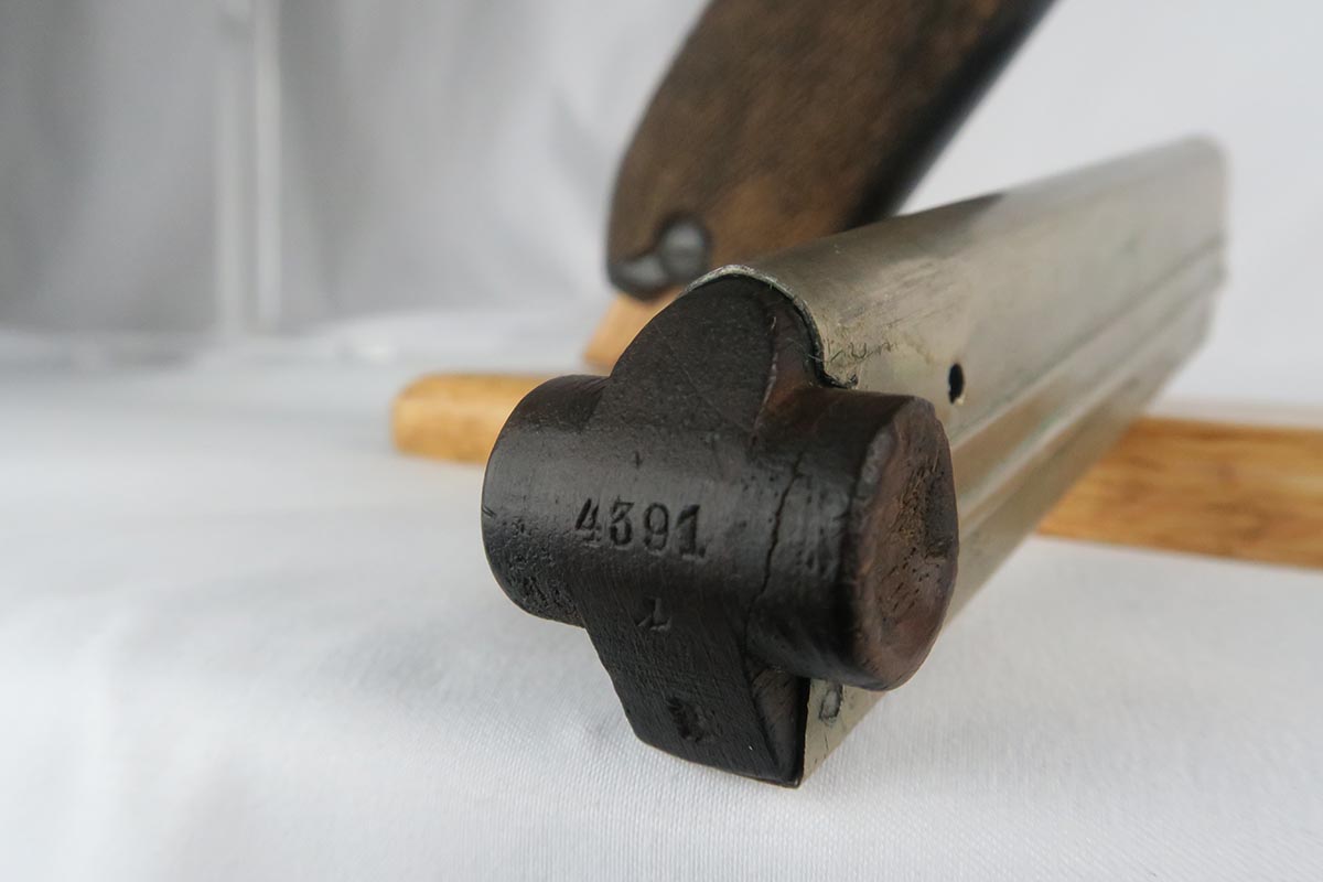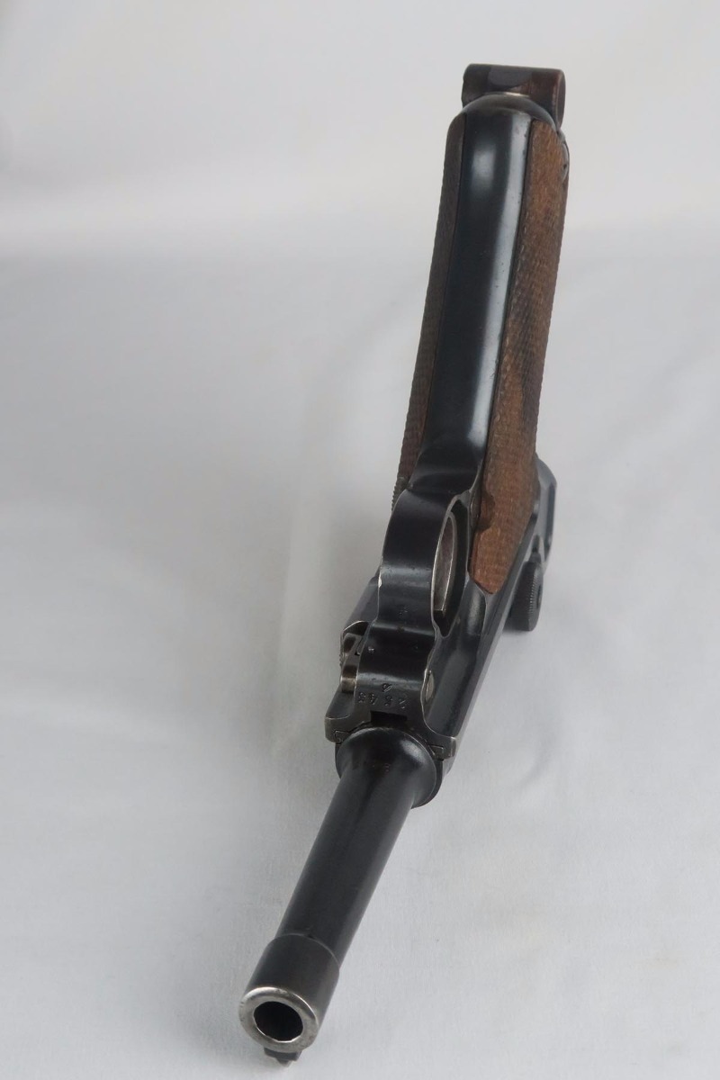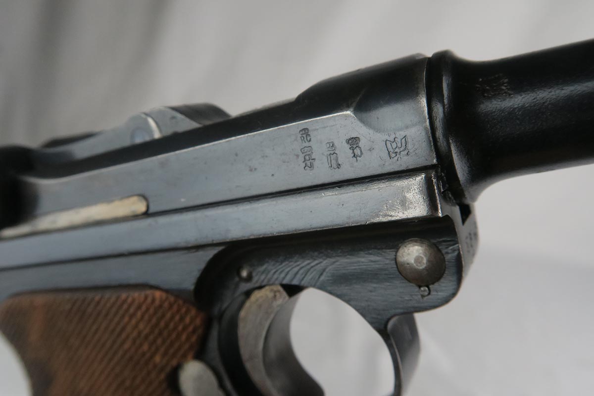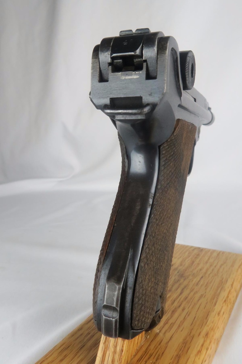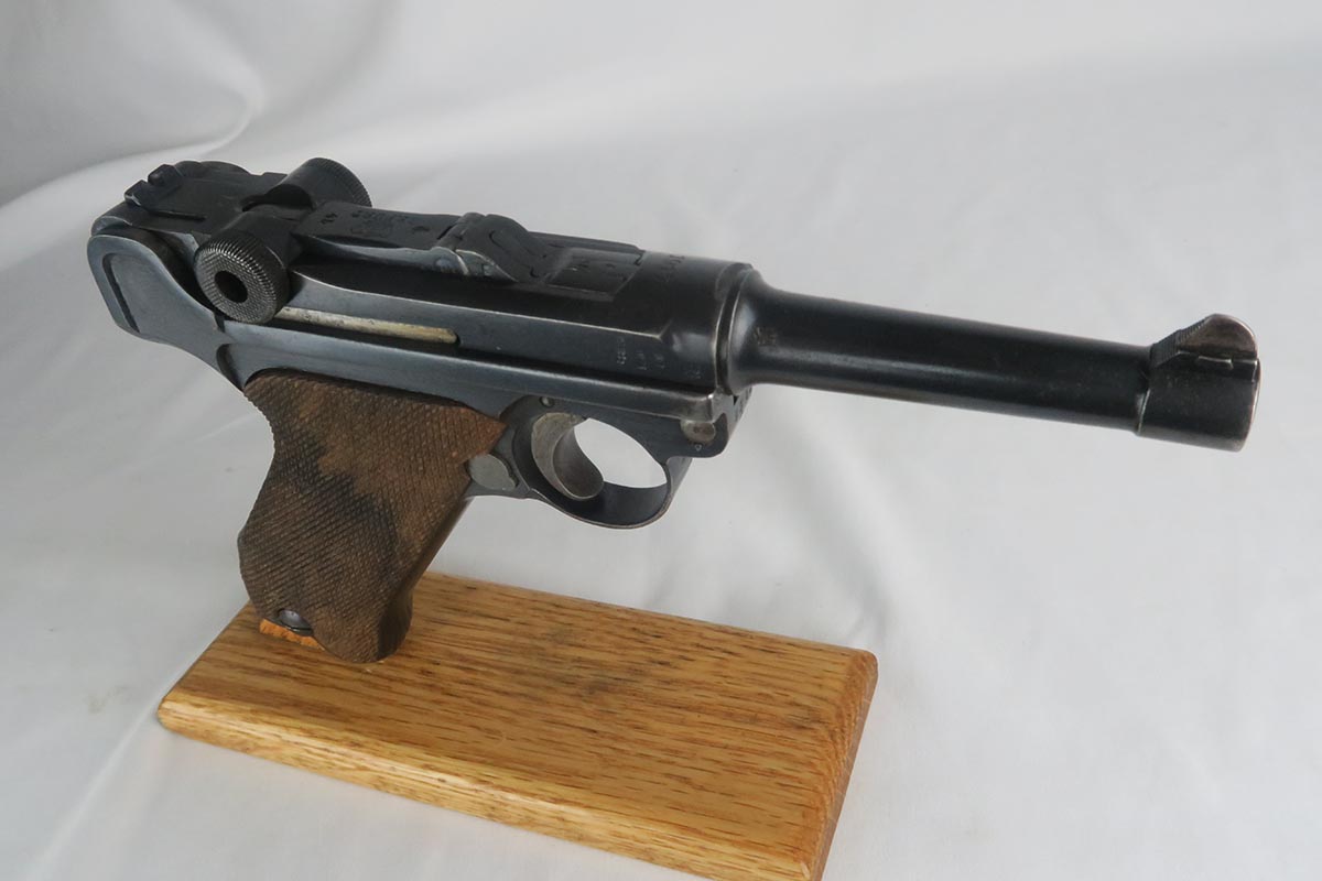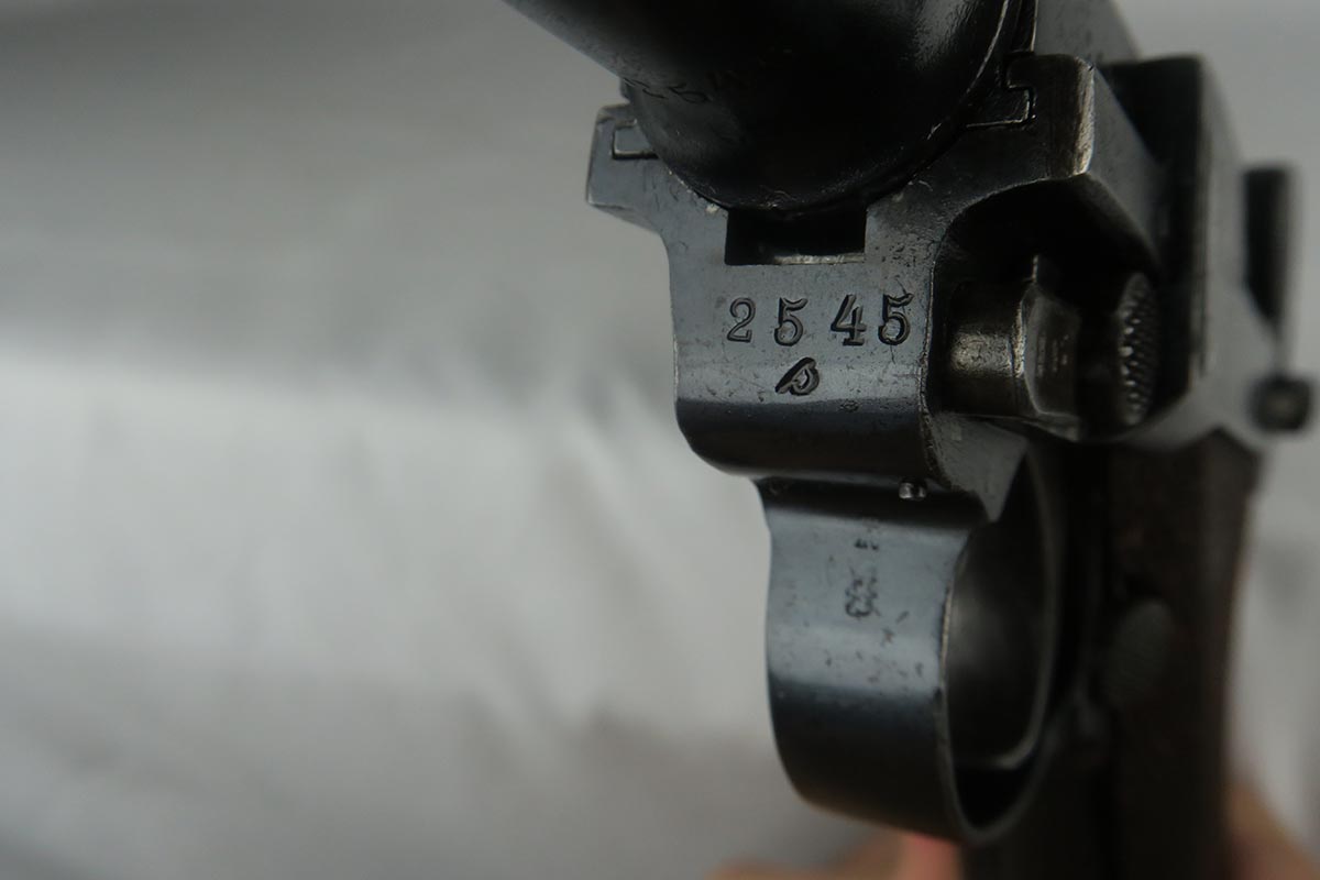 11/3/17 – All original and matching parts Erfurt luger from 1917.  The bluing rates at maybe 90% with wear in all the standard areas – sideplate, bottom of straps, rails, muzzle.  The magazine is a period correct Erfurt magazine but is numbered to a different gun, and has a thin surface crack in the base.  The grips are numbered to different pistols (mismatched).  The bore has decent rifling but some frosting and freckling throughout.