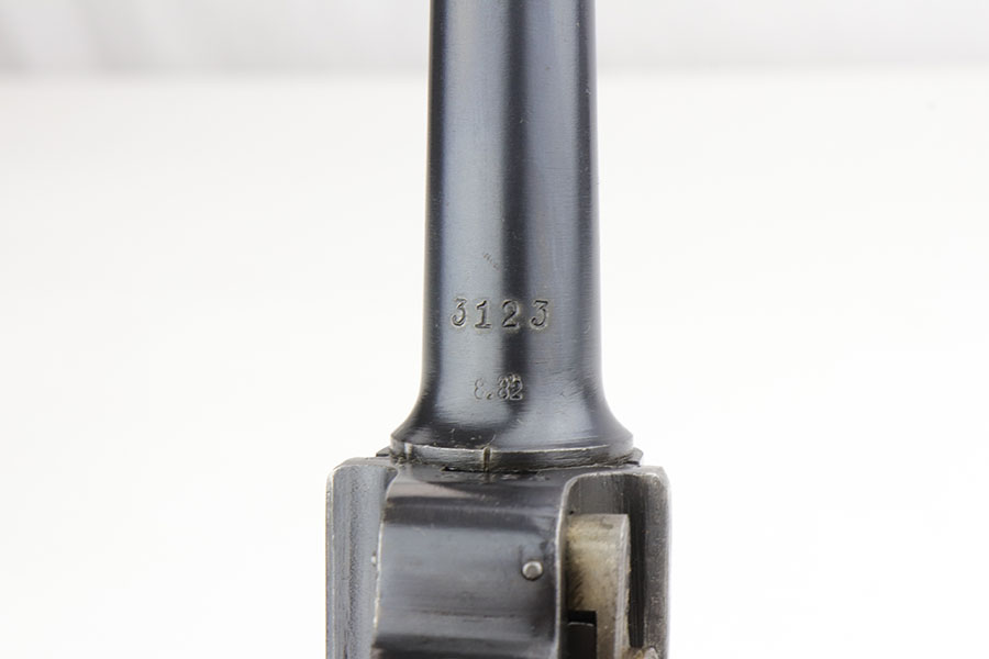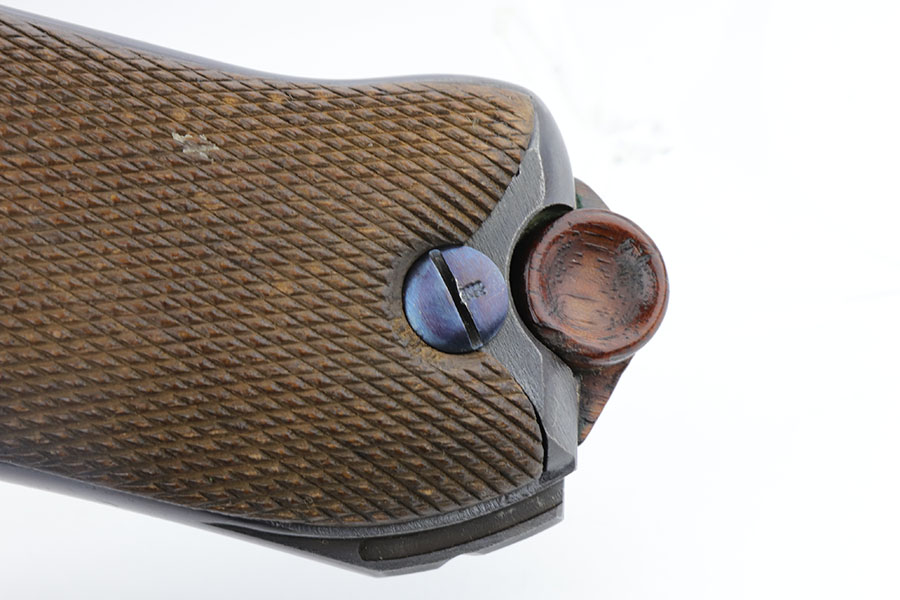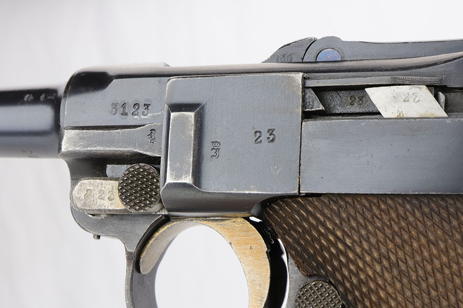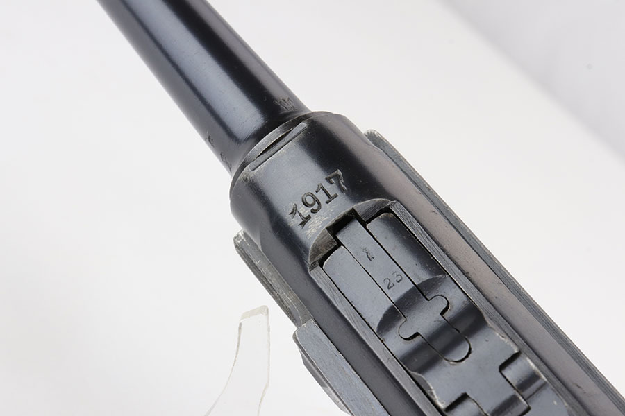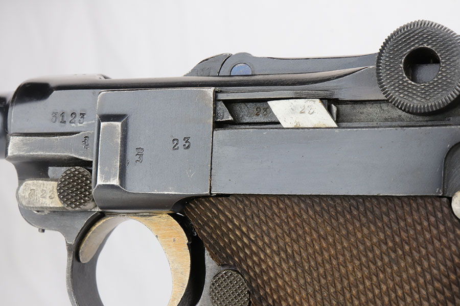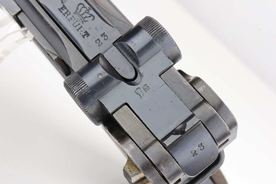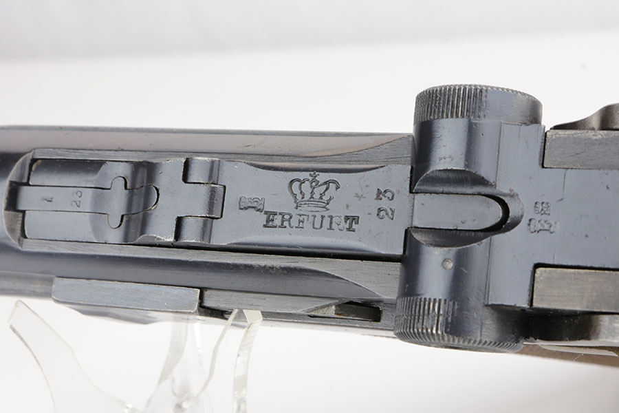 11/11/19 – This is an excellent example of an Erfurt-made WW1 era Luger. It most likely survived 2 World Wars in excellent condition – veteran bring back from WW2. We would rate the original finish to be about 96-97%. Most of the finish loss is very minor high-edge holster wear on the muzzle and on the side plate. One interesting detail about the Erfurt luger: there are Erfurt proof stamps on all small parts, even the grip screws. Check it out! All parts are original and matching. The magazine is unnumbered but Erfurt proofed. Most likely an armorers replacement – period correct. Grips are matching numbered and proofed – excellent, and sharp diamonds. The bore is also shiny and strong. The original 1918 dated holster is in minty condition. Great leather and stitching. We can sell the holster alone for $650 and the gun alone for $1850. For luger collectors, a WW1 Luger like this is about as good as they come.