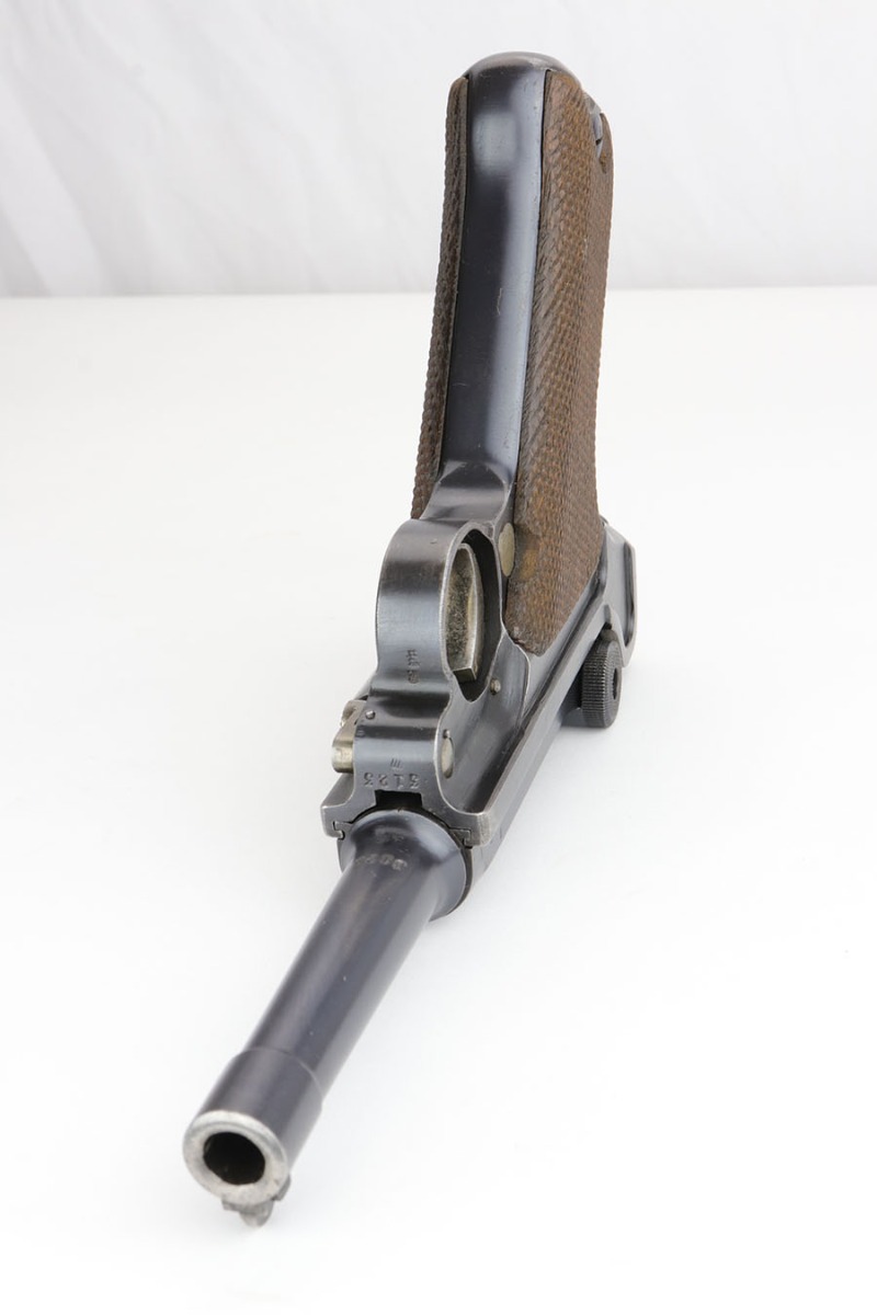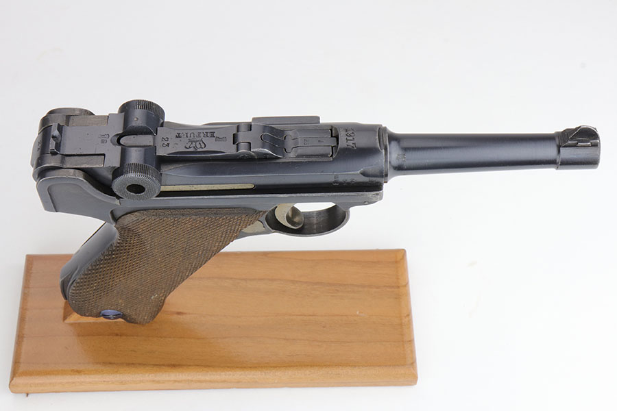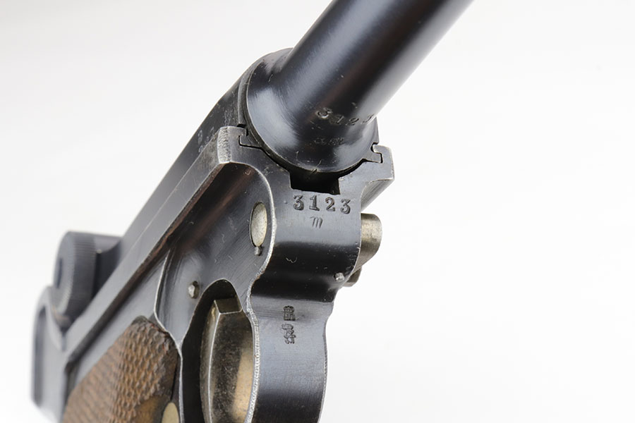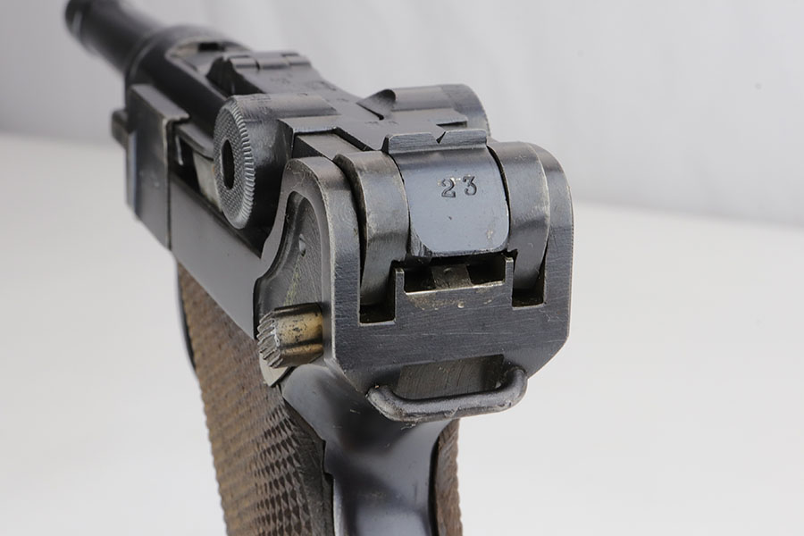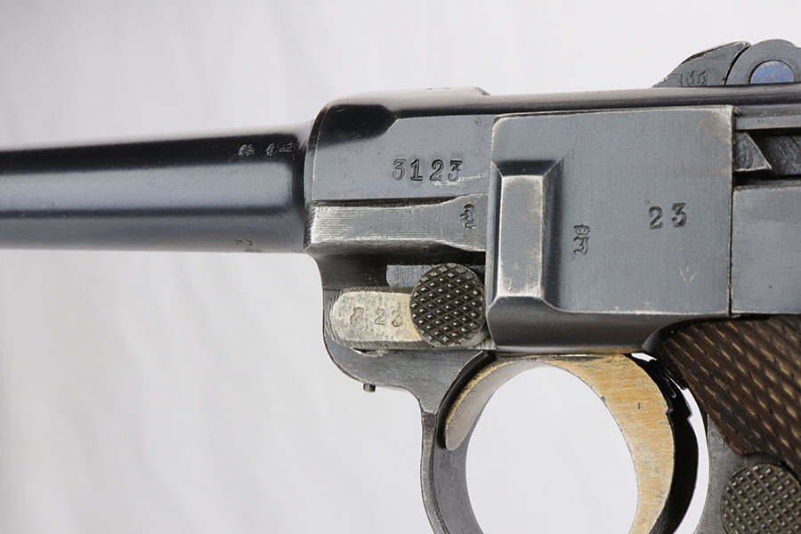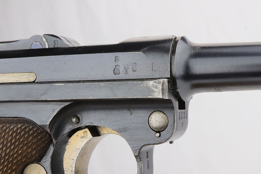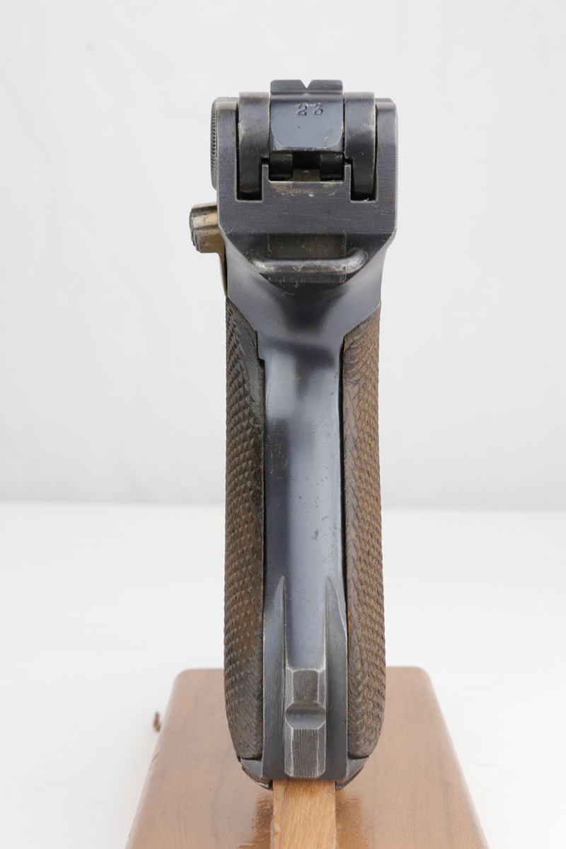 11/11/19 – This is an excellent example of an Erfurt-made WW1 era Luger. It most likely survived 2 World Wars in excellent condition – veteran bring back from WW2. We would rate the original finish to be about 96-97%. Most of the finish loss is very minor high-edge holster wear on the muzzle and on the side plate. One interesting detail about the Erfurt luger: there are Erfurt proof stamps on all small parts, even the grip screws. Check it out! All parts are original and matching. The magazine is unnumbered but Erfurt proofed. Most likely an armorers replacement – period correct. Grips are matching numbered and proofed – excellent, and sharp diamonds. The bore is also shiny and strong. The original 1918 dated holster is in minty condition. Great leather and stitching. We can sell the holster alone for $650 and the gun alone for $1850. For luger collectors, a WW1 Luger like this is about as good as they come.