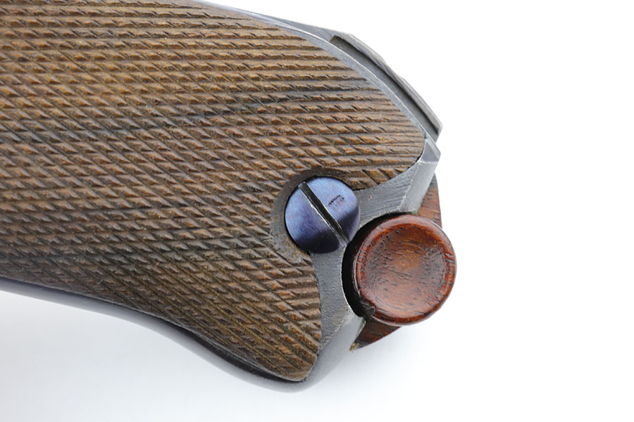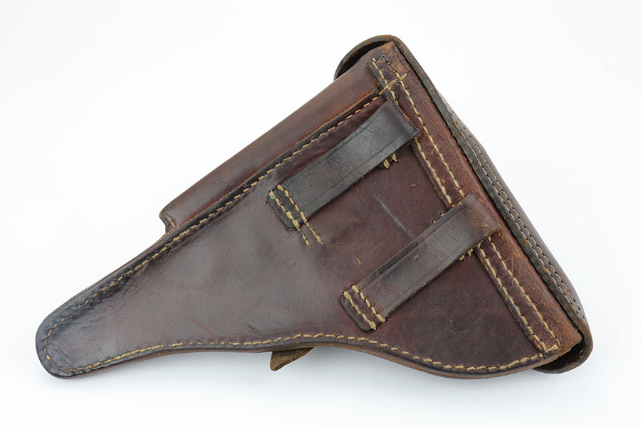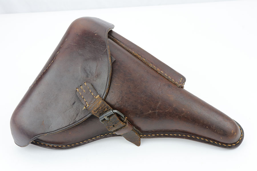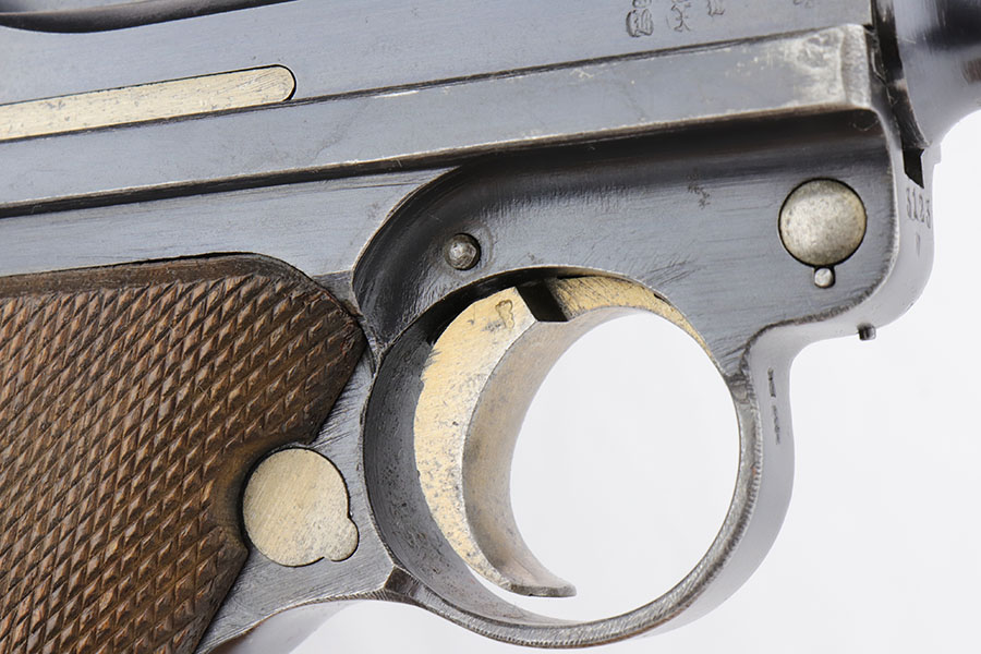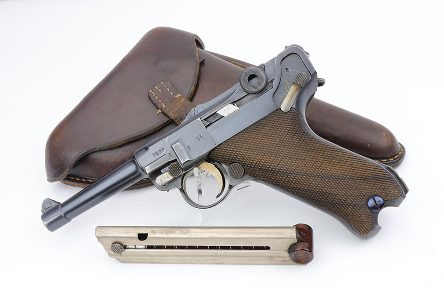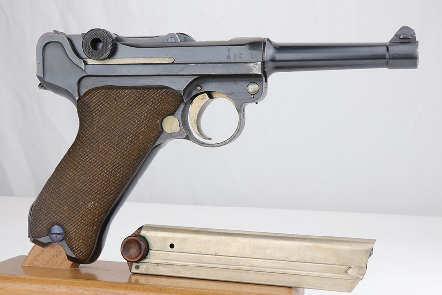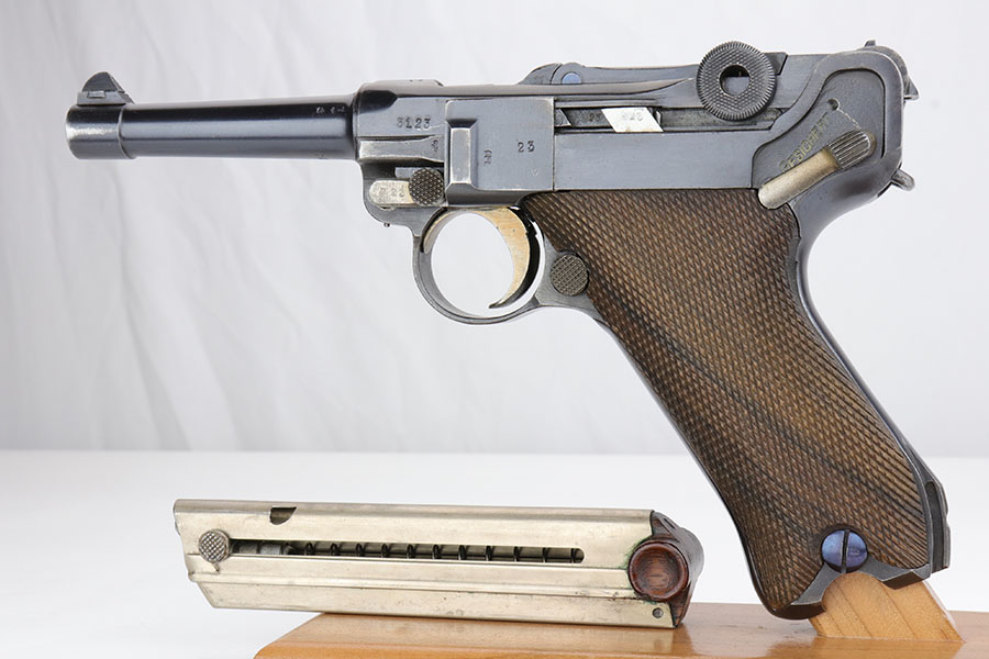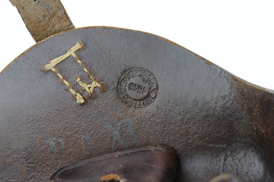 11/11/19 – This is an excellent example of an Erfurt-made WW1 era Luger. It most likely survived 2 World Wars in excellent condition – veteran bring back from WW2. We would rate the original finish to be about 96-97%. Most of the finish loss is very minor high-edge holster wear on the muzzle and on the side plate. One interesting detail about the Erfurt luger: there are Erfurt proof stamps on all small parts, even the grip screws. Check it out! All parts are original and matching. The magazine is unnumbered but Erfurt proofed. Most likely an armorers replacement – period correct. Grips are matching numbered and proofed – excellent, and sharp diamonds. The bore is also shiny and strong. The original 1918 dated holster is in minty condition. Great leather and stitching. We can sell the holster alone for $650 and the gun alone for $1850. For luger collectors, a WW1 Luger like this is about as good as they come.