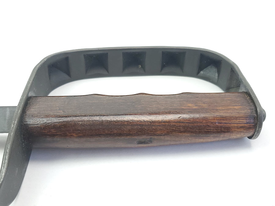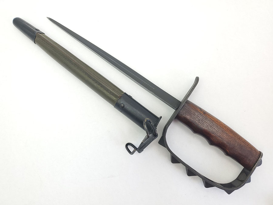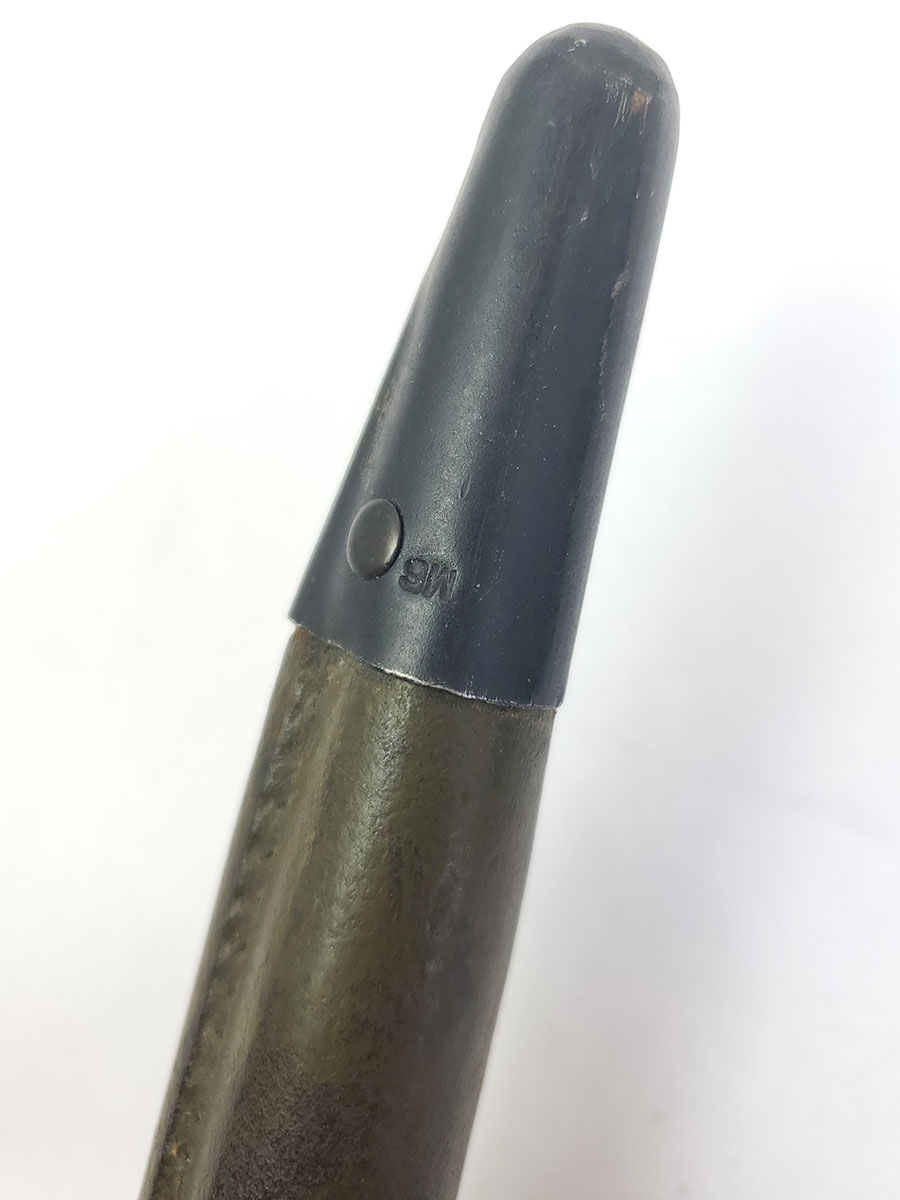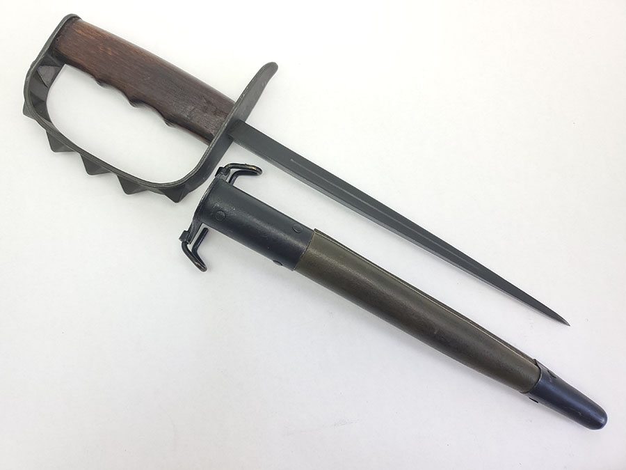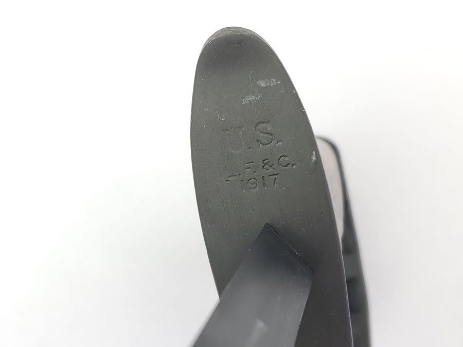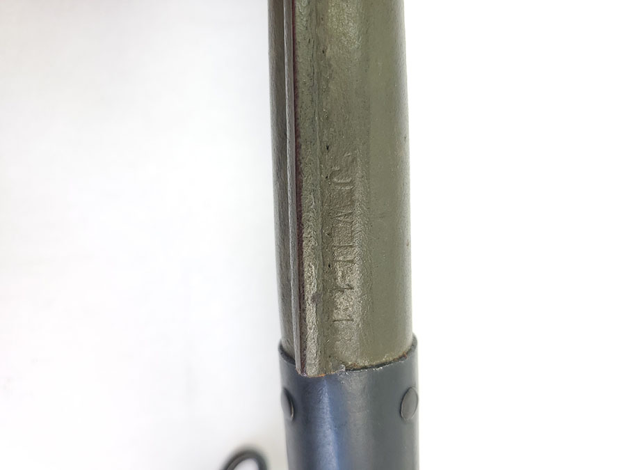 6/26/20 – This is an original 1917 L.F.&C. US fighting knife from WW1. The knife comes with an original scabbard, which is maker marked by JEWELL and dated 1918. The tip of the scabbard is very slightly bent, but this doesn’t affect functionality. Excellent condition overall with very nice bluing and proper stamps on the metal ends. The blade is similarly excellent, with very minimal finish loss on the blade, only light scabbard wear. The wood handle has one small chip – shown in photos. Very hard to find in this condition.