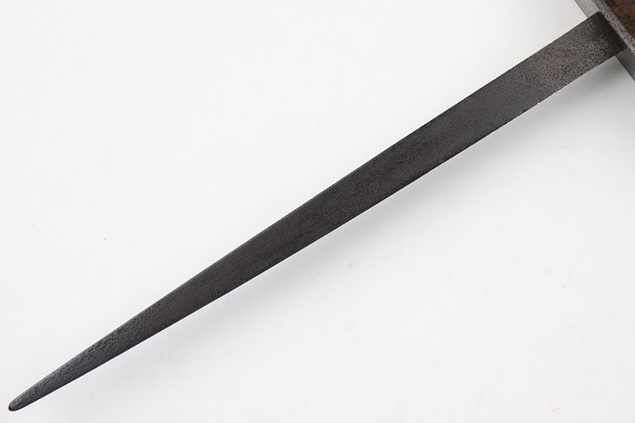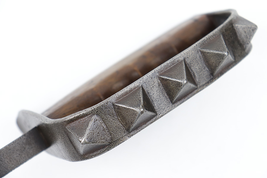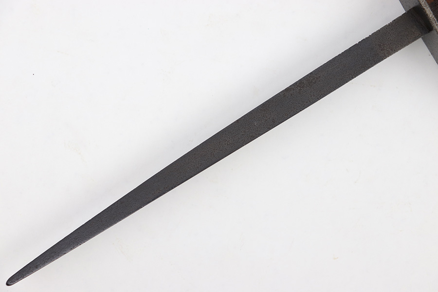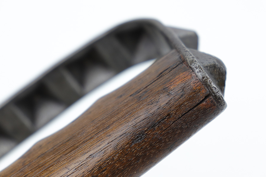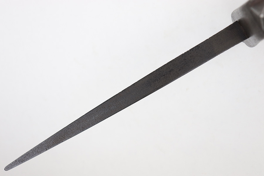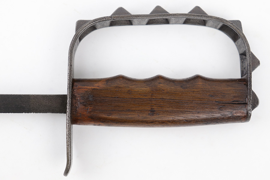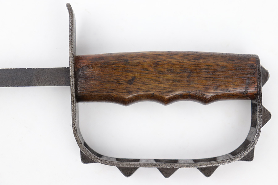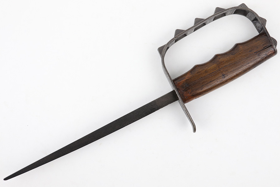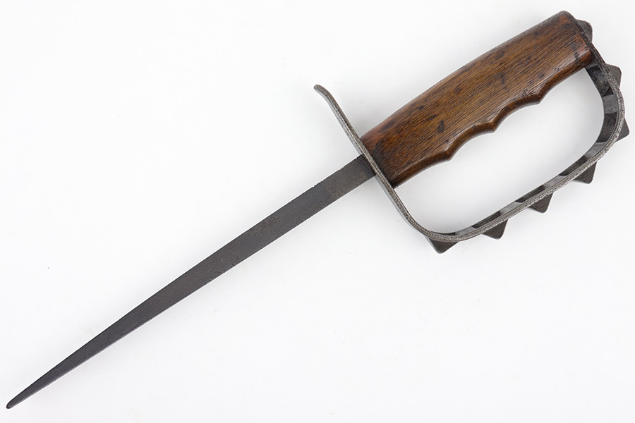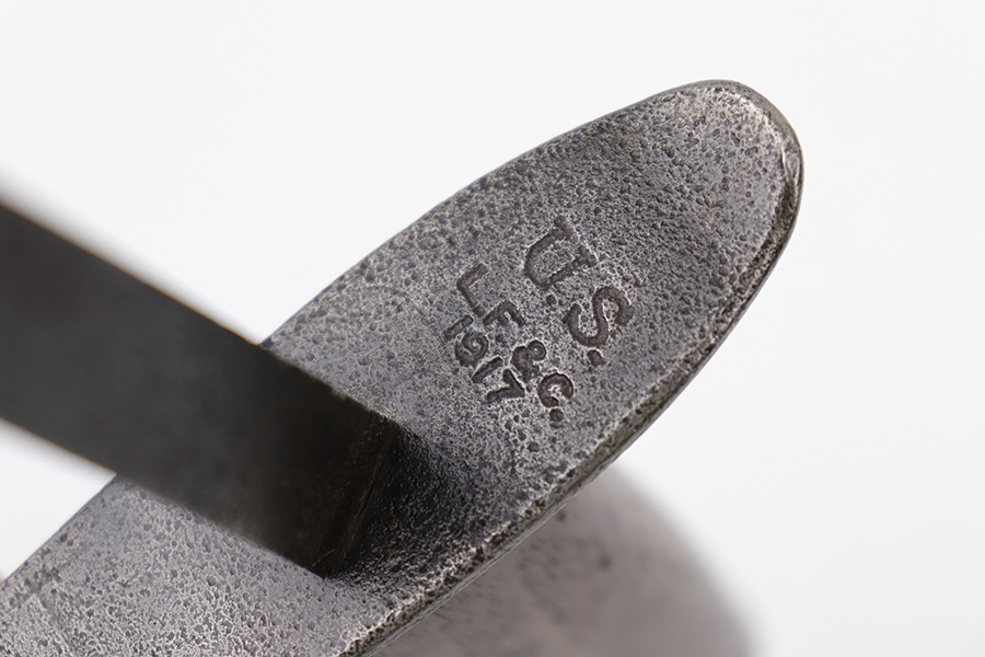4/18/23 – This is an original WW1 US Trench fighting knife by LF&C. The knife is all original with some honest wear throughout the blade and hand guard. The blade has the original finish still intact, but there’s pitting and dark surface patina throughout. The edge has a few small nicks and dings from use as well. The hand guard is missing most of the finish, but some still remains. Throughout the interior and exterior of the hand guard is similar pin-pricking and patina as that found on the blade. The handle has a few small cracks and chips, mostly near the base of the wood, but is still completely intact. No scabbard included.