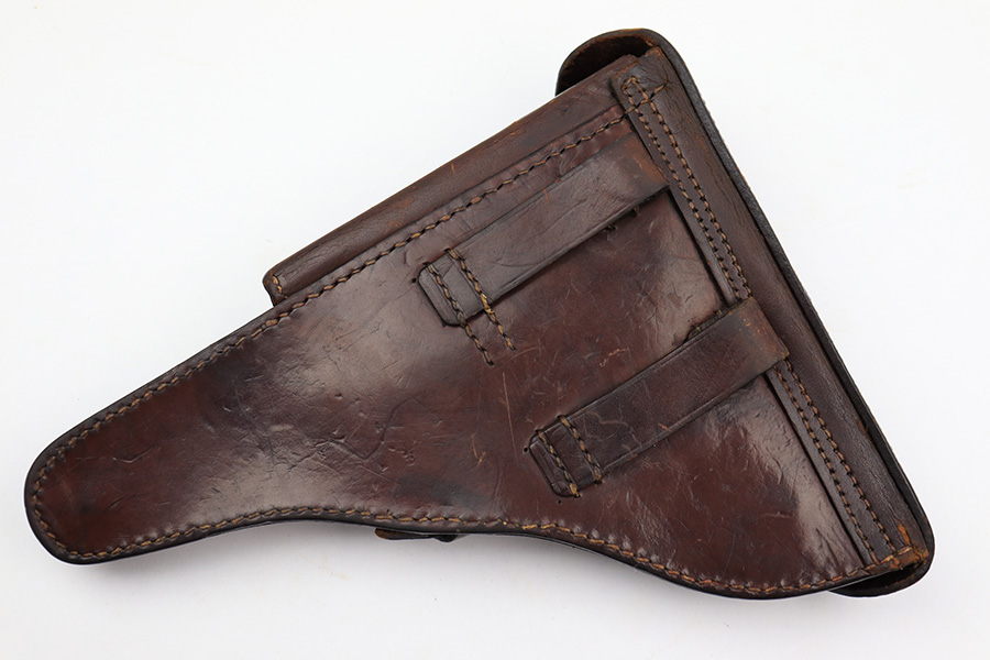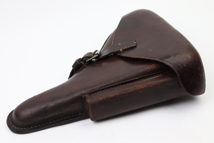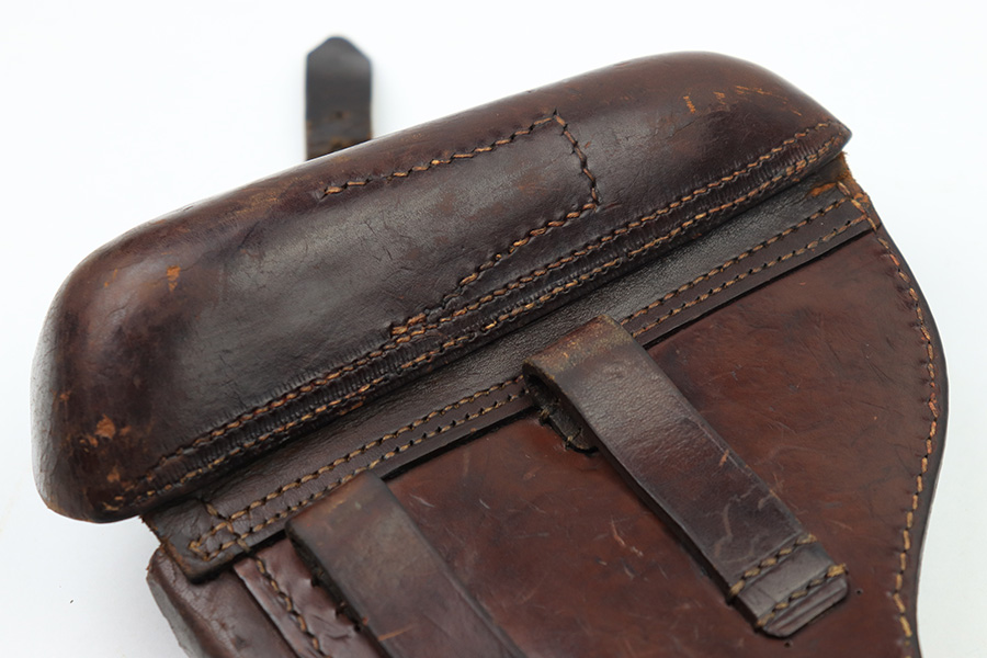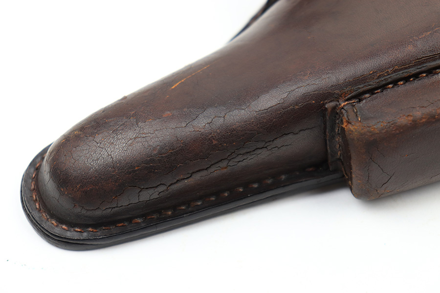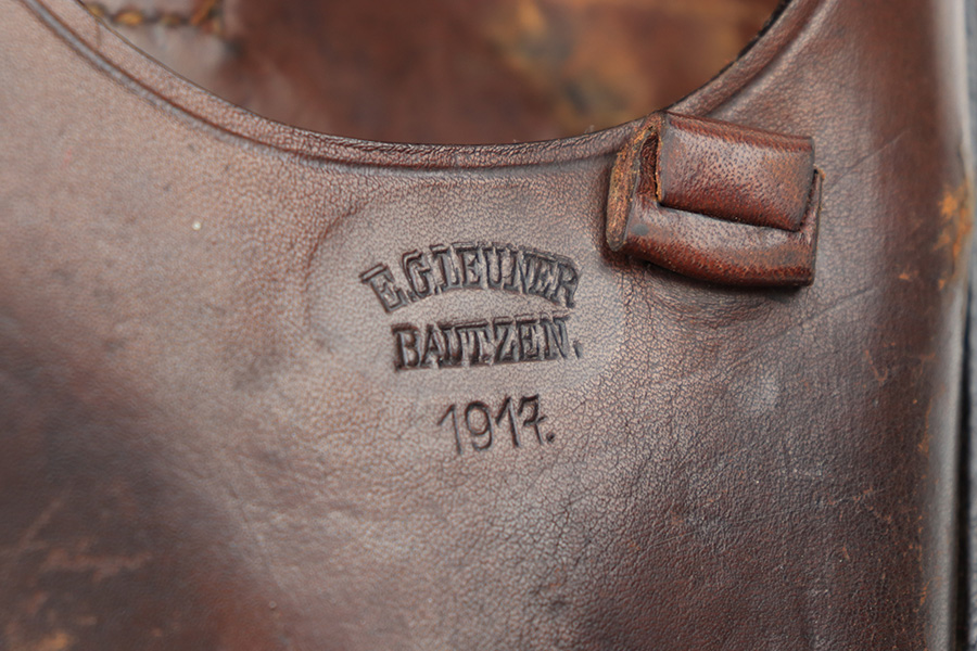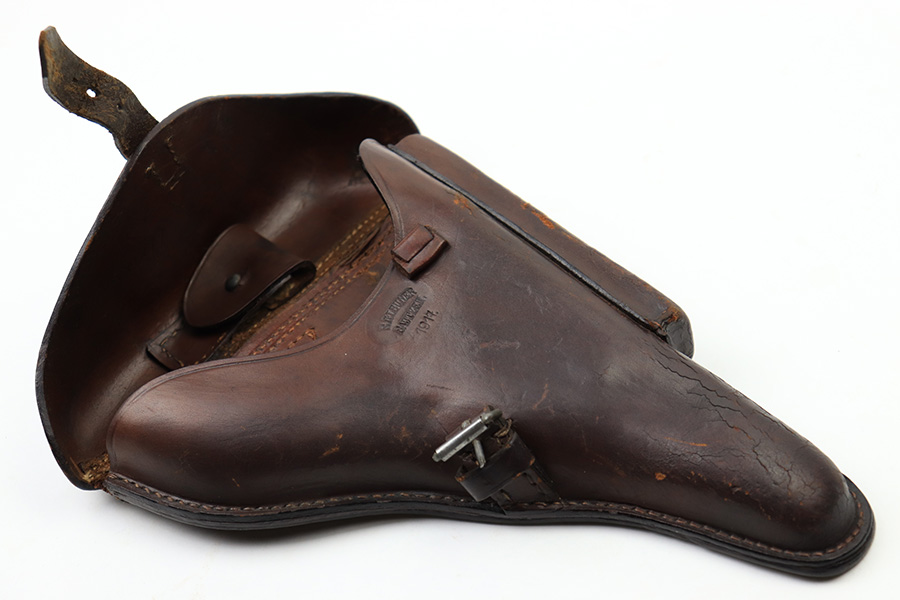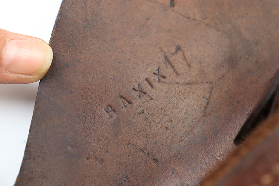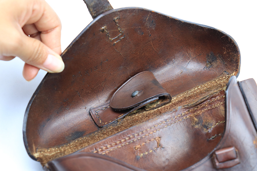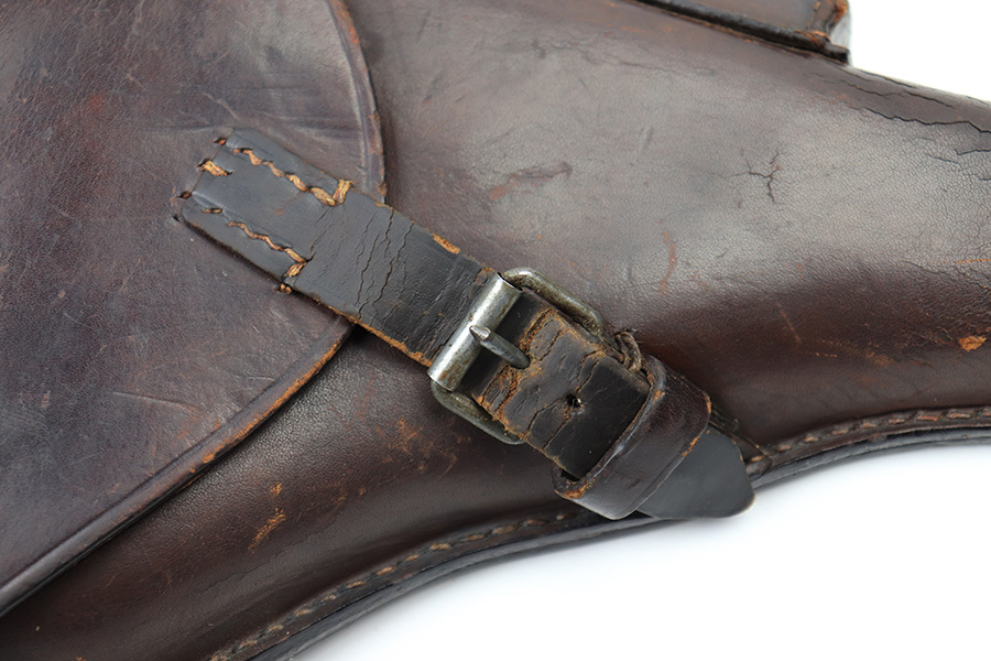 7/11/22 – This is an original 1917 dated WW1 Luger holster. The holster is maker stamped and dated on the front leather as shown. The stamp is crisp, and the maker stamp appears to be a double-stamp. The interior lid is stamped “BAXIX 17” as shown. The reddish brown leather is in great condition considering its’ age. The leather is pliable and has some scuffs along the magazine pouch. There’s also some surface cracking in the leather near the toe, closure strap, and magazine pouch. The leather is completely in tact and the stitching is all original. There’s a few loose / missing stitches on the top leather but this doesn’t affect functionality and is very minor. There’s also stitching missing from the tool pouch on the interior of the holster. The pouch is still attached however.