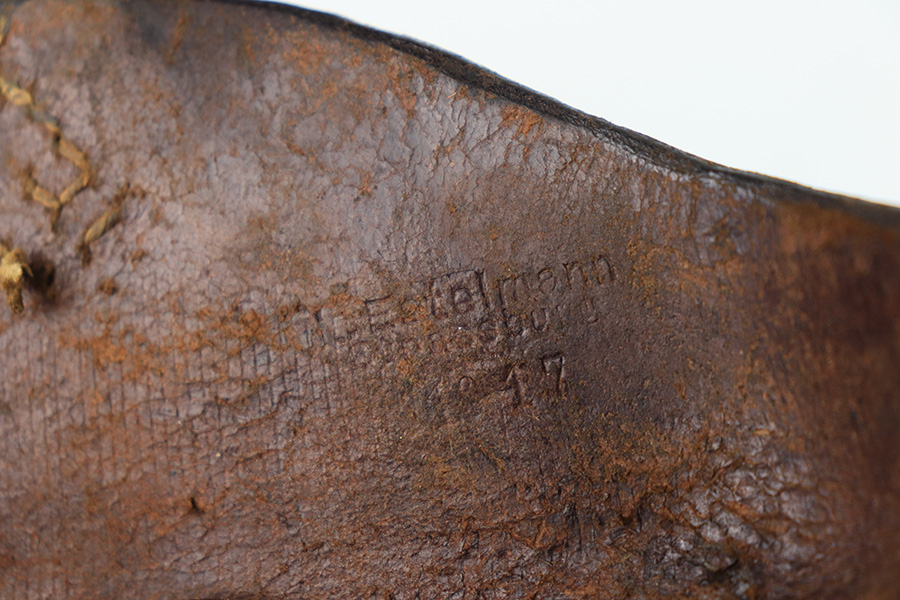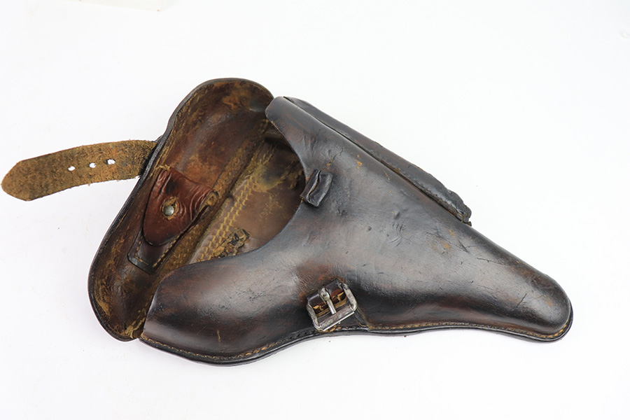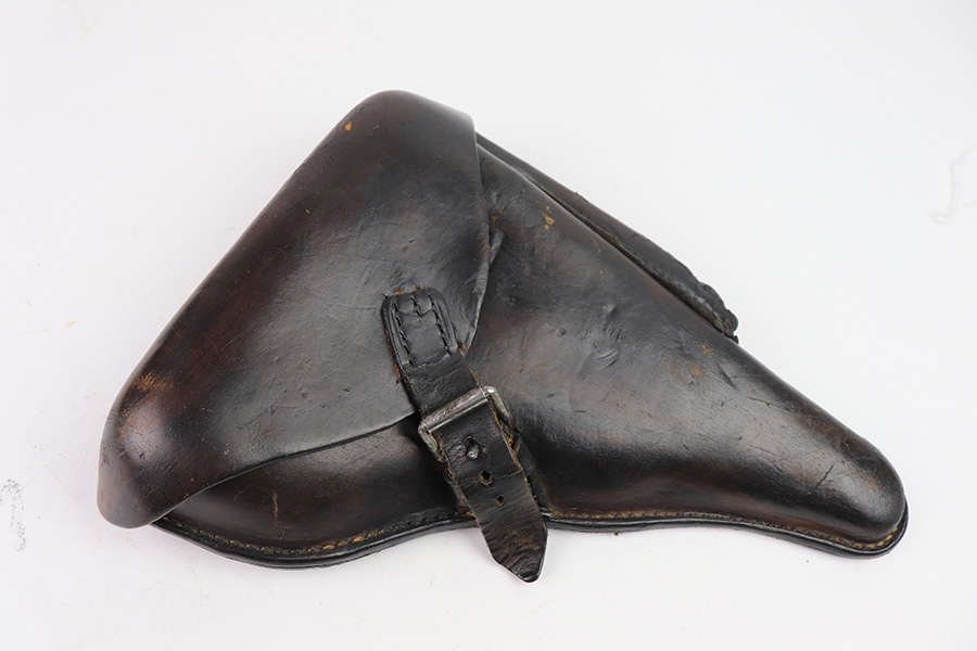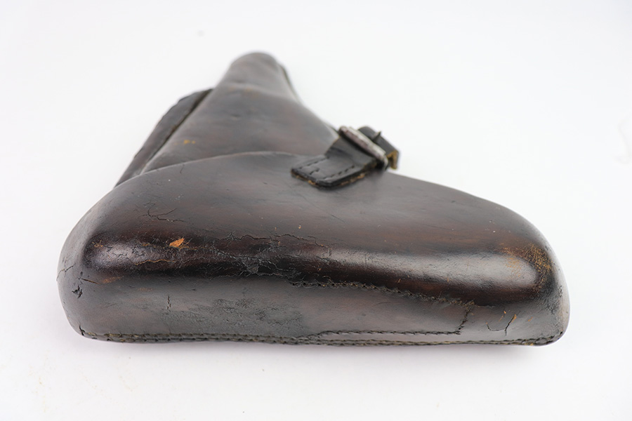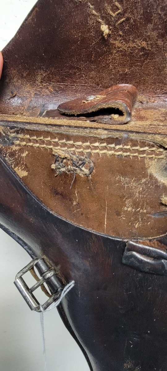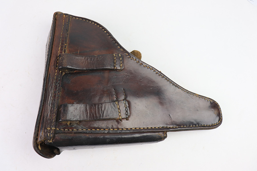 12/21/22 – This is an original WW1 German Luger holster. The holster is maker stamped and dated on the interior lid. The holster has all original leather and stitching, except for the upper stitching of one belt loop, which is replaced. The leather is soft and pliable but still in very good condition – especially considering its age. The magazine pouch has some rough areas of leather but this doesn’t affect functionality and the leather is still completely intact.