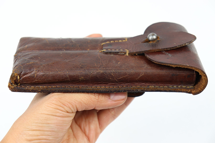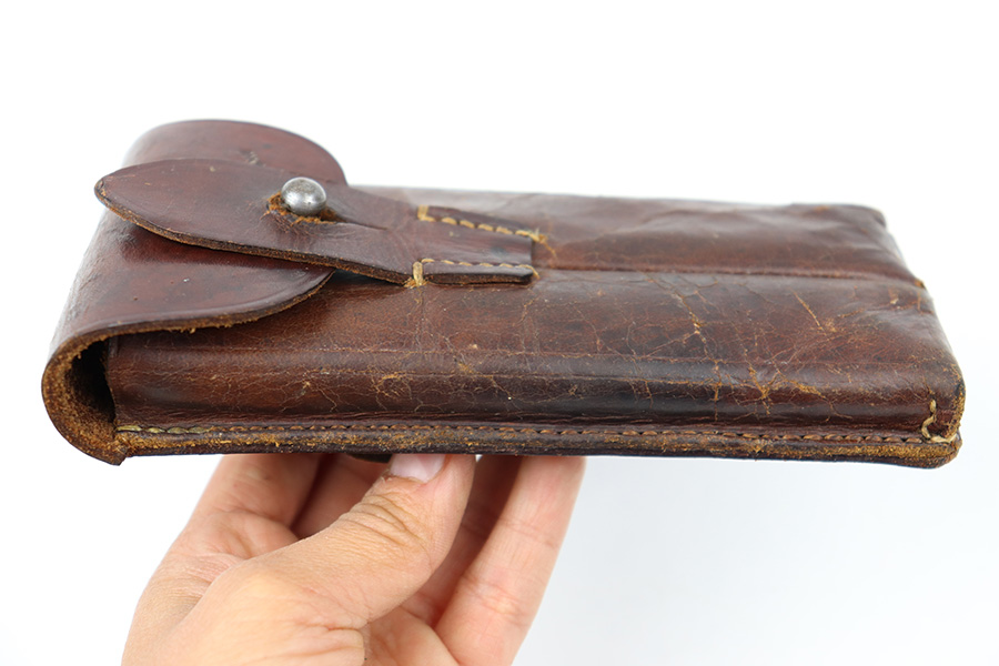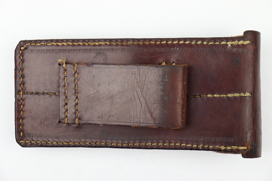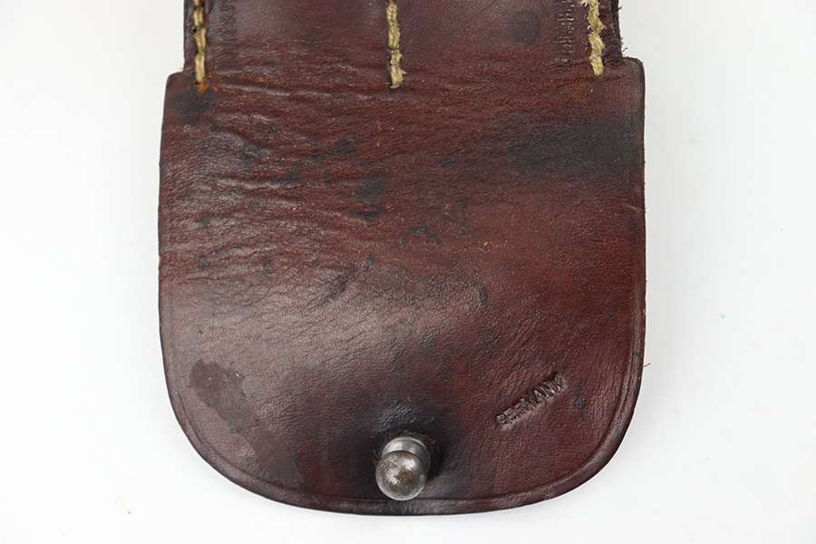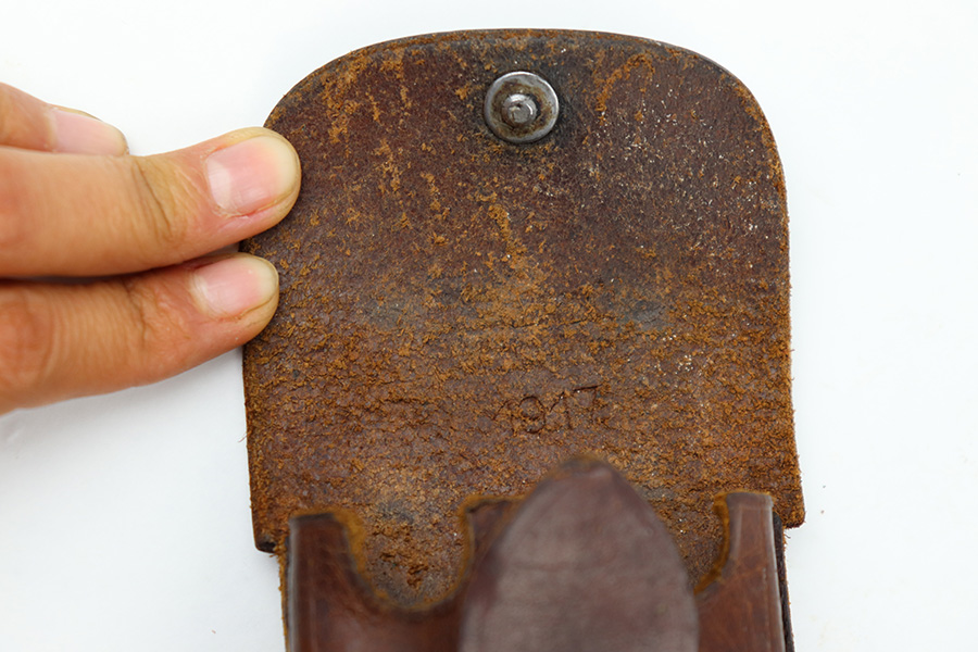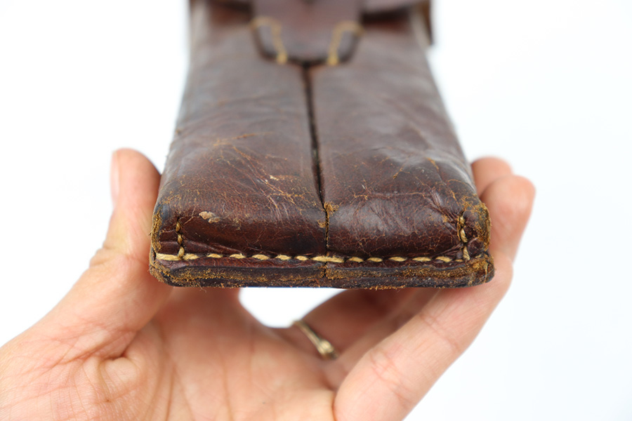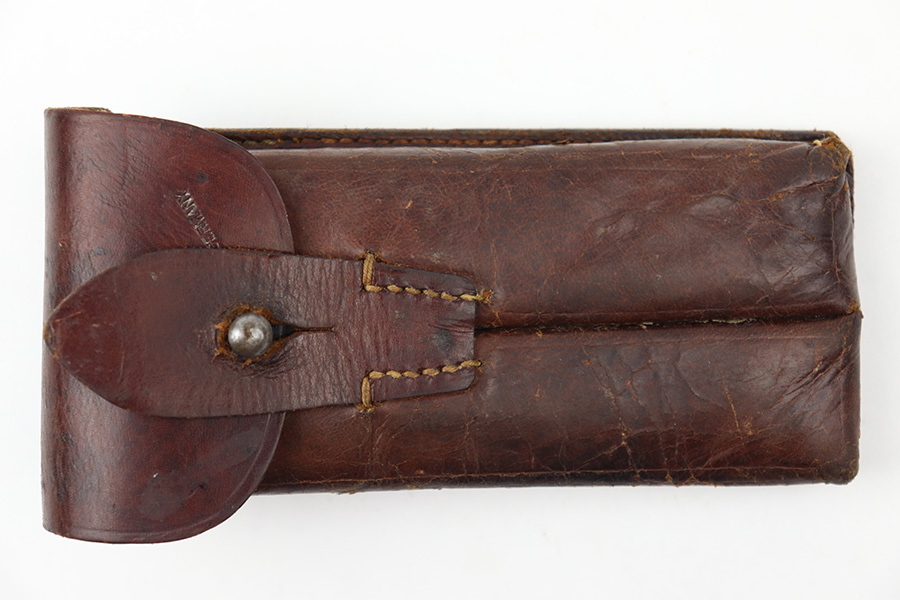 7/20/22 – This is an original WW1 production Luger magazine pouch. The pouch is maker stamped and dated on the interior leather, but the maker stamp is too difficult for us to decipher. The date is clearly 1917 as shown. The front of the pouch is also stamped “GERMANY” for export. The leather is in great condition especially considering its age. There is some mild surface wrinkling and pliability throughout, but no major issues. Clean interior leather and excellent stitching throughout.