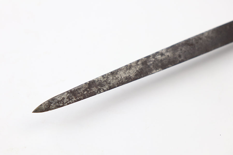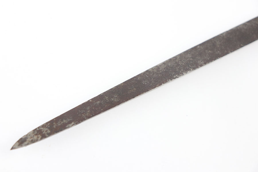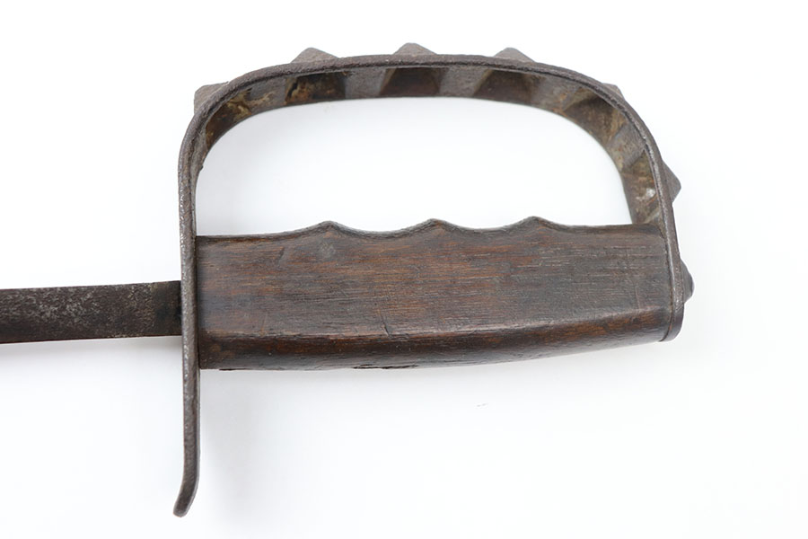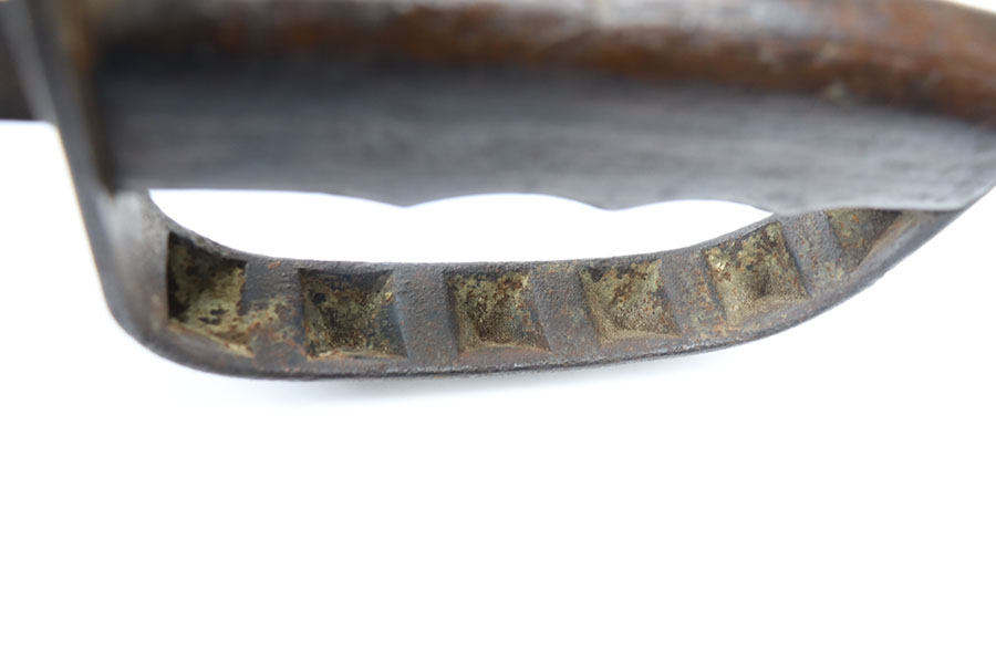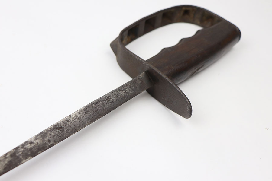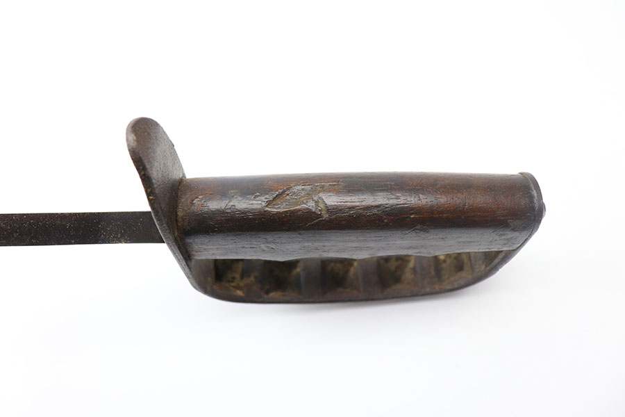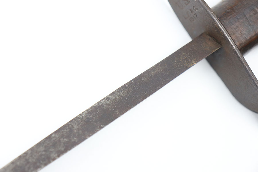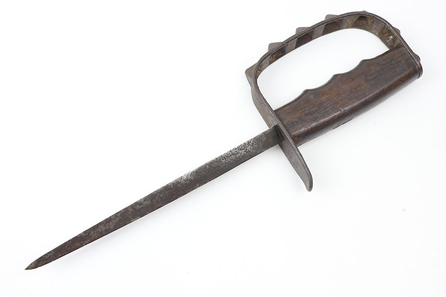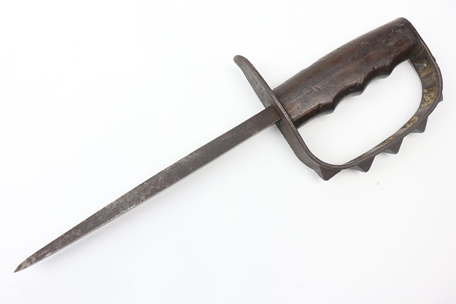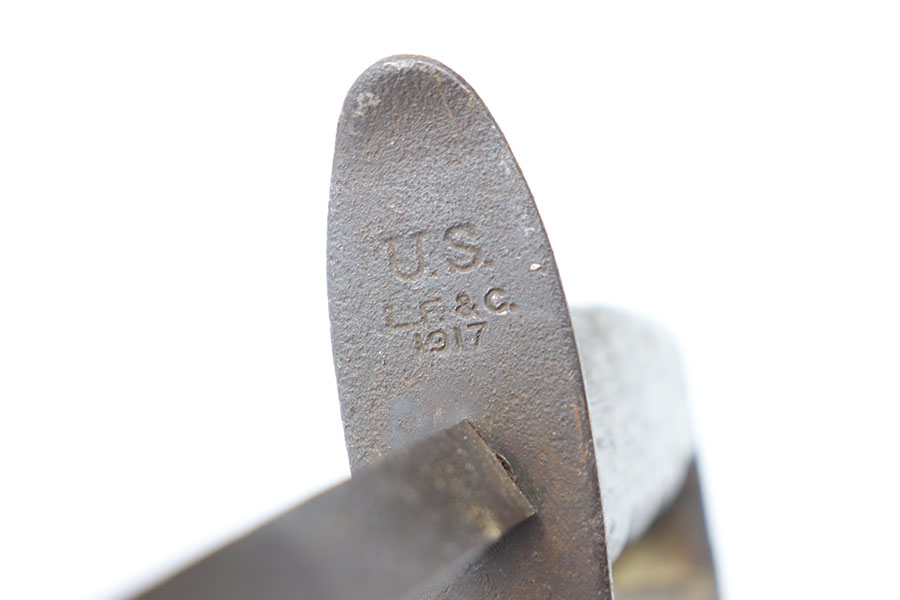 8/31/21 – This is an original US WW1 trench fighting knife. The knife is maker stamped by L.F.&C. and dated on the hand guard. The blade has some discoloration and finish loss throughout, as shown. The hand guard also has surface patina throughout. The wood handle has a small chip out of the backside, but this is a minor flaw. No scabbard included, priced accordingly.