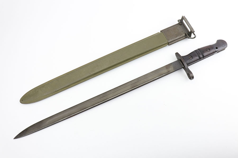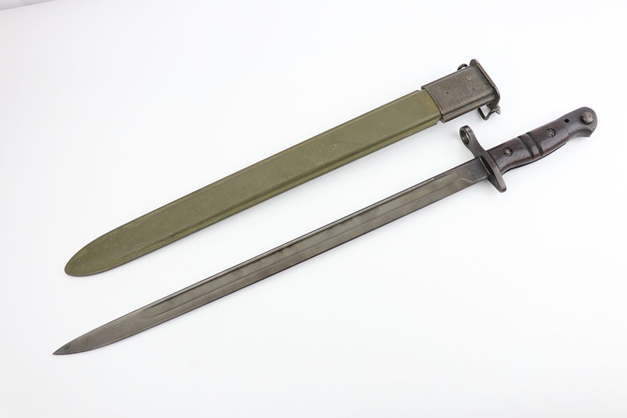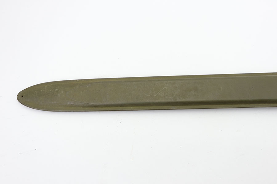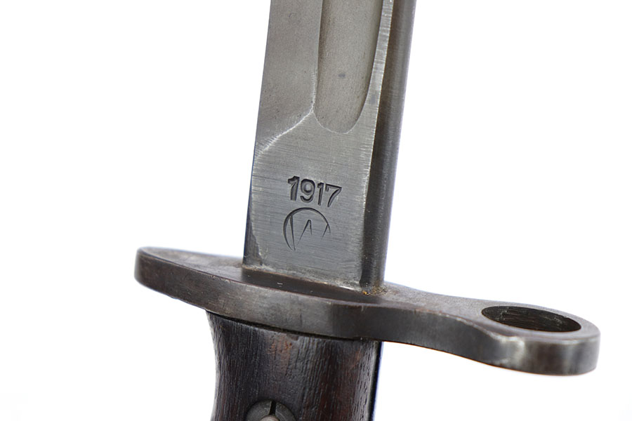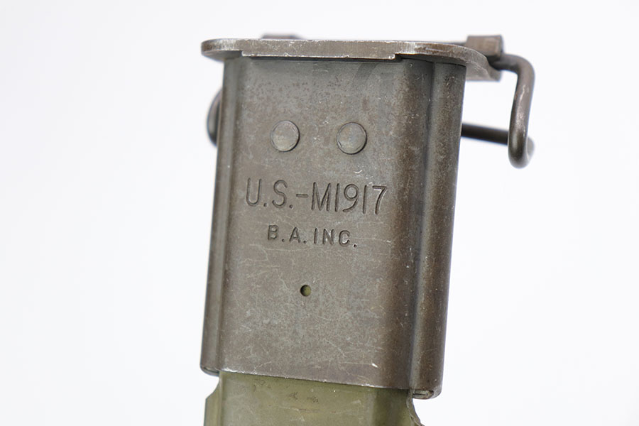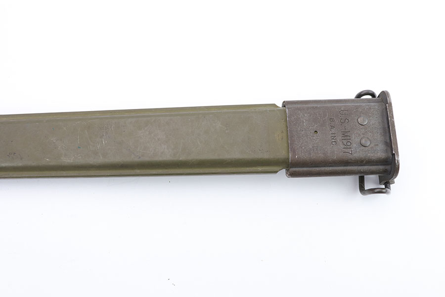 3/3/20 – This is an original WW1 era, 1917 dated bayonet for a trench shotgun. Comes with a green plastic scabbard that would have been issued with this bayonet for use in WW2 after being reissued to the military. The scabbard is marked US-M1917 B.A. INC. There is some scuffing and normal aging wear, but overall in great condition. The blade is excellent with no signs of sharpening. The blade is 17 inches long. Excellent wood handle as well.