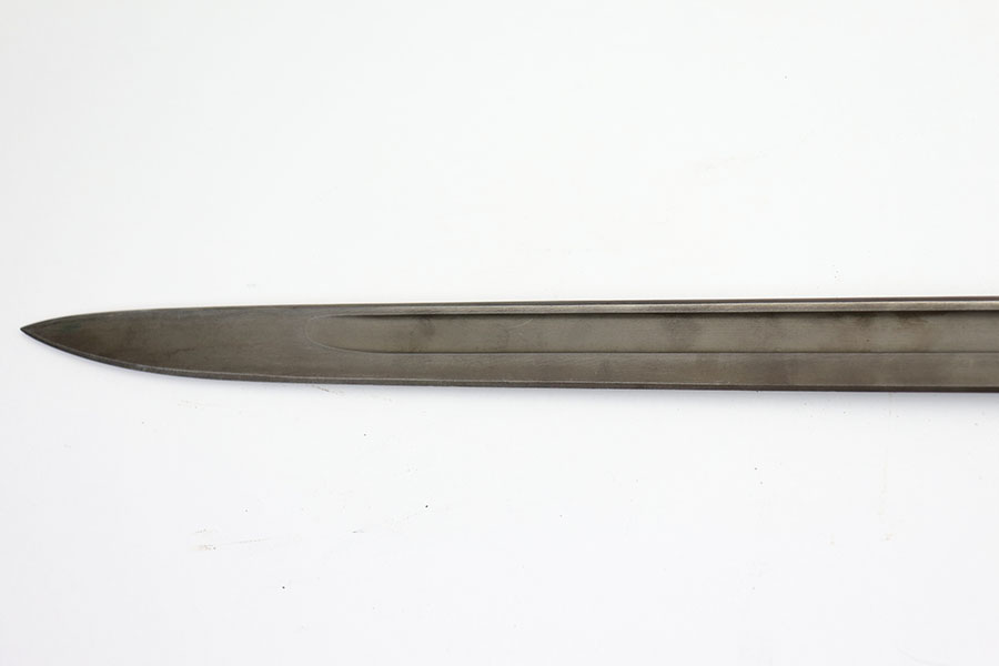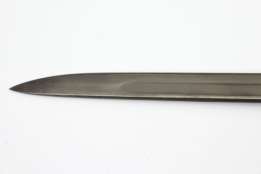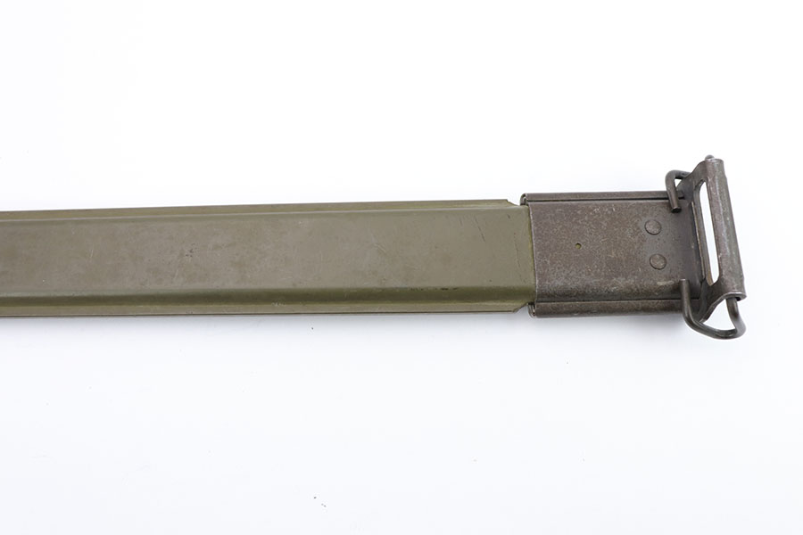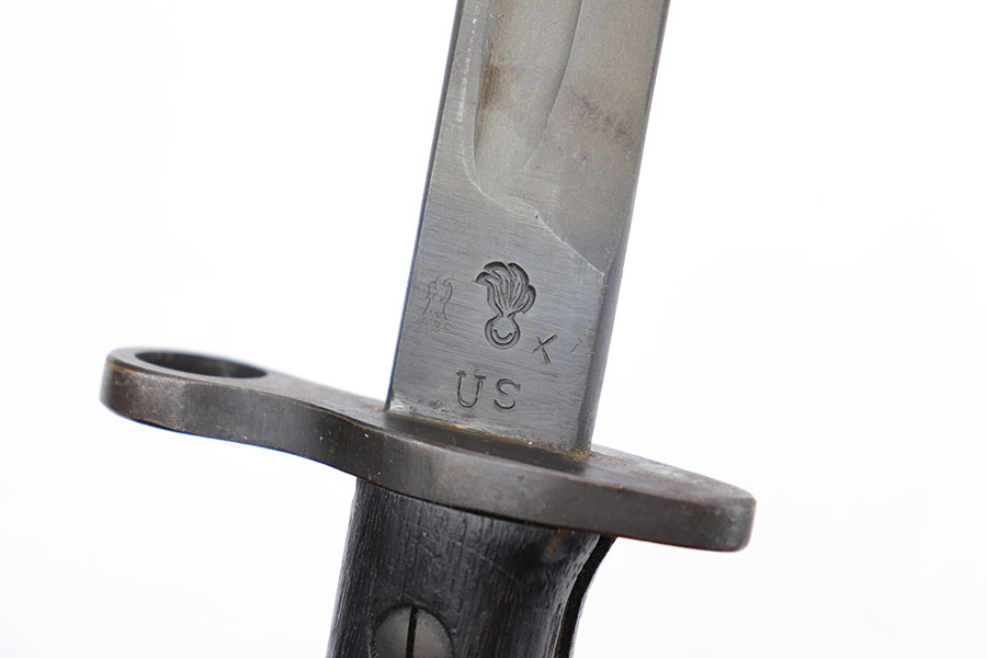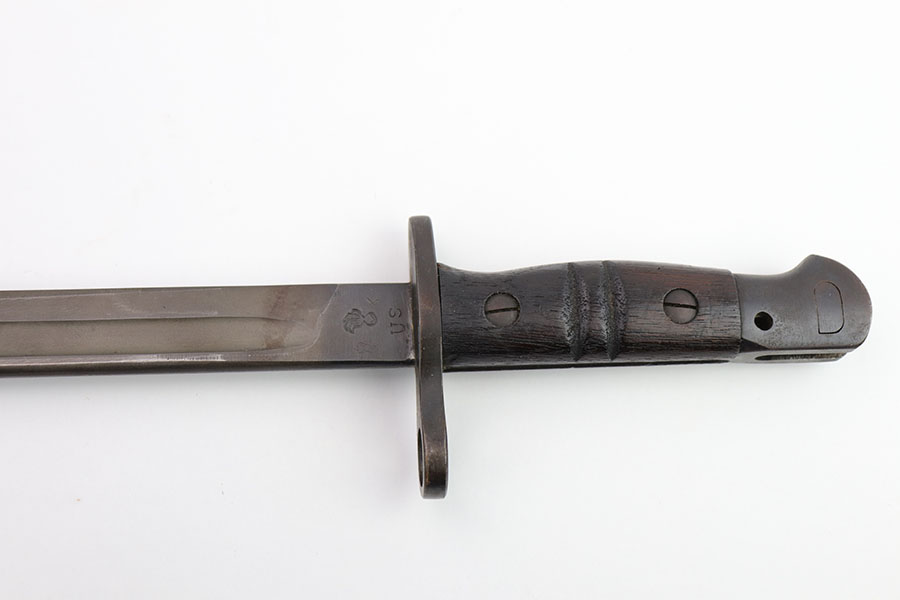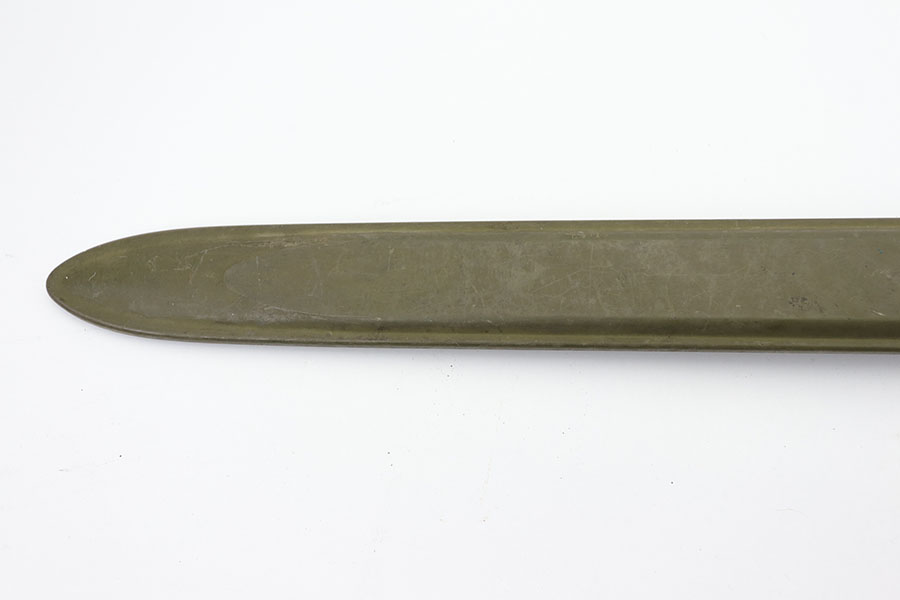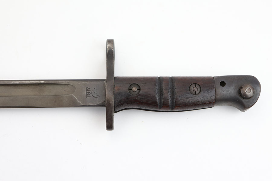 3/3/20 – This is an original WW1 era, 1917 dated bayonet for a trench shotgun. Comes with a green plastic scabbard that would have been issued with this bayonet for use in WW2 after being reissued to the military. The scabbard is marked US-M1917 B.A. INC. There is some scuffing and normal aging wear, but overall in great condition. The blade is excellent with no signs of sharpening. The blade is 17 inches long. Excellent wood handle as well.