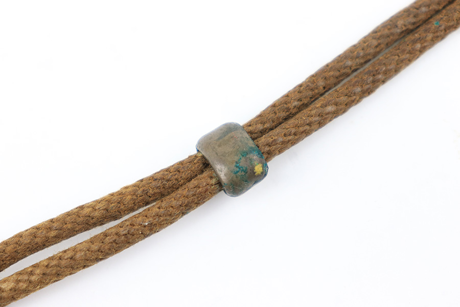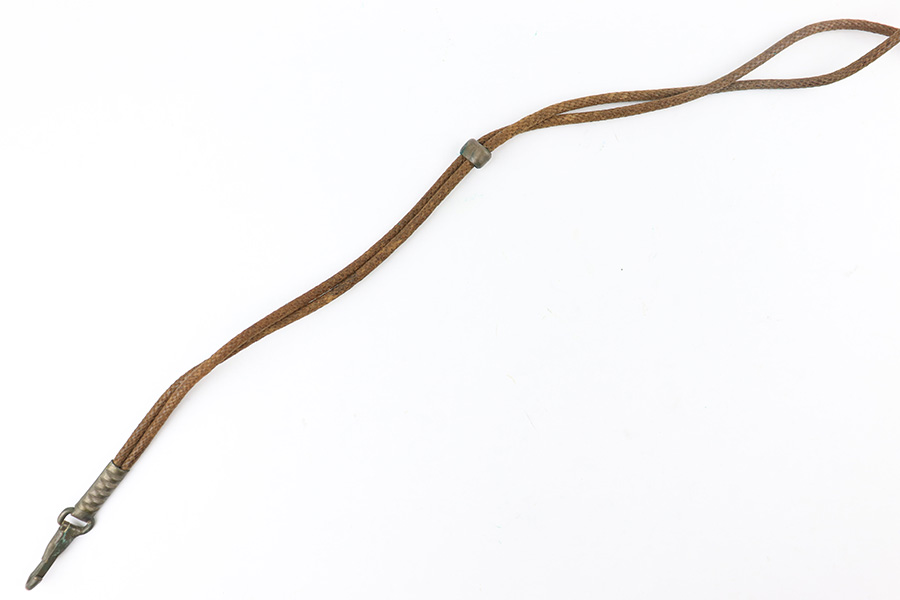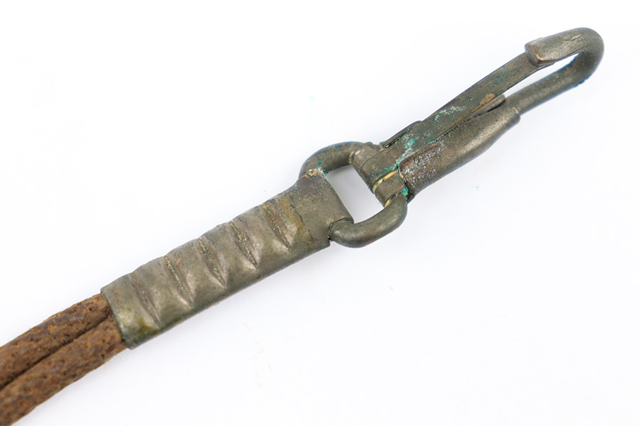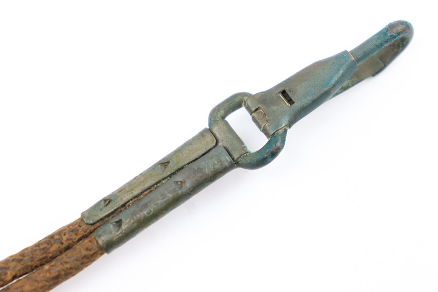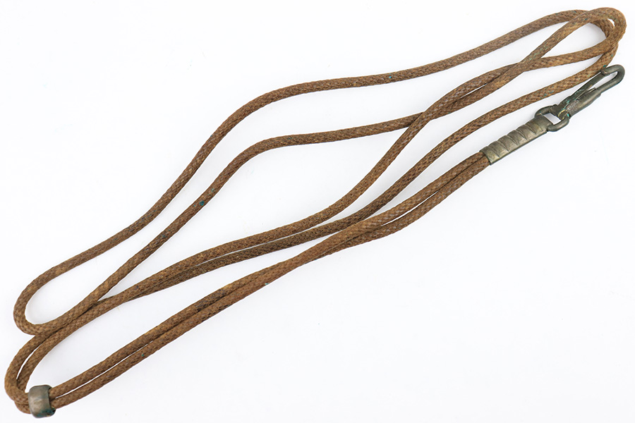 8/3/23 – This is an original WW1 US Pistol / Revolver lanyard. The lanyard has a 1917 patent date on the metal clip, and no other markings. The metal retaining band is still intact with some mild surface patina and verdigris. Similar wear can be found on the metal clip as well. The chord is tight and rigid due to age, but is completely intact without any fraying. Great overall condition. Used with the M1911 and M1917 pistol and revolver.
