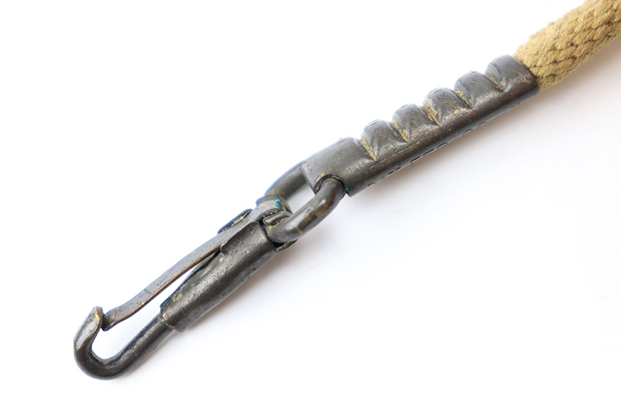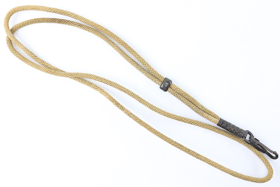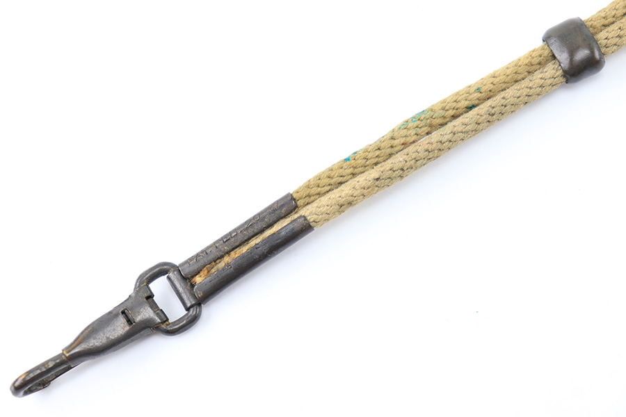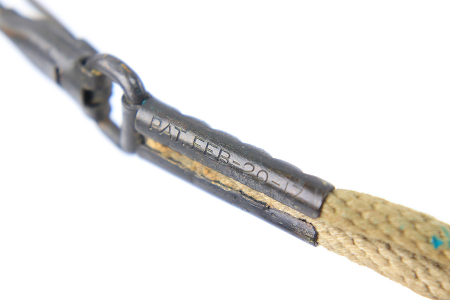 8/11/23 – This is an original WW1 US Pistol / Revolver lanyard. The lanyard has a 1917 patent date on the metal clip, and no other markings. The metal retaining band is still intact with some mild surface patina and verdigris. Similar wear can be found on the metal clip as well. The chord is tight and rigid due to age, but is completely intact without any fraying. Great overall condition. Used with the M1911 and M1917 pistol and revolver.