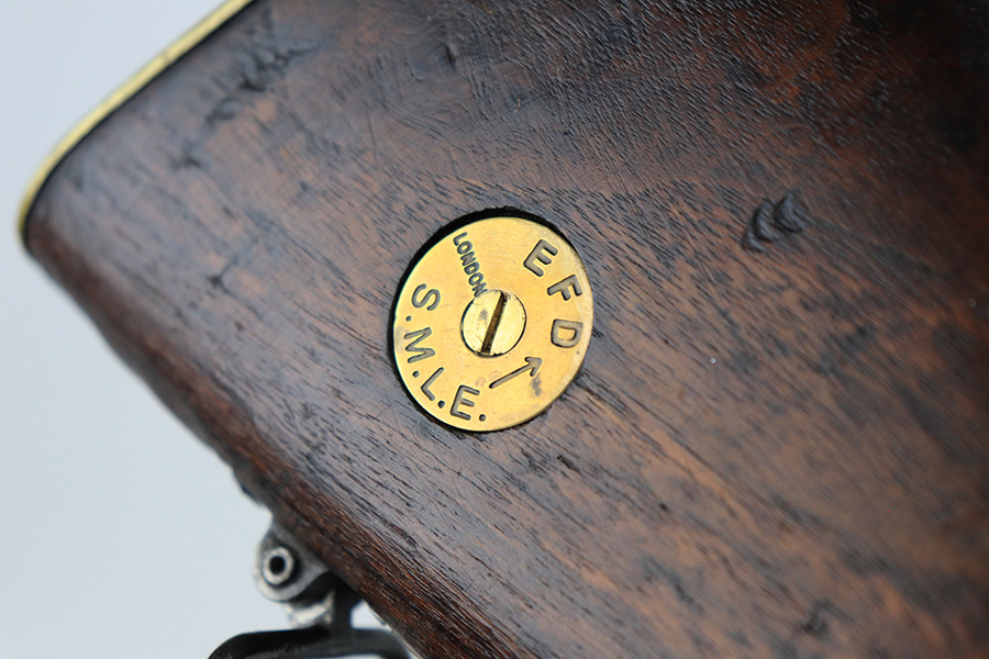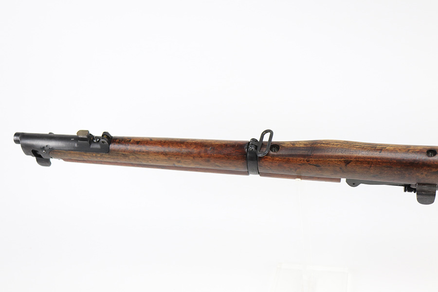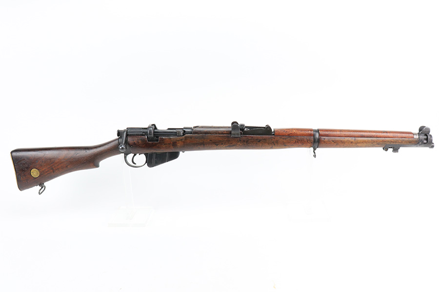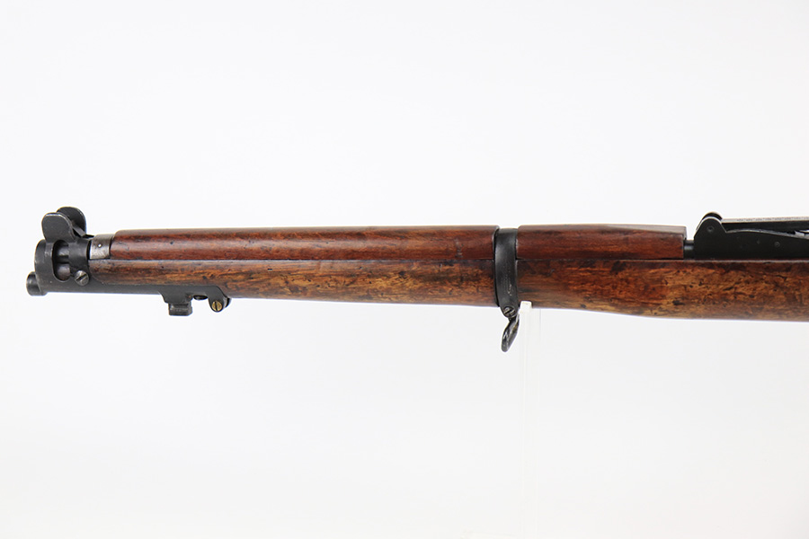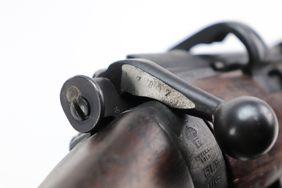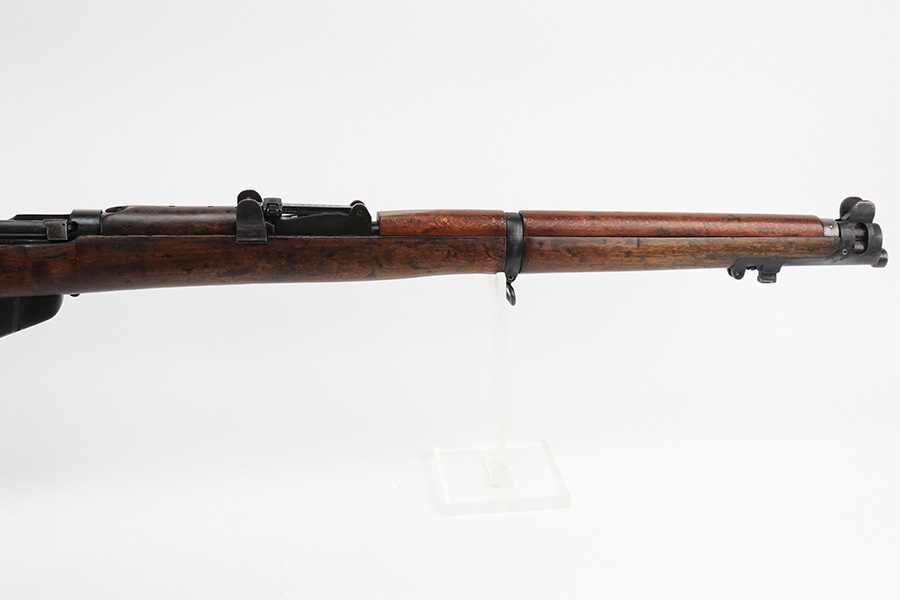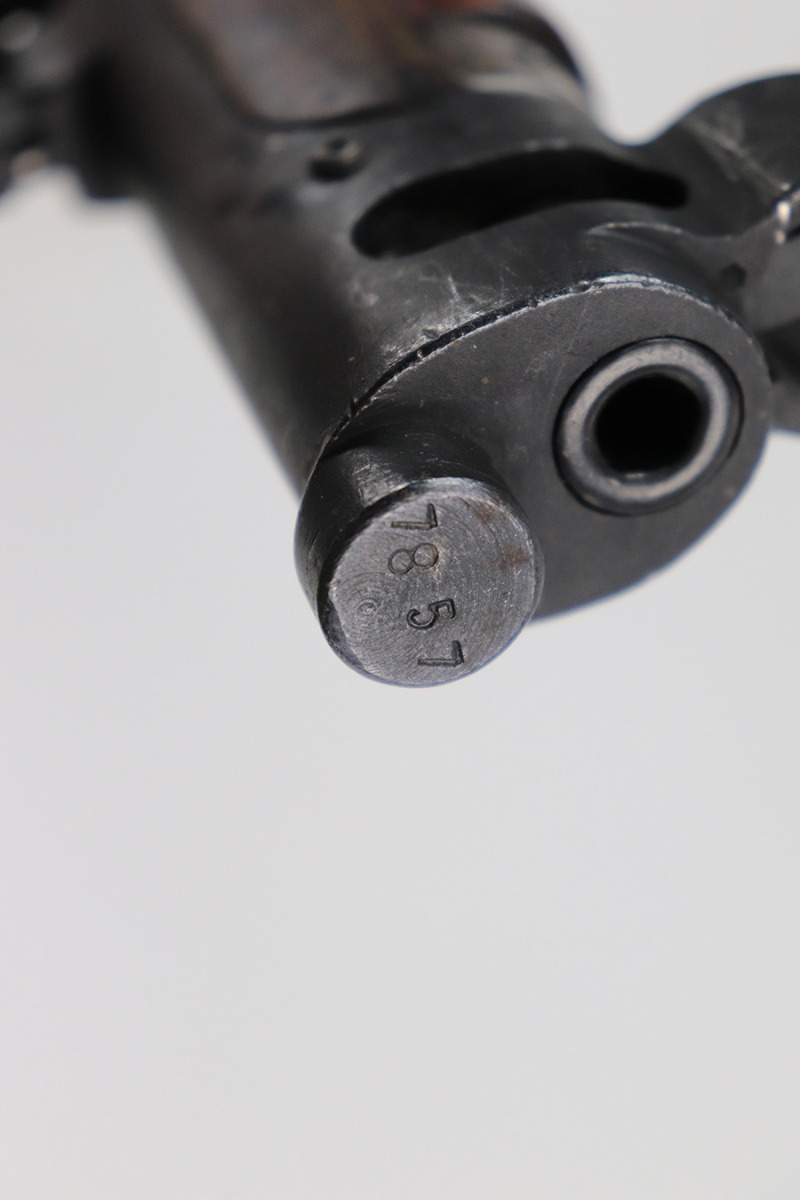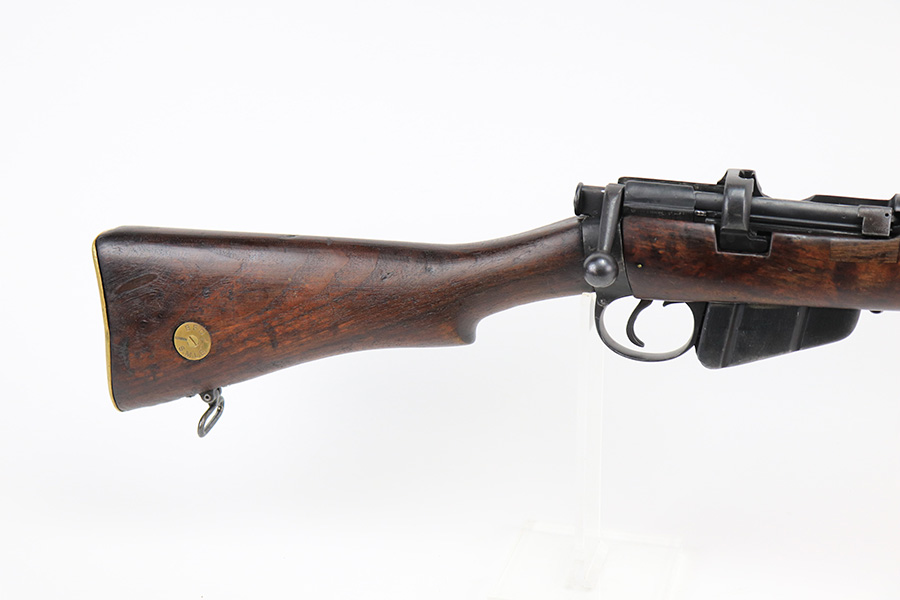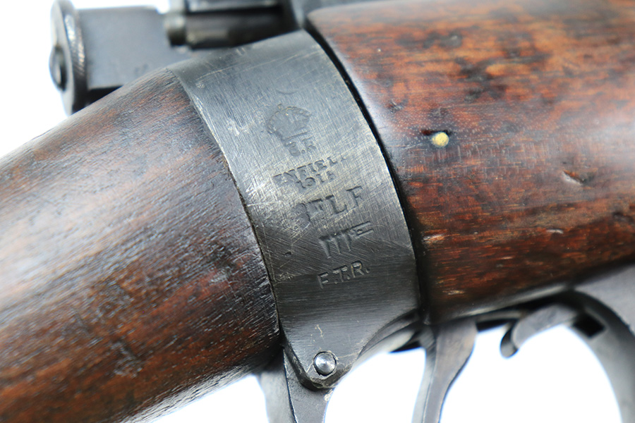6/8/22 – This is a nice example of an Enfield SMLE III rifle issued to the British military in 1918. The gun is all matching, but the bolt and magazine have been re-numbered to match – likely done at an arsenal. The numbering on the stock is faint and hard to read, but it does not appear to be matching. Faint import mark on the right side of the receiver. There is some thinning, discoloration, and light scratchy wear around the muzzle and some minor thinning on the right side plate. There are minor dings and scratches on the stock throughout. The stock appears to have been lightly sanded. The bore has decent rifling with minor pin-pricking throughout.