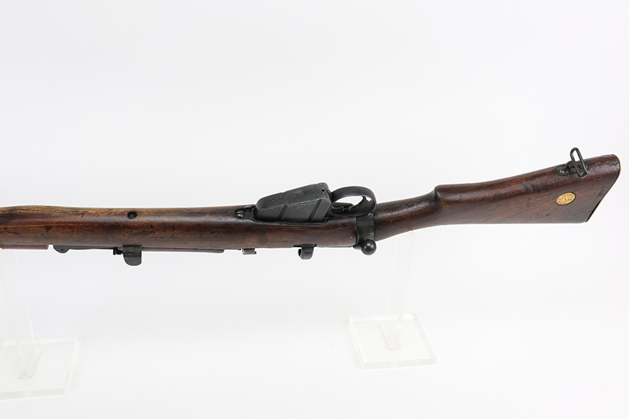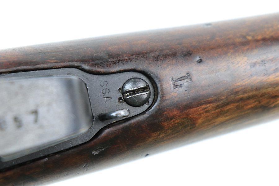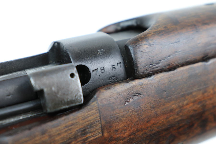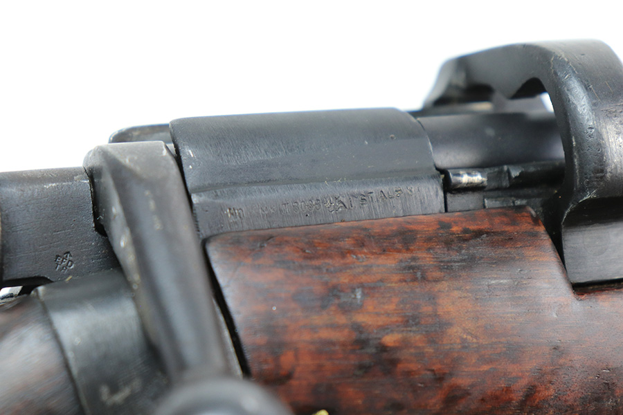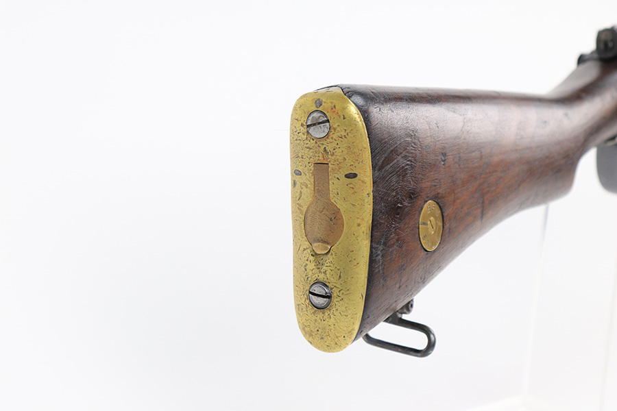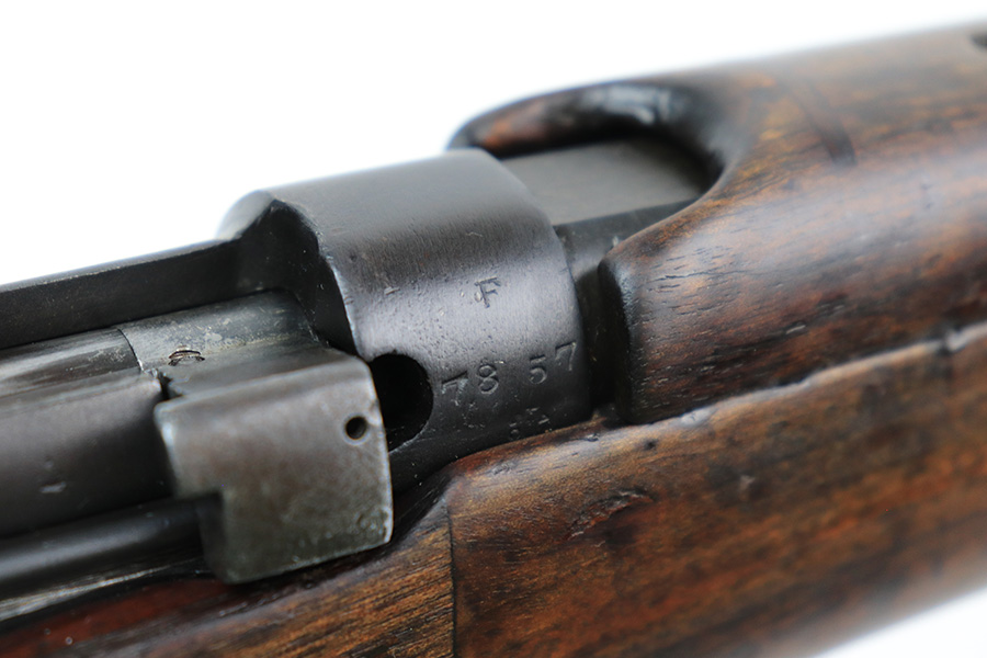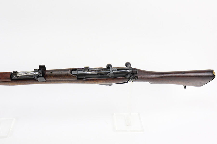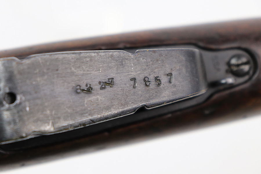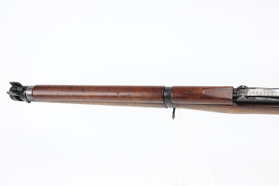 6/8/22 – This is a nice example of an Enfield SMLE III rifle issued to the British military in 1918. The gun is all matching, but the bolt and magazine have been re-numbered to match – likely done at an arsenal. The numbering on the stock is faint and hard to read, but it does not appear to be matching. Faint import mark on the right side of the receiver. There is some thinning, discoloration, and light scratchy wear around the muzzle and some minor thinning on the right side plate. There are minor dings and scratches on the stock throughout. The stock appears to have been lightly sanded. The bore has decent rifling with minor pin-pricking throughout.