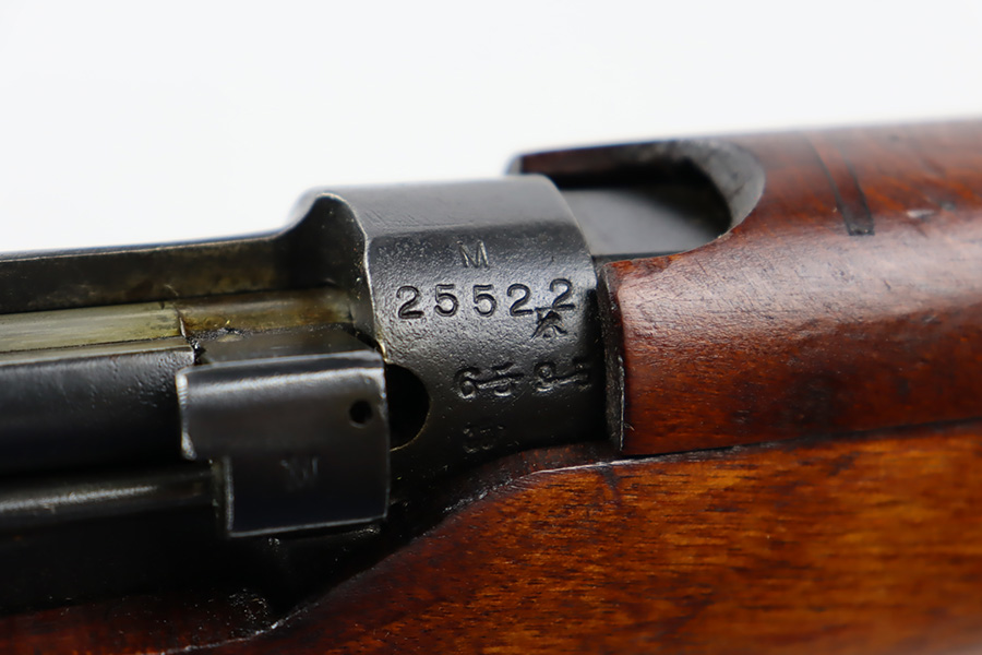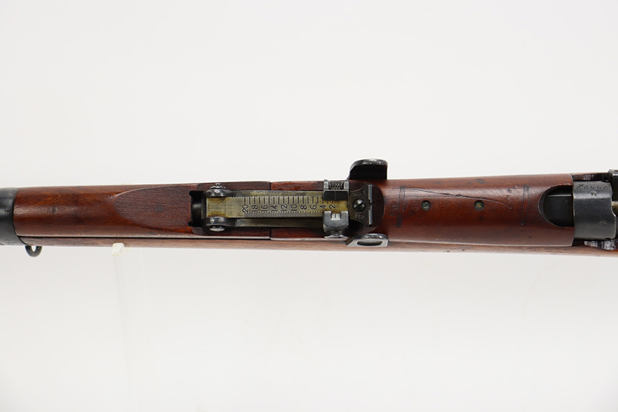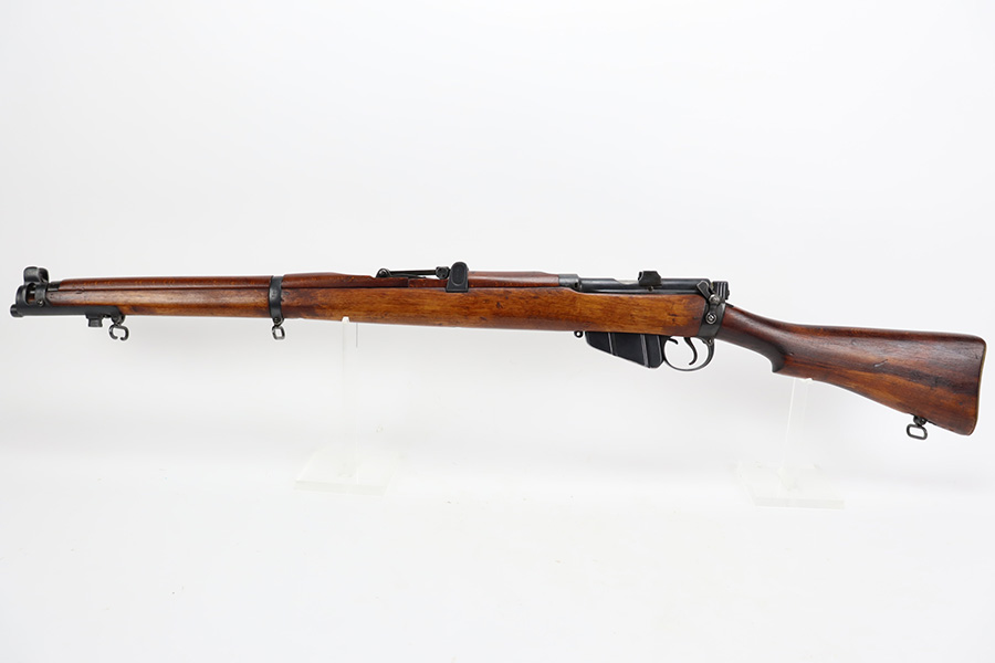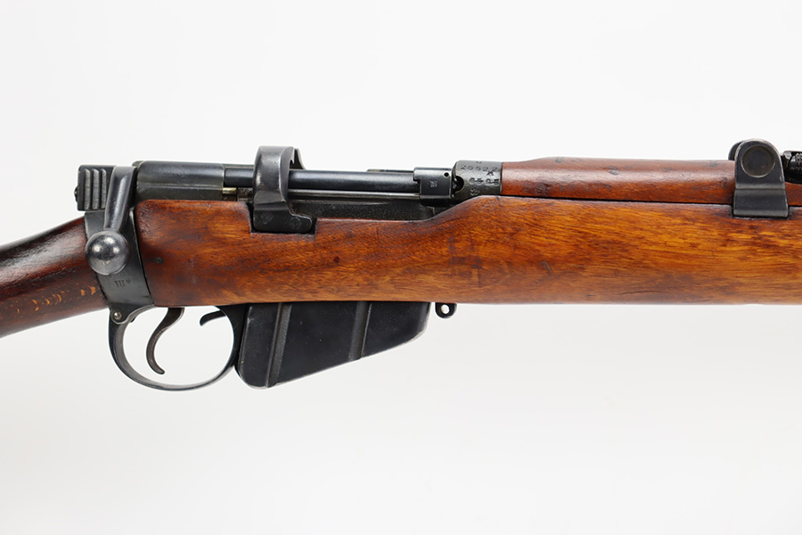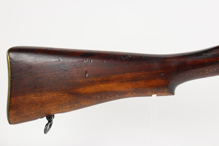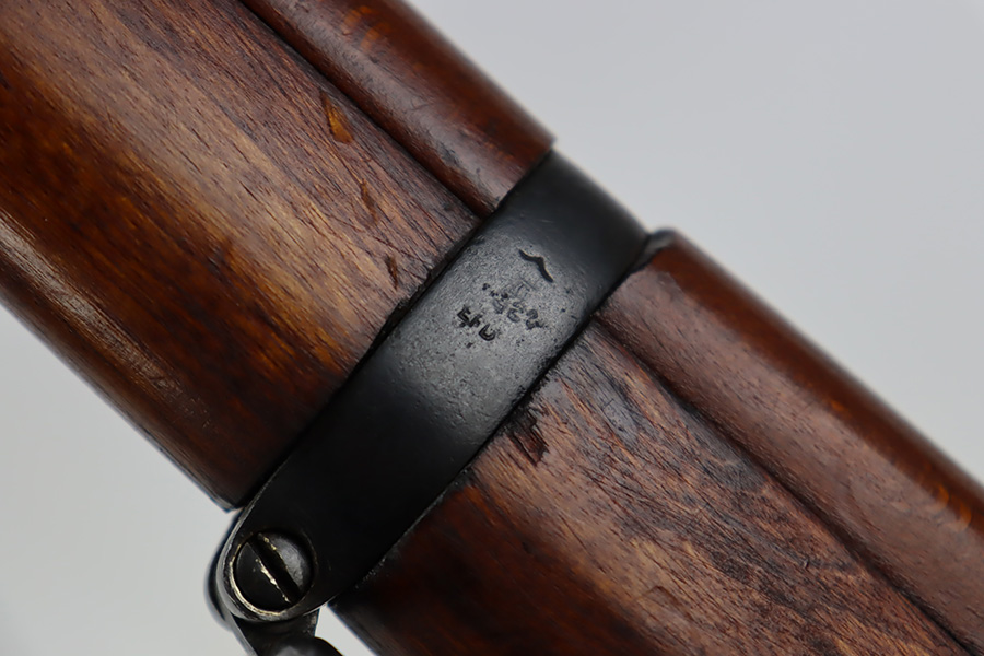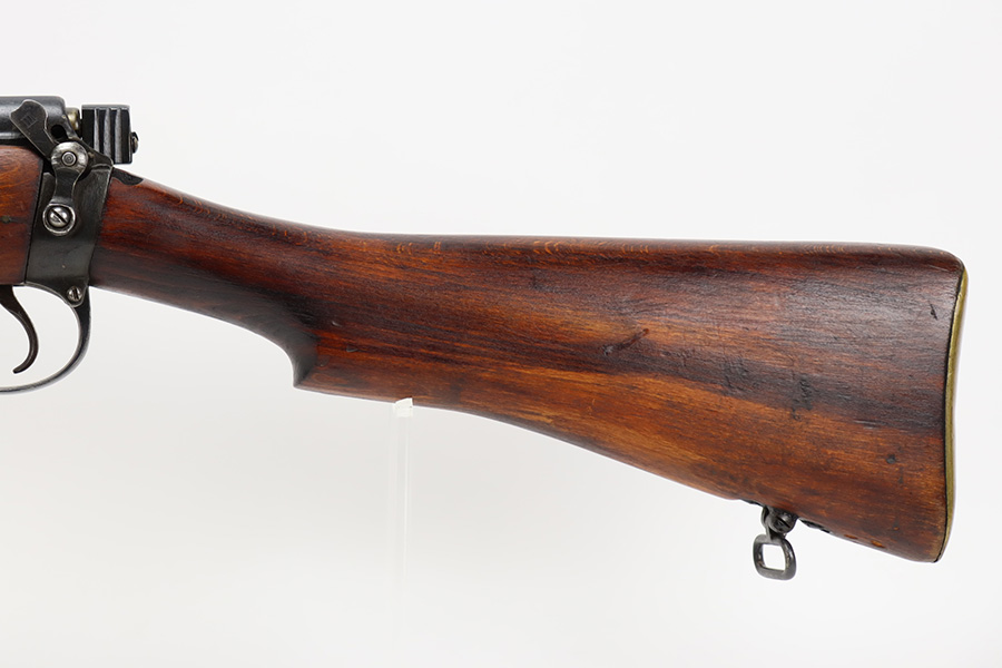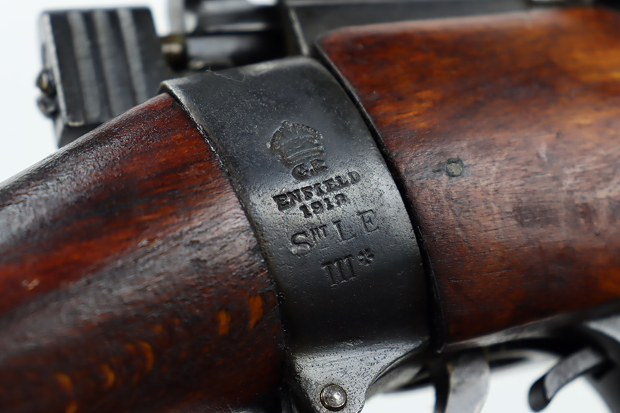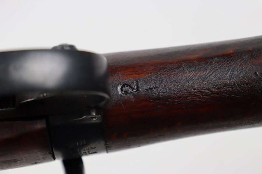 11/6/23 – This is a nice example of an Enfield SMLE III rifle issued to the British military in 1918. The gun is all matching, but the receiver appears to have been re-numbered – likely done at an arsenal. No visible numbering on the stock. There is very little finish loss, but there is pin-pricking under the bluing throughout – likely arsenal refinished. Excellent wood furniture. Mint bore.
