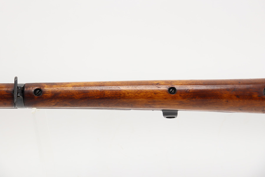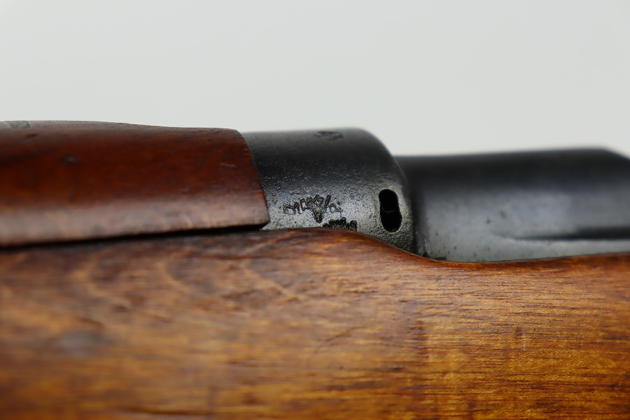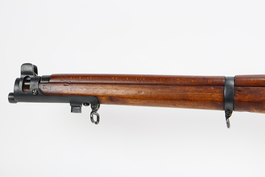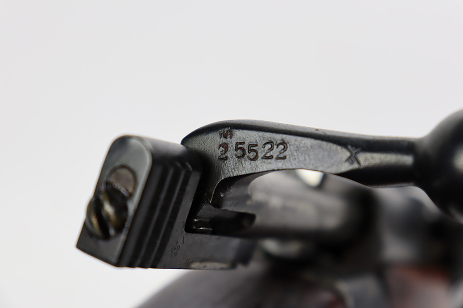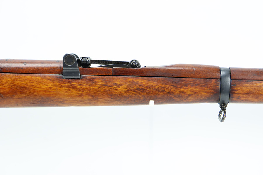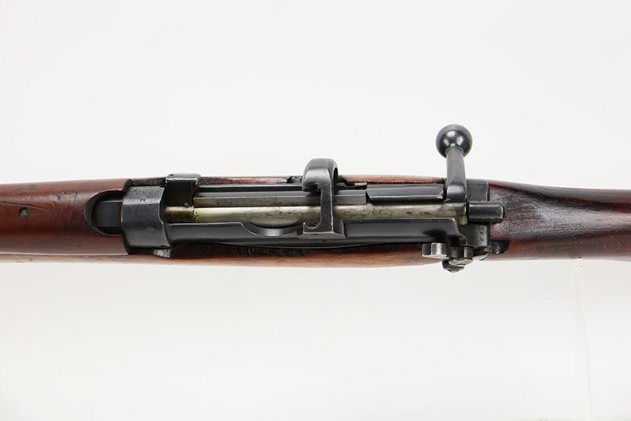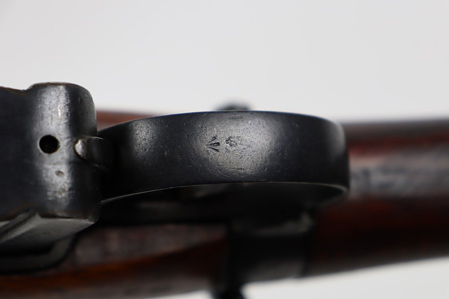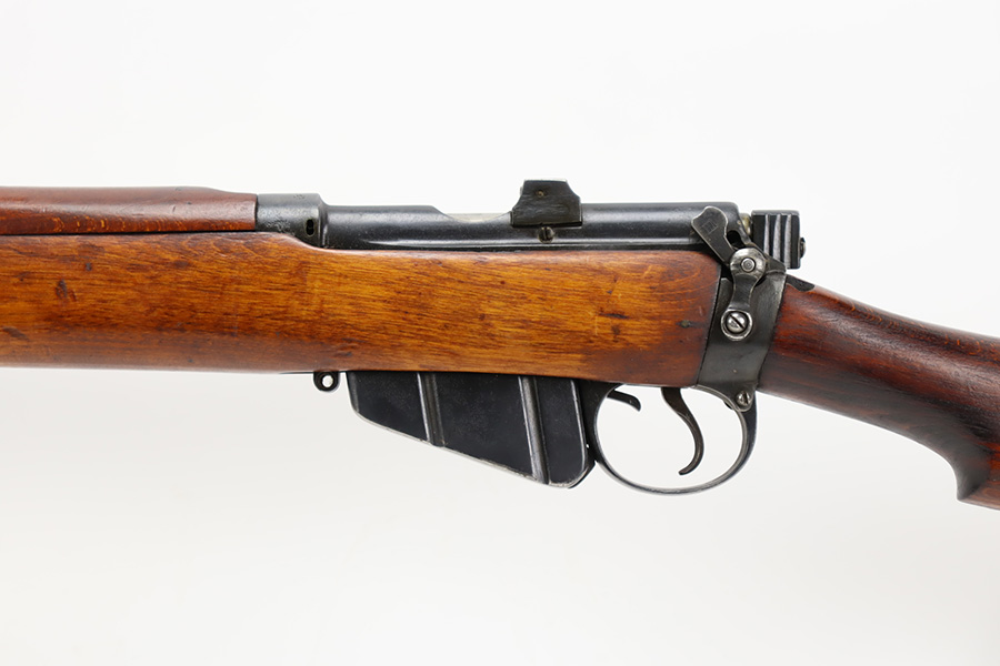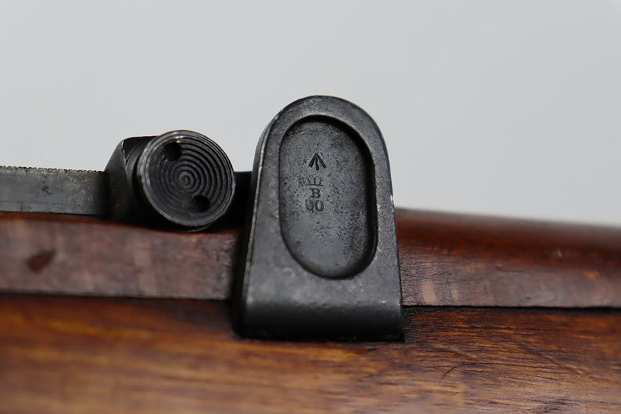 11/6/23 – This is a nice example of an Enfield SMLE III rifle issued to the British military in 1918. The gun is all matching, but the receiver appears to have been re-numbered – likely done at an arsenal. No visible numbering on the stock. There is very little finish loss, but there is pin-pricking under the bluing throughout – likely arsenal refinished. Excellent wood furniture. Mint bore.