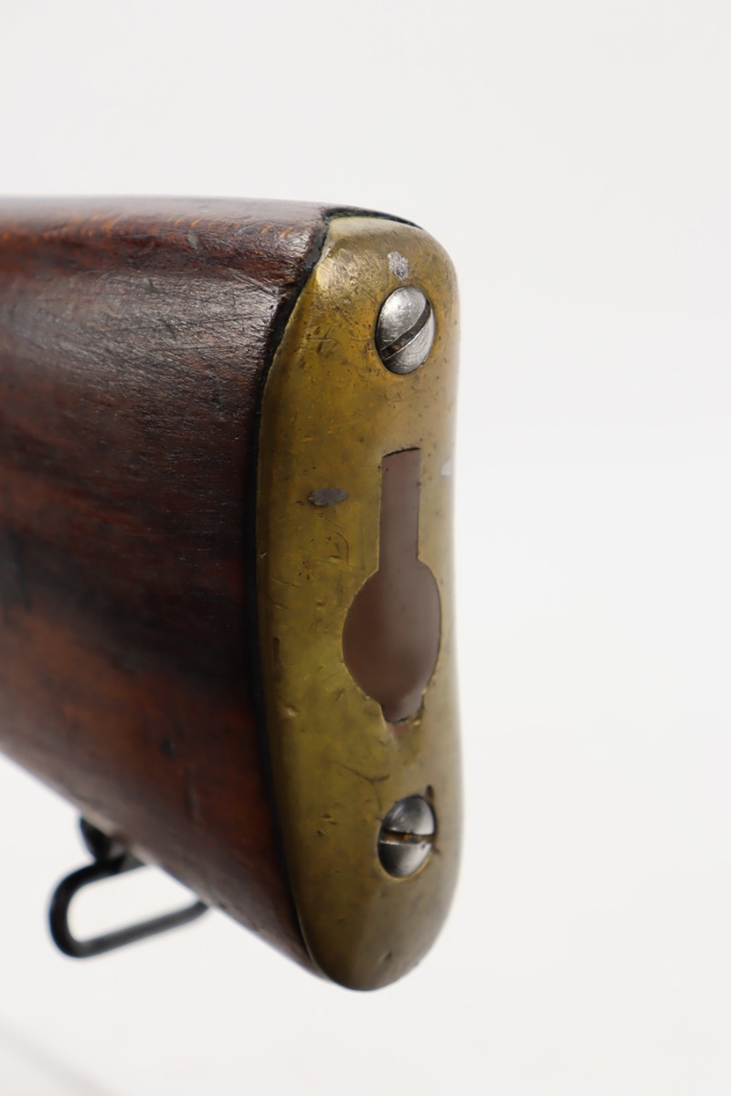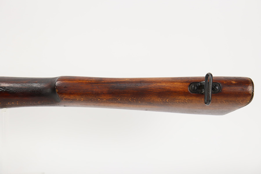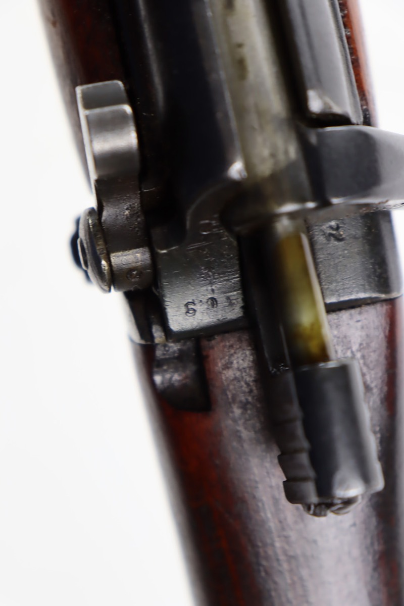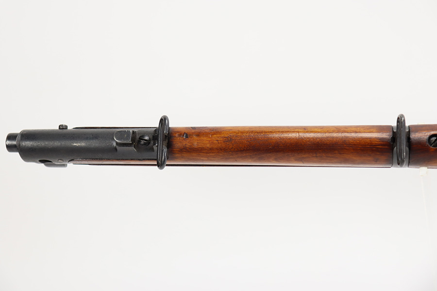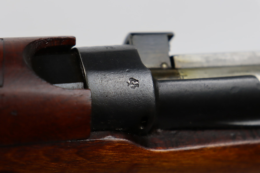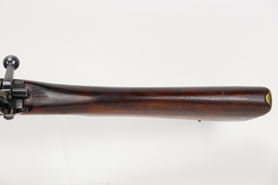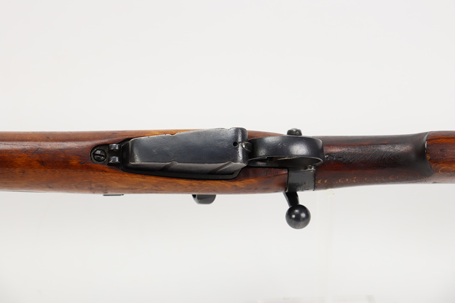 11/6/23 – This is a nice example of an Enfield SMLE III rifle issued to the British military in 1918. The gun is all matching, but the receiver appears to have been re-numbered – likely done at an arsenal. No visible numbering on the stock. There is very little finish loss, but there is pin-pricking under the bluing throughout – likely arsenal refinished. Excellent wood furniture. Mint bore.