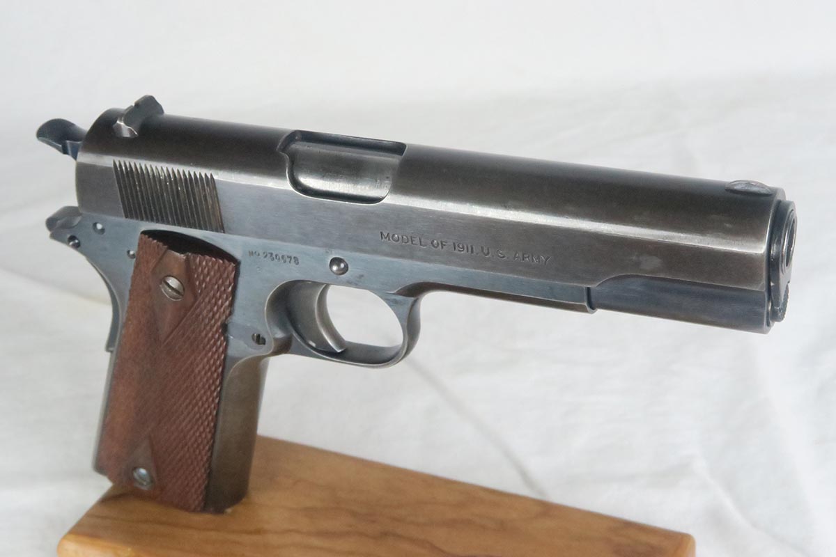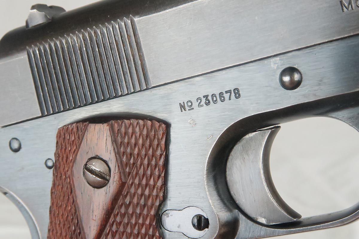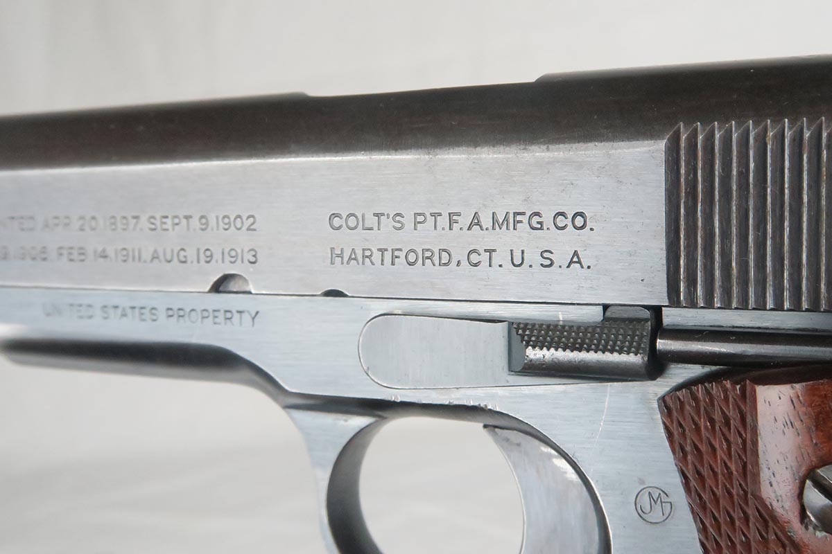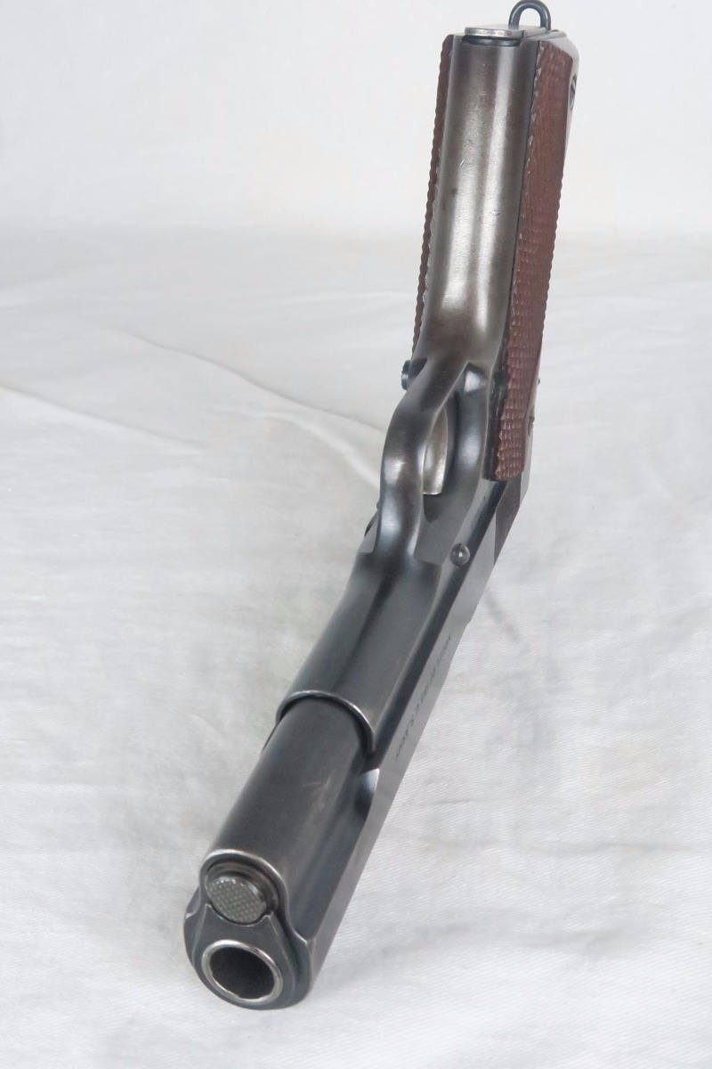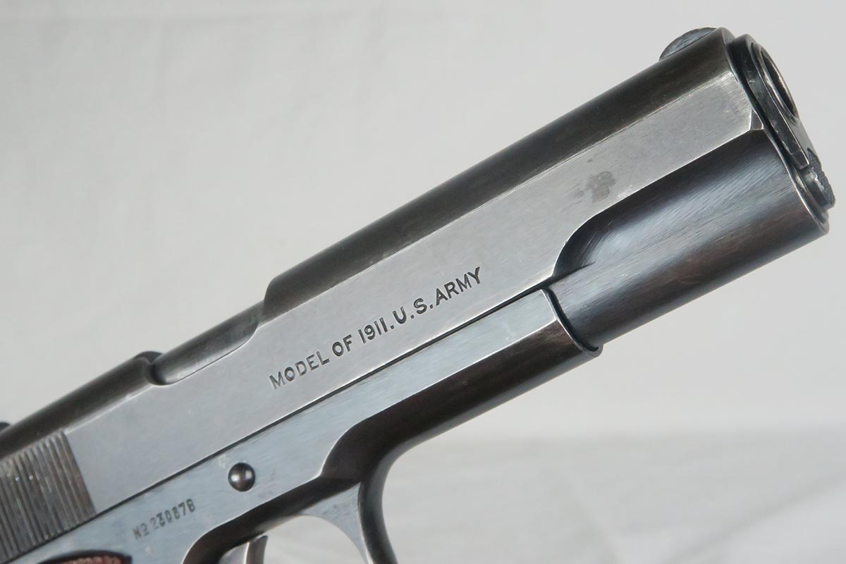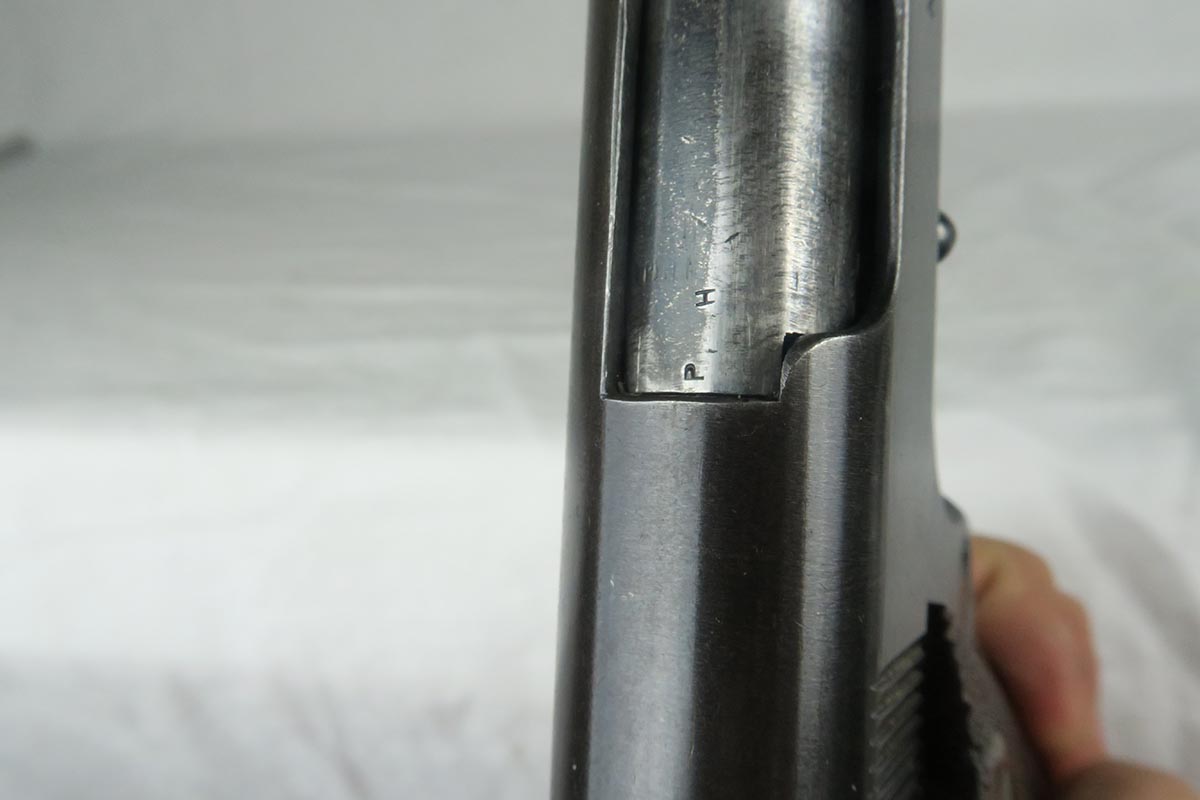 11/17/17 – This is an all original and correct Colt 1911 that was manufactured in 1918. Bluing rates at 85-90% with a nice slide but notable thinning on the straps. Correct H P barrel. Excellent grips. Bore shows some corrosion throughout the grooves.