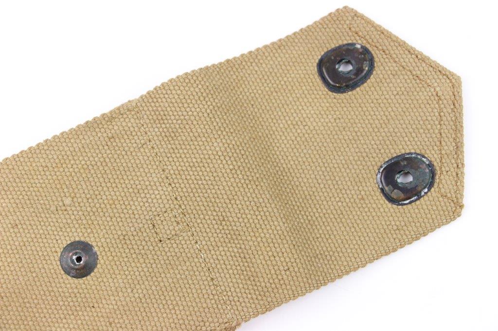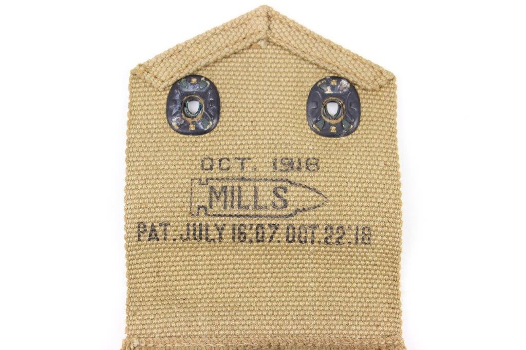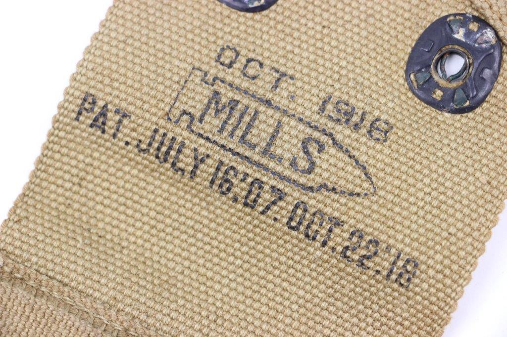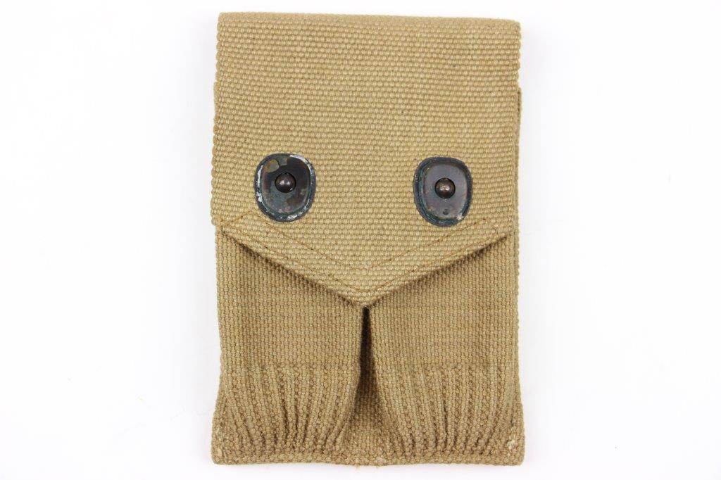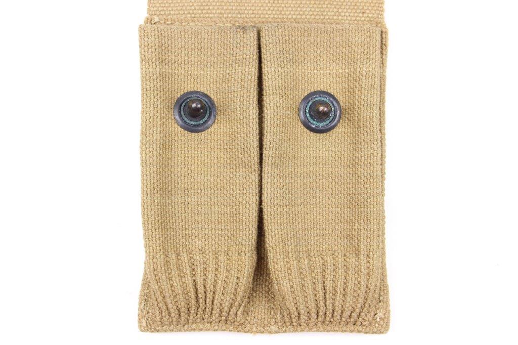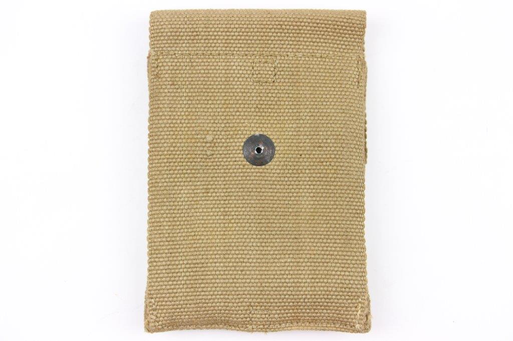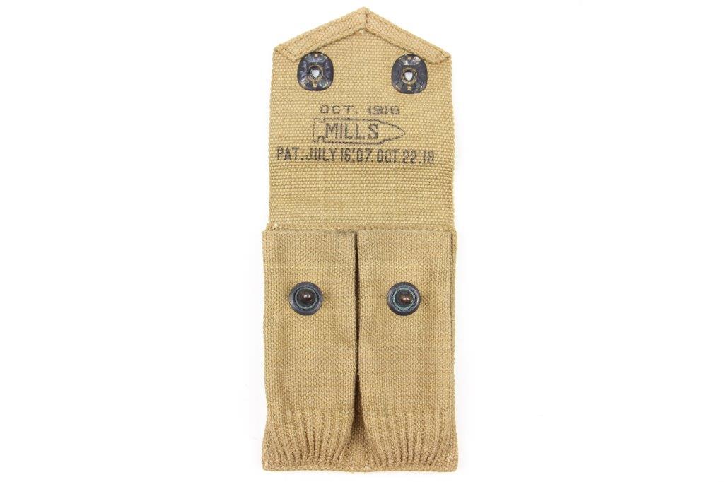4/17/24 – This is a WW1 production, US M1911 Colt dual magazine pouch. The pouch is in excellent overall condition with clean canvas that’s clearly marked on the interior with a maker stamp and date. The only wear is light surface patina on the metal fixtures. No rust or pitting. Excellent stitching.