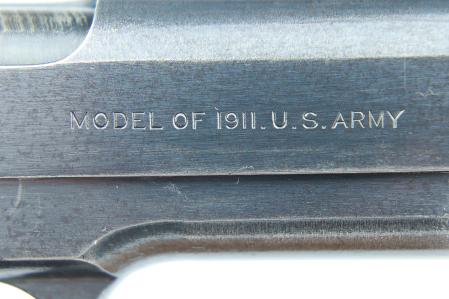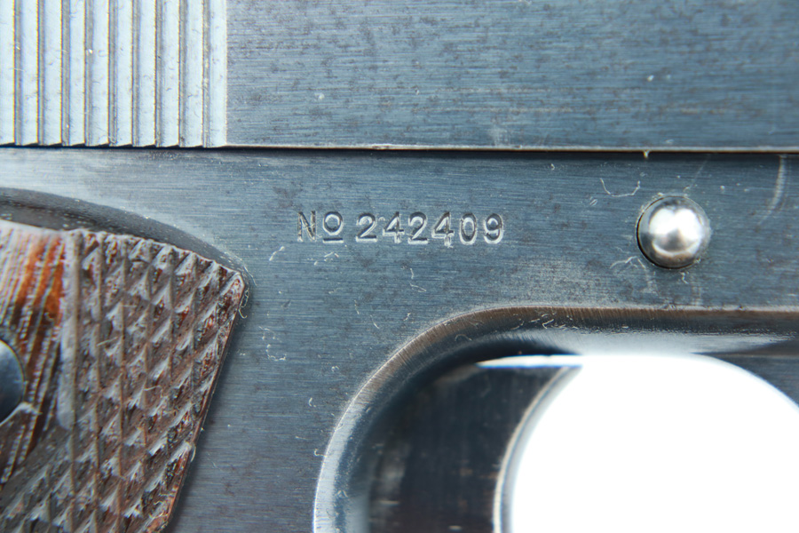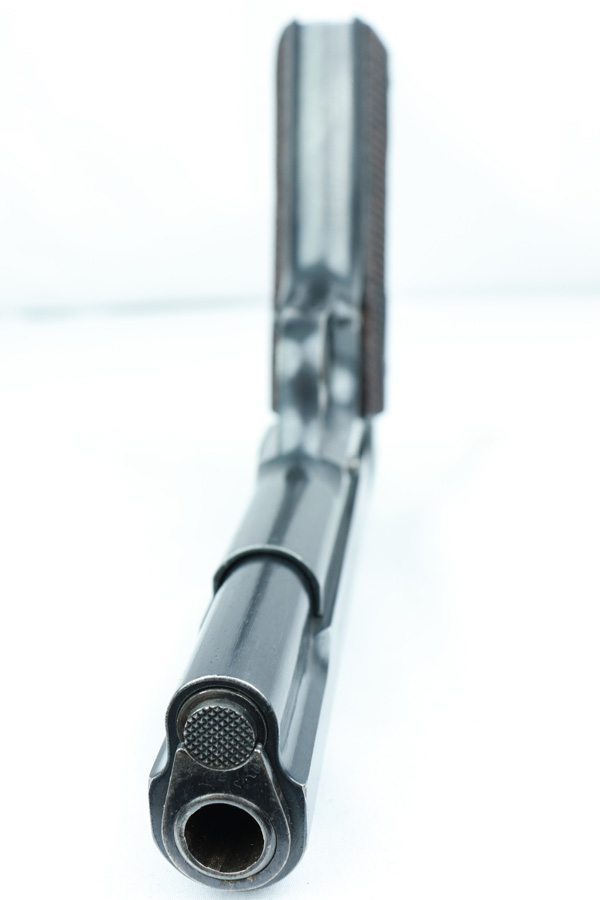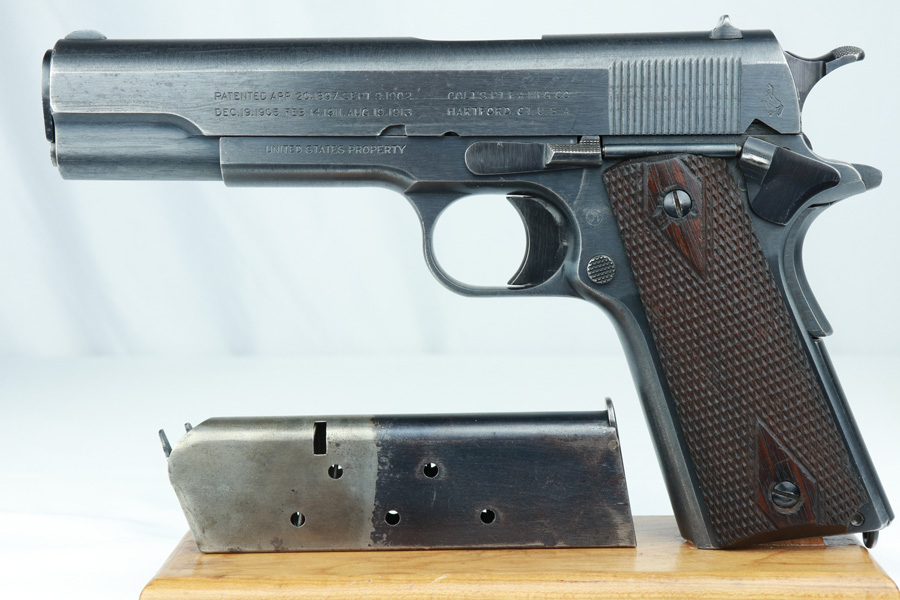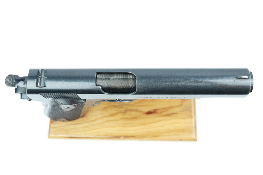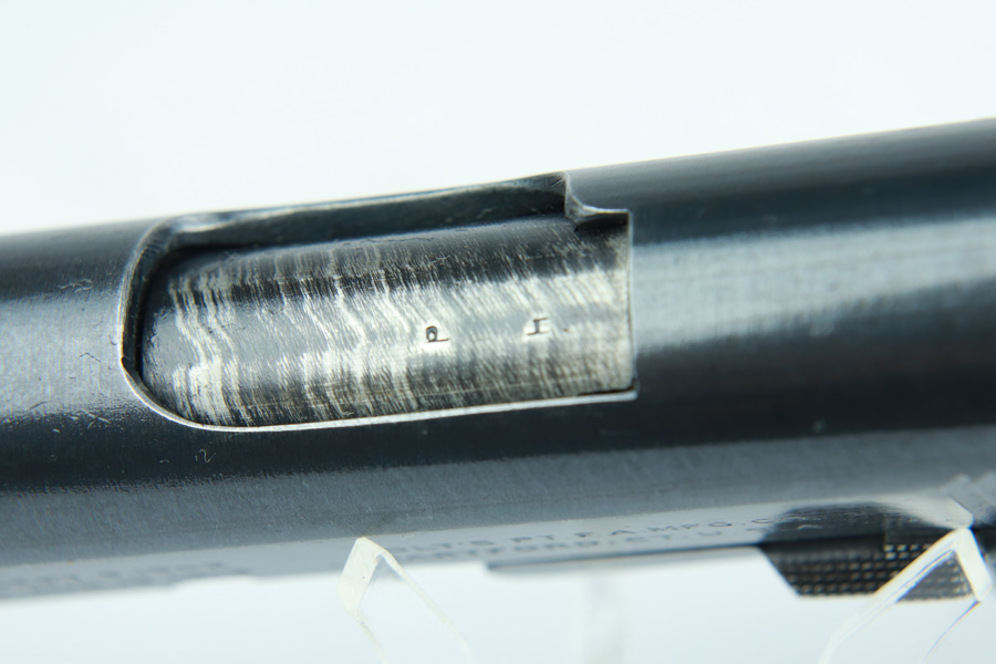 11/7/18 – This is a nice and original Colt M1911 from the end of the Great War. Made in 1918, this pistol is all correct and matching with 92-93% polished blue remaining. The front strap shows the majority of finish loss, though there is uniform edge wear and light patina on the slide. Proper ‘P H’ marked barrel. ‘H’ marked slide. Unmarked two-tone magazine. Bore shows minor frost but is otherwise in good shape.